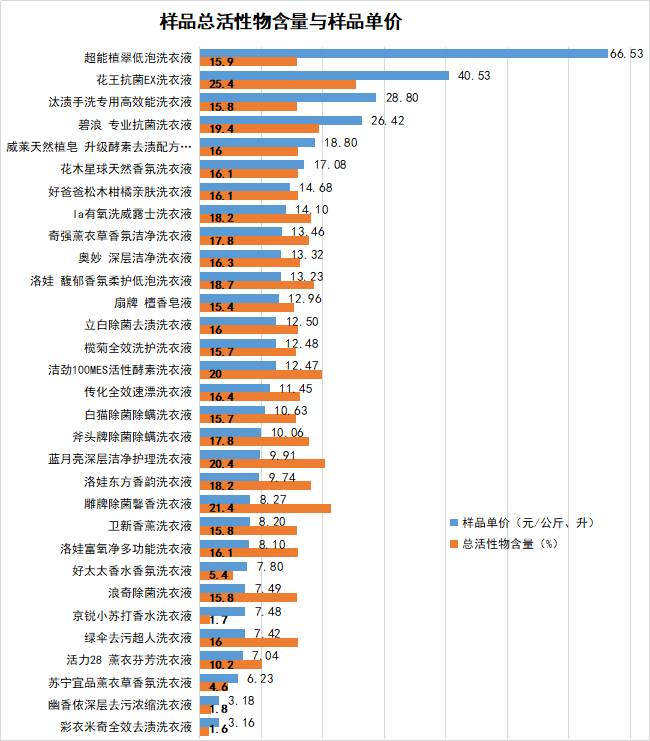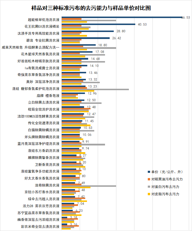 9月7日 中国消费者协会发布 31款洗衣液比较试验报告 涉及29个品牌 其中标称 “彩衣米奇全效去渍洗衣液” “京锐小苏打香水洗衣液” “幽香依深层去污洗衣液” 3款样品 经测试总活性物含量最低 各项去污能力明显较差 样品情况 31款样品中,除“花王抗菌EX洗衣液”样品标注产地为日本外,其他均为中国制造。 本次试验样品均为网购,样品每公斤或每升的售价最高为66.53元,最低为3.16元。 本次比较试验依据GB/T13174-2021《衣料用洗涤剂去污力及循环洗涤性能的测定》,去污值为与国家标准中标准洗衣液的对比值,标准污布为该标准中规定污布。 测试结果详情 1 洗衣液样品总活性物含量经测试差别较大,“彩衣米奇全效去渍洗衣液”等3款属低价低质产品 洗涤剂中总活性物含量直接关系着洗衣液的去污能力,也可反映出洗涤剂的成本情况及质量水平。一般来讲,总活性物含量越高的洗涤剂,去污效果越好,价格相对较高。 测试结果显示,样品中总活性物含量最高的为25.4%,最低的只有1.6%。31款样品中有25款总活性物含量高于15%(此数值为洗衣液行业推荐标准值)。 有3款洗衣液样品的总活性物含量低于2%,结合其去污力测试结果,属低价低质产品,分别为: 京锐小苏打香水洗衣液 幽香依深层去污洗衣液 彩衣米奇全效去渍洗衣液 2 对标准污布的去污能力方面,多数样品表现良好。活力28薰衣芬芳洗衣液”等4款样品相比明显较差 31款样品洗衣液对标准炭黑油污布和皮脂污布的去污能力随着样品单价的降低而降低,对蛋白污布的去污能力整体好于对其他两种污布的去污能力。 9款样品对蛋白污渍的去污能力表现突出,并且对其他两种污渍的去污效果也比较好,标称分别为: 洛娃馥郁香氛柔护低泡洗衣液 超能植翠低泡洗衣液 浪奇除菌洗衣液 威莱天然植皂升级酵素去渍配方洗衣液 好爸爸松木柑橘亲肤洗衣液 蓝月亮深层洁净护理洗衣液 花木星球天然香氛洗衣液 立白除菌去渍洗衣液 奥妙深层洁净洗衣液 4款样品对三种污布的去污能力相比明显较差: 彩衣米奇全效去渍洗衣液 幽香依深层去污洗衣液 活力28薰衣芬芳洗衣液 扇牌檀香皂液 3 样品对于辣椒酱、咖啡、菠菜汁等生活污渍的去除力高低不等 测试结果显示,31款洗衣液样品对辣椒酱、咖啡、菠菜汁三种污渍的清洗效果相比较,菠菜汁最好,辣椒酱次之,对咖啡污渍的清洗效果最差。比较而言,标称: “花王抗菌EX洗衣液”样品对辣椒酱的去污效果好; “活力28薰衣芬芳洗衣液”、“洛娃馥郁香氛柔护低泡洗衣液”、“白猫除菌除螨洗衣液”等3个样品对咖啡污渍的去除效果较好; 标称“蓝月亮深层洁净护理洗衣液”和“洛娃馥郁香氛柔护低泡洗衣液”对菠菜汁的去除效果比较突出。 4 部分产品执行标准偏低 通过查看,31款洗衣液样品外包装标签上明示的产品执行标准有两类,一类执行行业推荐性标准QB/T1224,占比48%;另一类执行企业标准Q/×××。 由于洗衣液产品没有强制性国家标准,某些企业在制定企业标准中,降低了总活性物含量和去污力的要求。在国家行政监督抽查中,虽然参照其企业标准判定为合格产品,但其总活性物含量偏低,去污力远不如执行行业推荐标准的合格产品。这就是市场上消费者购买到的洗衣液去污性能参差不齐的原因。这些执行标准低去污力低的洗衣液,一般情况下价格都非常便宜。 消费者选购、使用请注意↓ 01 选购时,看标签 在挑选购买洗衣液时,消费者要尽量在正规商超或大型电商平台选择常见的知名品牌产品,瓶体光洁整齐,商标图案印刷清晰,标识明确,包括使用说明、执行标准、净含量、限用日期或生产日期等等,标注应当齐全。 一般浓缩洗衣液的活性物质含量较高,使用时用量也相对较少,选择浓缩洗衣液也可以在一定程度上节约水电,保护环境,减少废水的排放。 为保证洗衣效果,谨慎购买价格明显偏低的产品。 02 贮存时,注意避光 一次性大量购买洗衣液时,应注意将洗衣液贮存在阴凉避光的地方。如果洗衣液中有活性酶成分,那么光照或高温环境都会使酶活性降低,影响去污能力。 一般洗衣液的保质期为三年,因此还应注意洗衣液上标注的限用日期或生产日期,避免过量囤货。 03 使用时,用量并非越多越好 第一,注意用量。消费者应按照产品标签说明的建议用量进行添加,并非用量越多越好、泡沫越多洗得越干净。因为过量的洗衣液会使衣物难以漂洗干净,而过度漂洗会造成水资源的浪费及衣物损坏。 第二,尽量使用温水进行洗涤和漂洗。水温过低或过高都会造成洗涤剂活性成分降低。 第三,洗前加入洗衣液,用温水适当的浸泡一段时间,也有助于污渍的去除。 第四,如果进行手洗,建议使用手洗专用洗衣液,或配戴手套。 第五,衣物消毒剂尽量不要与洗衣液同时添加,避免造成消毒液失效,达不到消毒效果。 查看“31款洗衣液比较试验报告”详情 中国消费者报新媒体编辑部出品 记者/任震宇 编辑/裴莹 监制/何永鹏任震宇