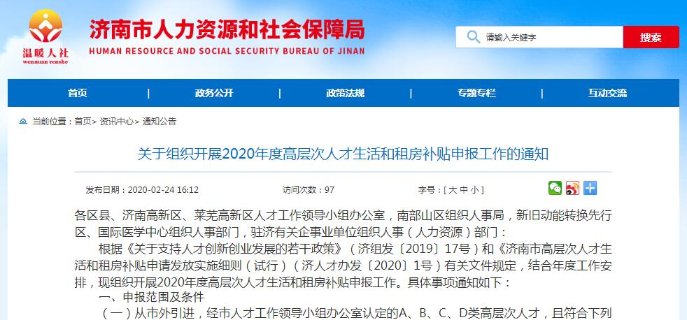 齐鲁网·闪电新闻2月24记者从济南市人力资源和社会保障局官网获悉,根据《关于支持人才创新创业发展的若干政策》(济组发〔2019〕17号)和《济南市高层次人才生活和租房补贴申请发放实施细则(试行)(济人才办发〔2020〕1号)有关文件规定,结合年度工作安排,济南市人社局于2月24日发布《关于组织开展2020年度高层次人才生活和租房补贴申报工作的通知》,组织开展2020年度高层次人才生活和租房补贴申报工作。 据了解,2020年度高层次人才生活和租房补贴申报范围及条件需满足以下几点: (一)从市外引进,经市人才工作领导小组办公室认定的A、B、C、D类高层次人才,且符合下列条件:1.人才家庭在济无自有住房;2.在济实际租房居住。 其中,人才家庭自有住房是指:拥有合法产权的住房;承租的公有住房;已办理网签备案的住房;已签订拆迁安置协议但未回迁的住房;已参加房改审批但未登记确权的住房;已转移或享受货币拆迁政策未满3年的住房;其他实际取得的住房。 (二)驻济高校新引进的全球TOP200高校院所毕业的博士研究生; (三)驻济科研院所、医疗机构和市属及各区(含代管镇、街道的功能区管理机构)县事业单位新引进的全日制博士研究生; (四)企业新引进的全日制博士、硕士研究生。 同时以上(二)、(三)、(四)类人才应符合下列条件: 1.毕业时间为2017年1月1日后(国内院校毕业以毕业证、学位证取得时间为准,国外院校毕业以办理学历认证时间为准); 2.与用人单位签订3年及以上劳动合同(聘用合同),并正常缴纳社会保险。 本通知所称企业是指济南行政区域内依法注册并纳税的各类企业及经济和社会中介组织。全球TOP200高校院所是指参照国际公认的QS、TimesHigherEducation、USNews三大世界大学排名体系评选的全球前200名高校院所。 需要注意的是,已在本市范围内享受人才公寓、购房安居补贴的人才,已享受泉城重点产业紧缺人才计划、企业新引进研究生租房和生活补贴政策支持的人才,已获得原莱芜市博士、硕士研究生生活补助的人才,不再纳入申报范围。 网上申报工作将通过中国济南人才网()“高层次人才生活和租房补贴申报系统”进行。由用人单位进行网上注册,注册完成后为人才开通个人申报账号和权限。人才登录后按系统要求填写个人信息,上传相关材料的原件扫描件,并提交至用人单位。其中第(一)类人才需上传房屋租赁合同;第(二)、(三)、(四)类人才需上传身份证及国内毕业证、学位证、《教育部学籍在线验证报告》或教育部出具的《国(境)外学历学位认证书》。 用人单位审核后,按照属地原则提交至区县人力资源社会保障局审核。审核通过后,经区县人才工作领导小组办公室复审同意,提交至市人力资源社会保障局终审。《通知》规定各用人单位须于4月20日下午5时前,完成网上平台申报提交,逾期系统自动关闭,不再受理申报。 此外,《通知》强调建立诚信档案制度,对曾因造假等行为被取消资格的人才、企业,取消或限制其申报资格;对弄虚作假冒领或者套取补贴的单位和个人,一经查实,追缴所发资金,并列入人才黑名单,5年内不再受理该单位和个人各类人才项目计划的申报;涉嫌犯罪的,依法移送司法机关处理。 附: 联系电话:(政策咨询9:00-17:00) 联系人:崔晓飞、宋堃、于飞 技术支持:高硕 联系邮箱:jnrcfwjggfwc@ 四、济南市各区县咨询电话 市中区电话: 槐荫区电话: 历下区电话: 天桥区电话: 历城区电话: 高新区电话: 长清区电话: 章丘区电话: 平阴县电话: 济阳区电话: 商河县电话: 南山区电话: 先行区电话: 国际医学中心电话: 莱芜区电话: 钢城区电话: 莱芜高新区电话: 闪电新闻记者刘少君报道