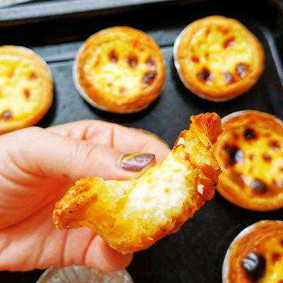 这个是方子我自己用了很多年的经典葡式蛋挞配方,也不知道出自哪里了,味道非常非常的好,做法也很简单,今天来分享给大家。关于蛋挞皮,我上次写的巧克力蛋挞时就说过,做法真的是很磨人,而且夏天做起来也不太方便,那就直接买成品吧。至于买什么蛋挞皮,这里还是给大家啰嗦几句,免得大家又要去翻以前的帖子:比较推荐安特鲁七哥和俏侬的,这是我比较喜欢的两个品牌。展艺、西厨贝可和汇京泽这三个品牌不太推荐,至于为什么,吃过就知道,不相信的自己试试看就明白了,对于展艺的可能有些争议,有朋友说还行,我自己是觉着口感太油腻了点,而且还不够酥脆。 By水之眸 蛋挞皮9个 全脂纯牛奶80g 淡奶油110g 细砂糖40g 鸡蛋蛋黄两个(重约32g) 炼乳10g 1、取出9个蛋挞皮,放在烤盘上常温化冻。 2、在碗里放入110g淡奶油、80g全脂纯牛奶、40g细砂糖、2个鸡蛋的蛋黄(重约32g)、10g炼乳搅打均匀。(炼乳如果不放的话,奶味和甜度都会差一点儿) 3、将搅拌均匀的液体过滤。 4、过滤好的液体倒入蛋挞皮中,这个量刚好是九个蛋挞的量。(别人都说是倒8分满即可,我是喜欢倒得满满的,一口下去馅料足足的) 5、烤箱预热210℃烤22分钟即可。 6、一口下去,外皮酥脆,内馅超级嫩滑,太满足了! 再啰嗦一句,我做蛋挞就喜欢把蛋挞液倒得满满的,吃起来馅料足足的才够味,只喜欢倒七八分满的,那么你们就要准备十个蛋挞皮子了。 做菜好吃都有技巧,我的每道菜都有小妙招!