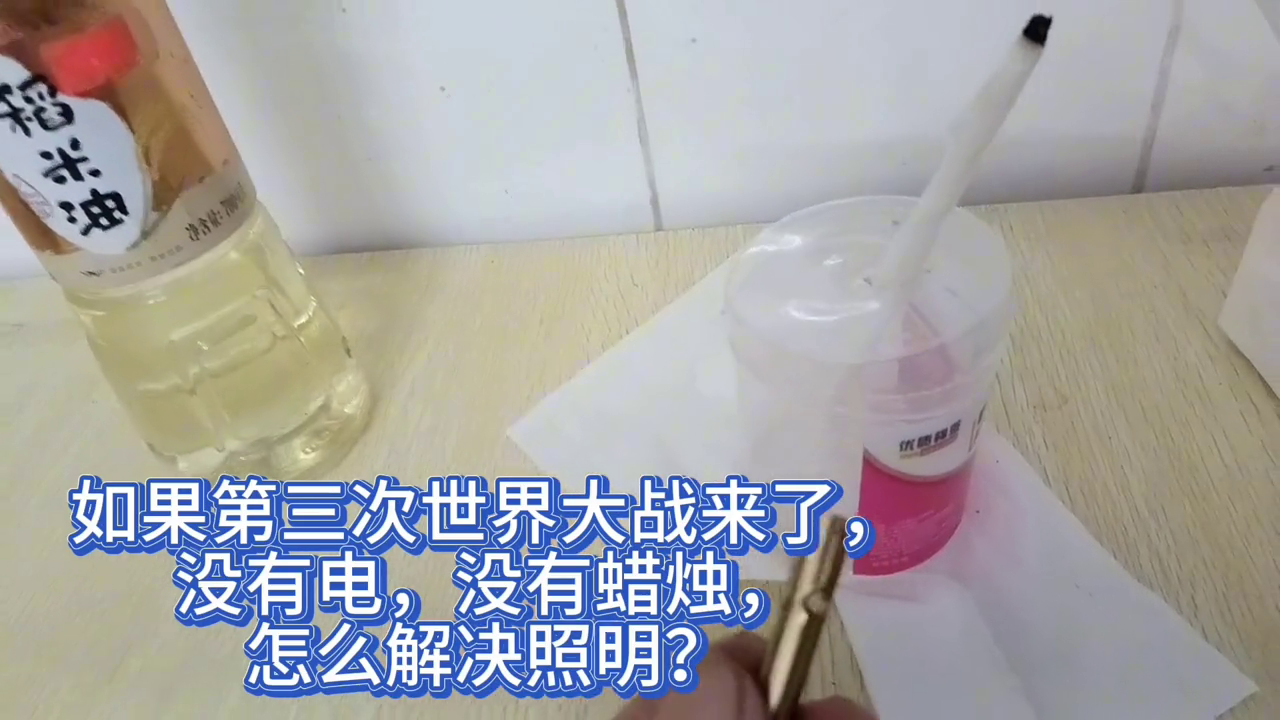 如果第三次世界大战来了,没有电、没有蜡烛怎么解决照明? 如果第三次世界大战来了,家里没有电也没有买蜡烛,照明怎么解决?大家不要慌,我给大家用一个小方法就能够解决这个问题。 ·大家看一下,家里都有食用油,无论是花生油、菜籽油,这些都可以做燃料。 ·另外就可以用纸巾来做一个可燃布,因为燃烧会产生热量,会融化很多东西,所以需要用铁皮来做一个铁管包,把它包住。 ·这个铁管像这种可以用剪刀把它剪成一个铁管,这里剪成空心的,把纸巾拧成条状,然后穿进这个孔里面。 ·另外纸、塑料杯这些到处都有,塑料瓶都有,可以用剪刀转一个小孔,转一个小孔就刚好把这个卡住在里面。 这基本上就算完成了,大家看一下效果,亮度还是可以的。如果需要亮一点的就把铁管弄大一点,这样就自制完成了一个照明工具。 补充一下刚才,纸巾就把它淋成这种状况,食用油就把它倒满,倒一部分在杯子里面,瓶子里面也算可以。再把纸巾在上面全部拿到里面去浸泡,浸泡了再用打火机点燃就可以了。