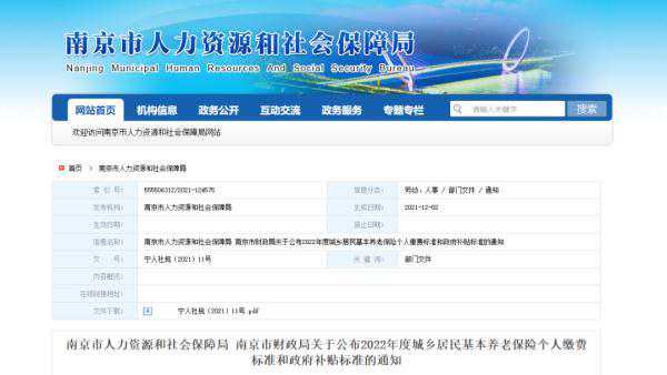 日前,南京市人力资源和社会保障局、南京市财政局发布关于公布2022年度城乡居民基本养老保险个人缴费标准和政府补贴标准的通知,详情如下: 南京市人力资源和社会保障局官网截图 各区(园区)人力资源和社会保障局、财政局,江北新区教育和社会保障局、财政局,浦口区社保中心: 根据上级精神和《市政府关于印发南京市城乡居民基本养老保险办法的通知》(宁政规字〔2015〕5号)、《关于建立健全我市城乡居民基本养老保险待遇确定和基础养老金正常调整机制的通知》(宁人社〔2019〕136号)等文件规定,报经市政府同意,现就我市2022年度城乡居民基本养老保险个人缴费标准等事项通知如下: 一、个人缴费标准 参保人员的个人年缴费标准统一设置为1560元、1800元、2280元、2760元四个档次,由个人自主选择标准缴费。 二、政府补贴标准 对当年参保缴费人员的政府补贴标准按个人选择缴费档次标准的10%确定。 本通知自2022年1月1日起执行。