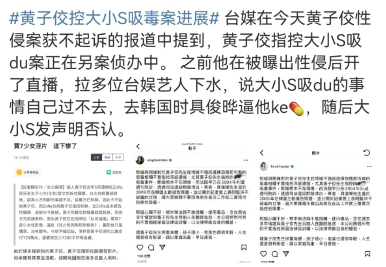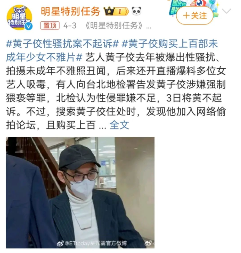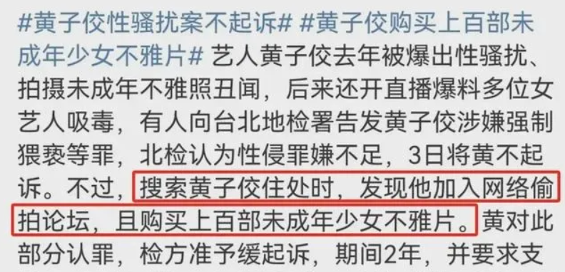 这大小S交的,都是些什么驴马烂子男友啊? 关于大小S的事儿,很多粉丝都听烦了, 每次发,都告诉尸哥: 写的很好,不要再写了。 但这次真不是写她俩哈! 虽然说有点点点关系,但完全不搭噶。 黄子佼,大家都知道吧? 如果说不认识,看过他的照片你肯定也会面熟。 黄子佼是湾湾很知名的主持人,主持过湾湾以及大陆很多档节目。 家喻户晓这4个字用在他身上,也丝毫不过分。 就是这样一个荧屏偶像,娱乐圈的知名人物, 最近却被曝出是个“恋童癖”, 欲望上来了,就拿出来欣赏一番。 这件事儿之所以被曝光, 还是因为去年黄子佼性侵少女案,这两天有了新进展。 虽然因证据不足, 且黄子佼与女孩已经和解,案子结了。 但在调查的过程中, 警方搜索黄子佼的住处时, 均是黄子佼在某偷拍论坛中,花钱购买的。 这个论坛他2013年就注册了, 从2017年开始,黄子佼陆续购买了上百部影片用来观赏。 对此,黄子佼也是供认不讳, 并接受了约27万RMB的罚款,以及1200字的悔过书。 真的是知人知面不知心啊, 表面看起来端端正正,背地里禽兽不如, 买片儿就买片儿,还专买未成年的.. 想必黄子佼性侵案, 他也是花了不少钱,被他性侵的女孩才肯和解, 不然他亲口承认的事儿, 湾湾的检方怎么就不起诉了呢?! 要知道他当时可不止猥亵性侵啊, 还拍女孩的裸照.. 整个一变态怪蜀黍。 其实从黄子佼以往交过的女朋友, 以及现任老婆就可以看出,这小子心术不正。 所有女朋友都要比他小十几岁,或者有着一张娃娃脸, 现在的老婆更是比他小了整整20岁! 已经有那么年轻的老婆了, 还性侵女孩,又看未成年片儿的, 真的是烂人一个啊 黄子佼既往的女朋友中,还有小S! 情窦初开的小S,当年也是个职场新萌。 出于对偶像前辈及合作伙伴的崇拜,轻而易举的就被黄子佼拿下了。 要不是后来曾宝仪搅合了进来, 没准黄子佼和小S会结婚也说不定! 毕竟当年二人特别纯爱, 黄子佼还曾把小S的名字,纹在了手臂上.. 不过, 去年黄子佼被指控强吻猥亵17岁女孩,并拍裸照, 在他直播承认并道歉后, 居然顺手把曾经的女友小S给举报了.. 这就很迷。 直播的尾声, 黄子佼居然在直播间举报,大小S吸D.. 还说自己去韩国,大S的现任丈夫具俊华逼他嗑药。 难道这就是,爱之深责之切? 不过在直播风波过后, 有媒体曝出黄子佼的精神状态不太好, 甚至还想拿刀自杀, 幸好被及时发现,才避免了一场悲剧的发生。 整个事件里, 最可怜的,应该就是黄子佼现任妻子孟耿如了吧?! 已经为人母的她, 不仅要接受丈夫是猥亵犯、恋童癖、自己被绿的事实, 凡事发生, 她还要替黄子佼站出来回应各路媒体, 替黄子佼解释。 女儿都已经2岁了, 黄子佼还在那猥亵少女,买未成年片儿看, 等孩子长大, 真不知道黄子佼他还有什么脸,面对自己的女儿。 他真的是. 曾经有多辉煌,如今就有多不堪。 希望这样的烂人,就别回娱乐圈了。 就这样被舆论鞭尸一辈子,然后彻底的消失在大众的眼前吧。
