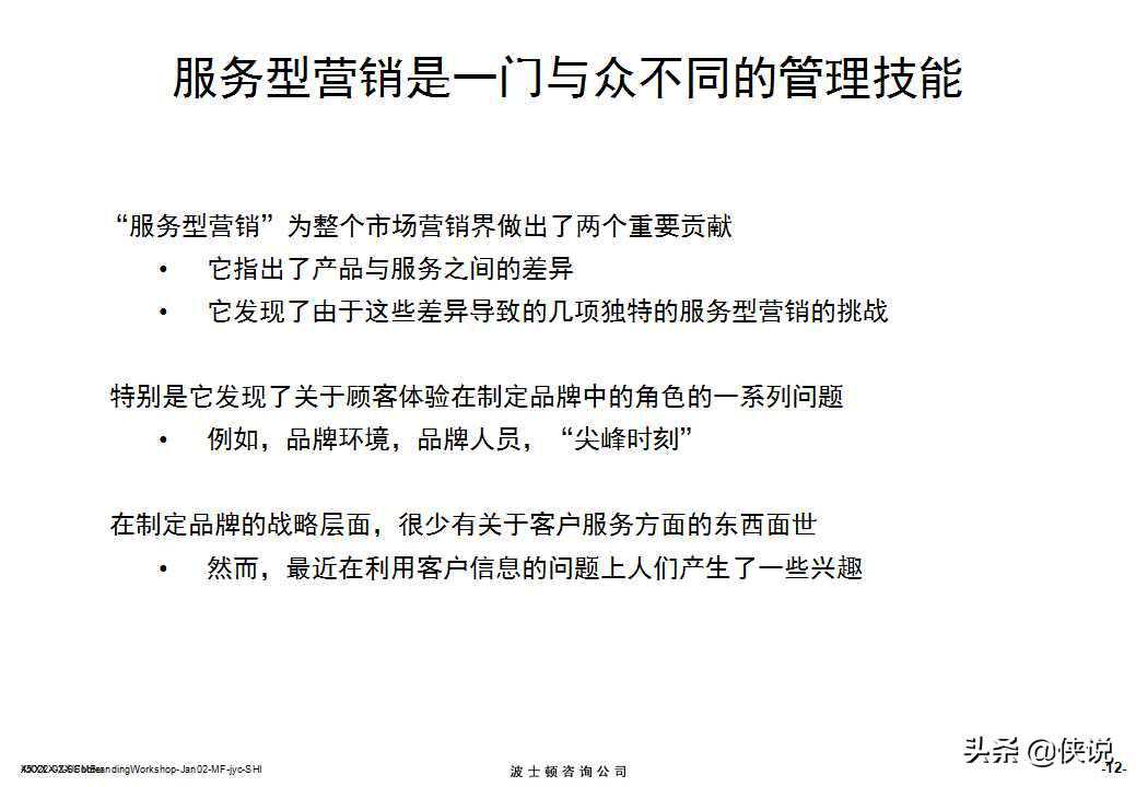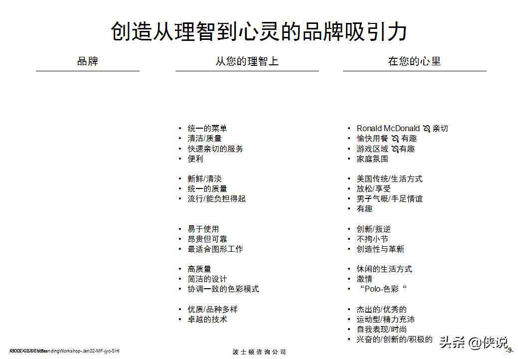 几乎每个人都容易犯的一个错误:屁股决定脑袋。于是几年前我换了个凳子。 从乙方回到甲方的三年多时间里,最大的变化或许是:换了一个视角看待问题。广告人往往在思考用广告解决问题,而品牌人在试图用一切方法解决问题。那么我先把近年的一些困惑以及思考写下来,欢迎一起探讨,或许也正是你的困惑。 一个现象是,现在的甲方越来越不敢花钱做品牌了,尤其是纯品牌(不带效果的那种)。 疫情是一个原因,生存都是个问题,为什么要砸钱去做短期看不到收益的事情。 而事实是,即便没有疫情,要不要做品牌这件事,也受到了很多公司决策层极大的挑战。即便是如麦当劳、联合利华等大公司都在考虑CMO这一职位是否有必要。 这件事关系到整个行业链条中许多人的切身利益和发展方向,毕竟品牌预算多半是给了广告公司。 本文太侠分享一份波士顿咨询出品:品牌培训,部分内容如下: 下载完整版报告请【私信】,回复关键词【下载】,获取下载方法~数千份互联网、房地产、金融、金融科技、人工智能、市场运营、教育出行等等报告推送,坚持不易!