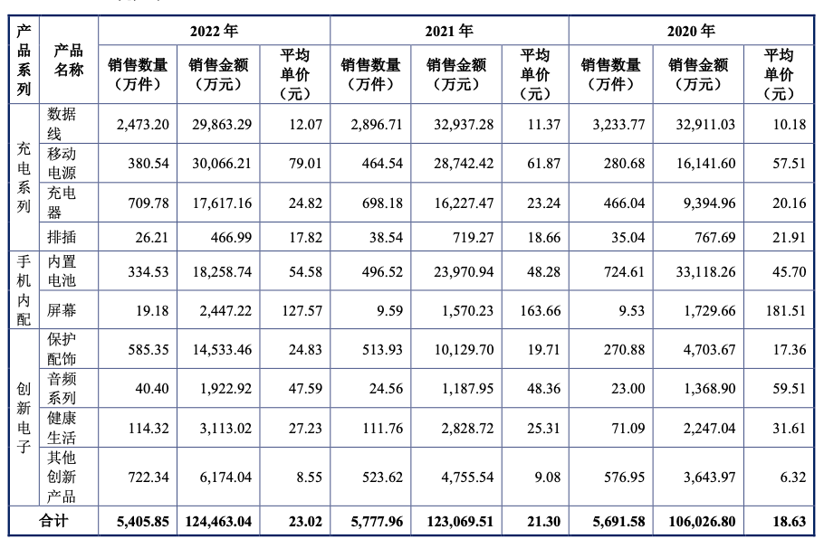 《招股书》显示,品胜电子数据线的平均单价为10元左右,充电器为20元左右,内置电池为50元左右。相较品牌原装动辄上百的价格,具有明显价格优势。其中数据线2022年一年便售出2473.2万件,三年达到8603.68万件。