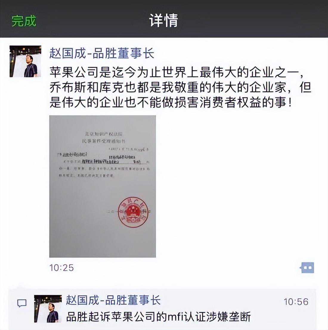 2017年8月,品胜电子的董事长赵国成在朋友圈发文表示,苹果公司是迄今为止世界上最伟大的企业之一,乔布斯和库克也都是他敬重的伟大的企业家,但是伟大的企业不能做损害消费者权益的事。并配图一张立案受理通知书,内容为品胜电子起诉苹果MFI(“MadeforiOS”)认证涉嫌垄断,并索赔1元。
