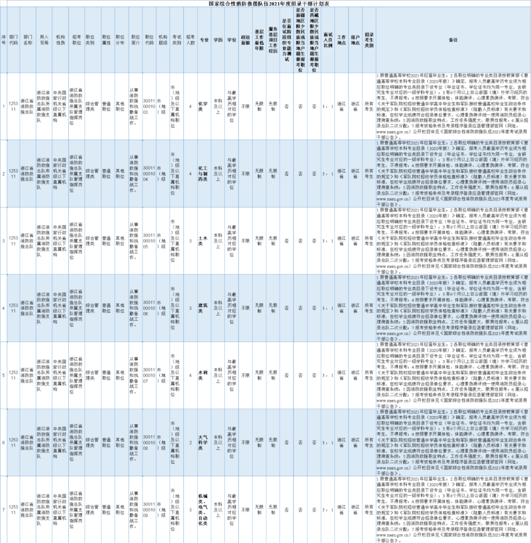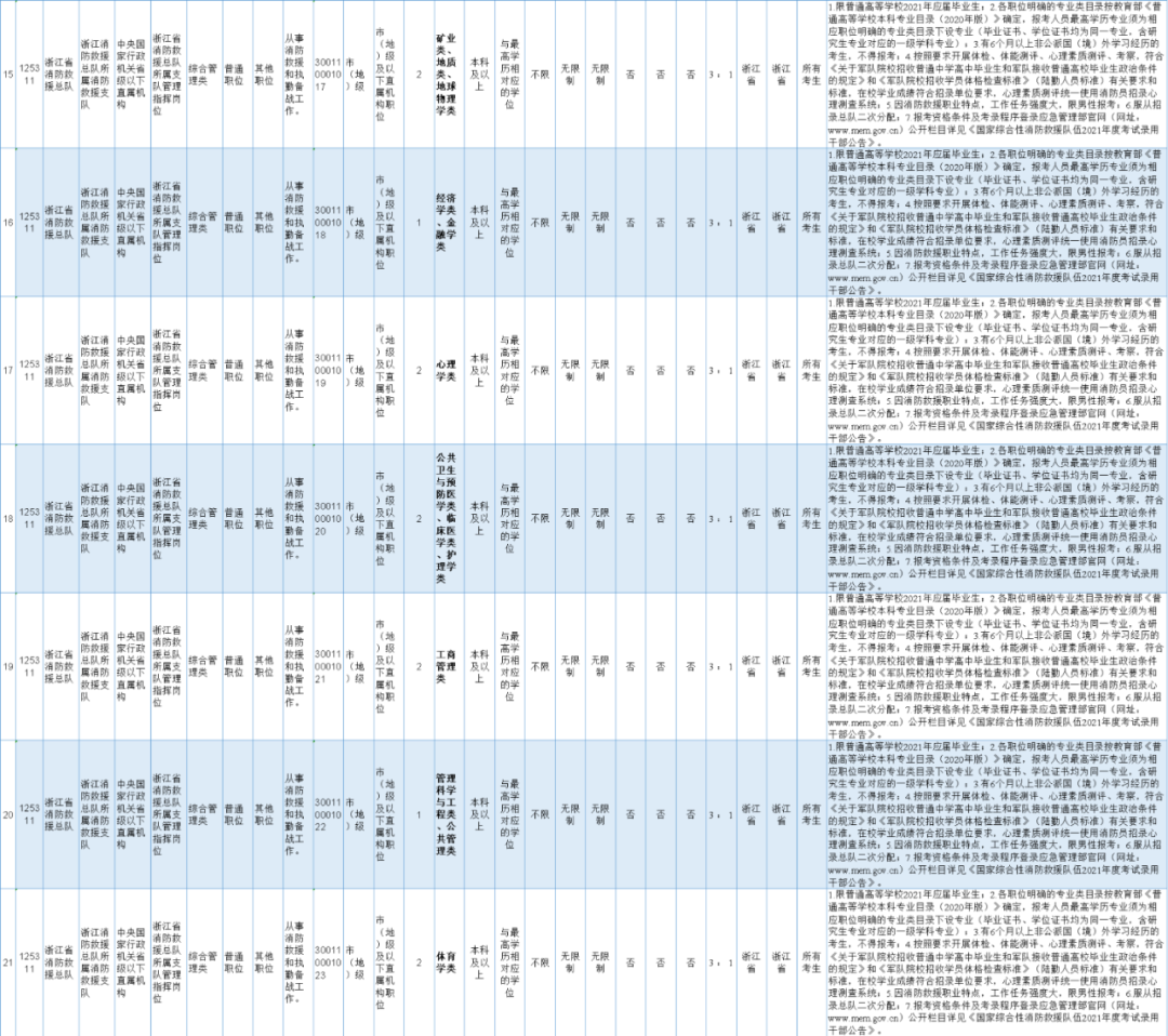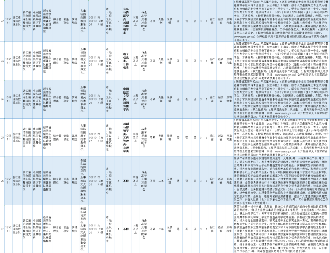 最新招聘来了 这次真的不一样 有些岗位还有编制 国家综合性消防救援队伍 2021年度招录干部公告 应急管理部近日发布公告 国家综合性消防救援队伍 2021年度招录干部3000名 据国家应急管理部网站,国家综合性消防救援队伍2021年度招录干部3000名。其中:面向普通高校应届毕业生招录2700名,面向军队服役5年(含)以上高校毕业生退役士兵招录100名,面向具有消防救援实战经验大学生消防员招录200名。 2020年10月15日8:00至10月24日18:00报名。 有适合你的岗位吗 来看浙江招录岗位表 ↓↓↓ 经培训考核合格的,按照有关规定办理任职手续,纳入国家行政编制,实行公务员管理制度。新任职人员在国家综合性消防救援队伍大队级(含)以下单位工作不少于5年,其中在消防救援站(中队)岗位工作时限不少于3年(女性除外)。 嘉睿人力招聘启事 (派遣至海宁经济开发区(海昌街道)) 因工作需要,现面向社会公开招聘工作人员2名,由海宁市嘉睿人力资源服务有限公司负责招聘,并采用劳务派遣的方式派遣至海宁经济开发区(海昌街道),有关招聘事项公告如下: 01 招聘岗位 招商员1名 政务服务中心工作人员1名 02 报名时间、方式 1.报名时间 2020年10月20日-2020年10月27日下午4:30。 2.报名方式 网络报名报名网址:(在线填写报名表,上传报名资料,显示已初审待复审,即报名成功) 请随时查看审核状态,以防无效报名! 审核未通过人员,须在报名时限内按系统提示及时修改、提交信息,重新接受审核,否则为无效报名! 联系方式:87289093/(微信同步) 03 招聘条件 1.有较好的思想政治素质,身体健康,品行端正,勤奋敬业,作风严谨,吃苦耐劳。 2.热爱本职工作,善于沟通交流,有较好的语言表达能力和文字综合能力; 3.浙江海宁户籍或浙江海宁籍贯,年龄35周岁以下; 4.全日制本科及以上学历。 04 招聘办法 1.资格审查。应聘人员凭本人身份证、户口簿、学历证书或证明、资格证书等电子文件进行网络报名(各类电子文件必须清晰)。报名者须提供近期一寸照片一张,并填写《海宁市嘉睿人力资源服务有限公司派遣工招聘报名表》。 有下列情形之一者不受理报名:1.受过刑事处罚的;2.处于党纪、政纪处分所规定的使用限制期内的;3.涉嫌违纪违法正在接受有关专门机关审查尚未作出结论的;4.其他不宜应聘的。 2.招聘方式。从初审合格简历中,筛选后直接面试。 聘用后与海宁市嘉睿人力资源服务有限公司签订劳务派遣合同,并实行试用期制度,试用期满后经考核不合格的解除劳动合同。 招聘启事 (派遣至海宁市博远学校盐仓校区) 小学语文代课老师1名 2020年10月20日-2020年10月27日 2.报名方式 网络报名、现场报名 3.报名地址 海宁市海洲街道管泾港路11号,海宁市实业人力资源咨询有限公司 联系方式: 2.全日制大专; 3.40周岁以下,户籍不限; 4.有学校或培训机构代课经历,如有教师资格证、有从事相关教学经历优先考虑。 1.资格审查。应聘人员凭本人身份证、户口簿、学历证书或证明、资格证书等资料进行现场报名。报名者须提供近期一寸照片一张,并填写《海宁市实业人力资源咨询有限公司派遣工招聘报名表》。 聘用后与海宁市实业人力资源咨询有限公司签订劳务派遣合同,并实行试用期制度,试用期满后经考核不合格的解除劳动合同。 上述派遣工体检和聘用等事项可到海宁市人才网查看详情。 心动就赶紧行动 找工作就是拼速度 没有合适的岗位也不用着急 有好岗位报姐时刻发布哦 祝大家成功