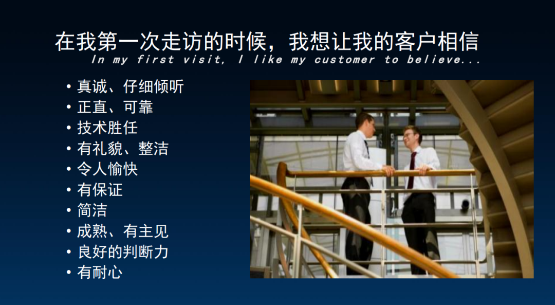 你在跟客户打交道的时候,包括站姿都能体会到你是不是正直可靠。