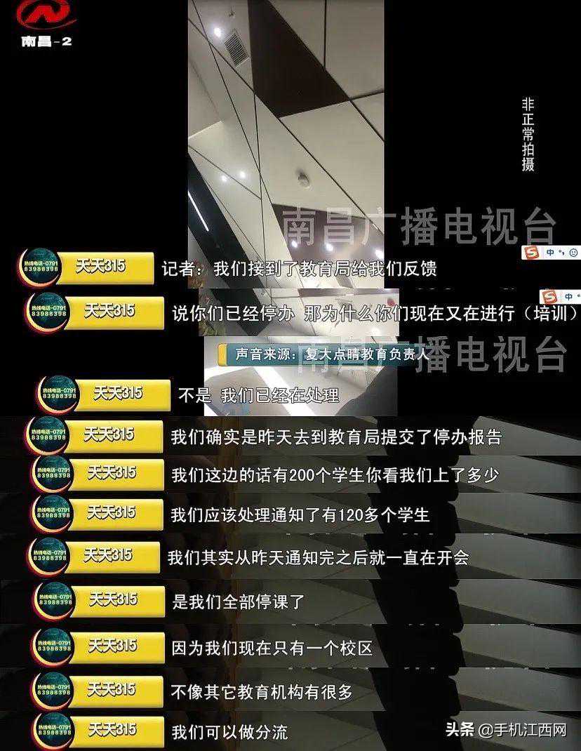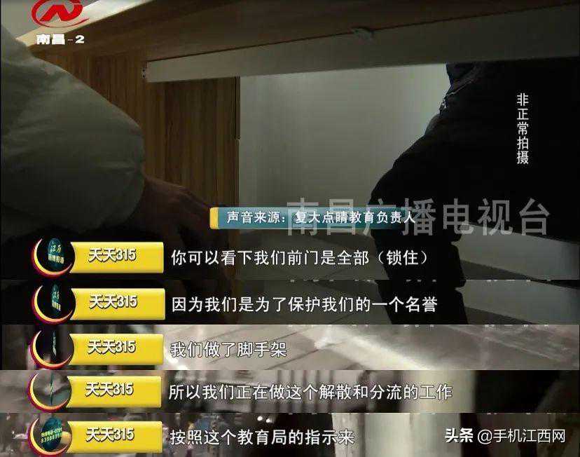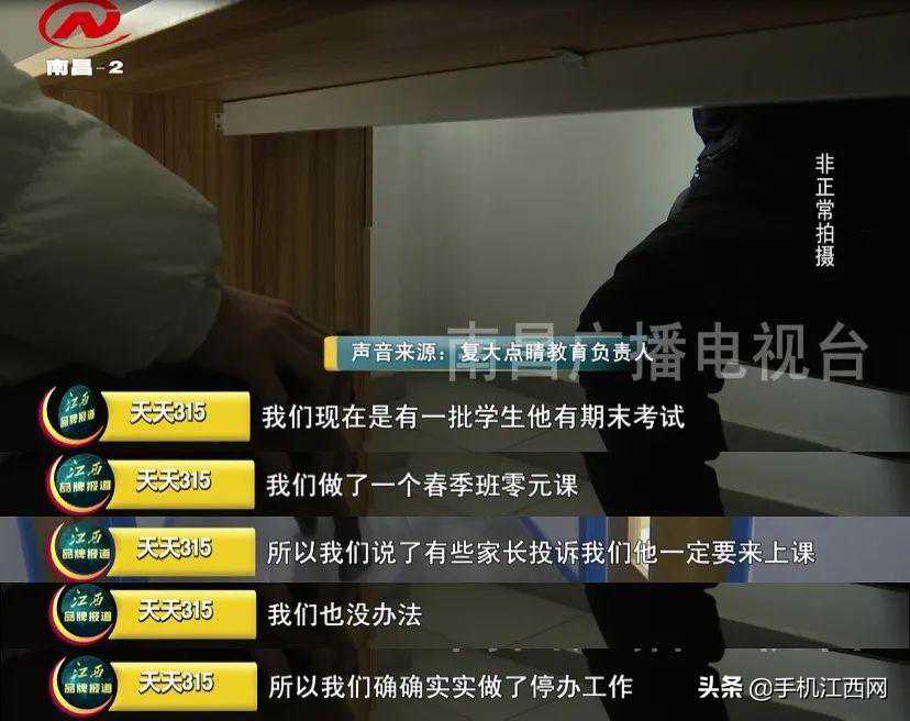 前几天我们节目报道了位于东湖区胜利路333号的复大点睛教育违规办学,并将其违规情况反映给了辖区教育主管部门和市场主管部门,1月26日,东湖区教科体局对其下发了停办通知书。1月27日,记者再次前往复大点睛调查。 现场记者看到,复大点睛的大门已经关闭,室内用脚手架抵住了大门。俨然一副已经停办的样子。可五分钟后,门口出现了一名等待上课的学生。等待了一段时间后,一名女子来到门口将学生带走,并将其带进了一个小巷子里。 记者跟随该女子的步伐,发现这竟然是复大点睛的后门,并发现还有不少学生正在上课。 明明东湖区教科体局已经向复大点睛下达了停办通知书,并且复大点睛也提交了停止办学的报告,为何该无证机构却阳奉阴违依旧违规办学? 在复大点睛的停办报告上,写有深刻认识到无证经营的危害性,并坚决服从教体局的安排。但被记者发现仍然在进行无证办学后,其负责人竟然打起来感情牌,表示这一切都是不得已而为之。 对于大门紧锁,背地里却暗自从后门引导学生来进行培训,复大点睛教育的负责人声称这一切都是为了保护企业名誉。 现场,记者再次对其无证办学提出疑问,复大点睛负责人表示其一直在走流程进行办证。 天天315 明明已经提交了停止办学的报告,实际上却阳奉阴违,背地里又偷偷在进行培训教学,如此行径,究竟是复大点睛负责人所说的为了孩子的学习着想,还是贪图眼前的利益?这种对职能部门的三令五申置若罔闻、明目张胆的违法行为,本栏目也将一追到底。