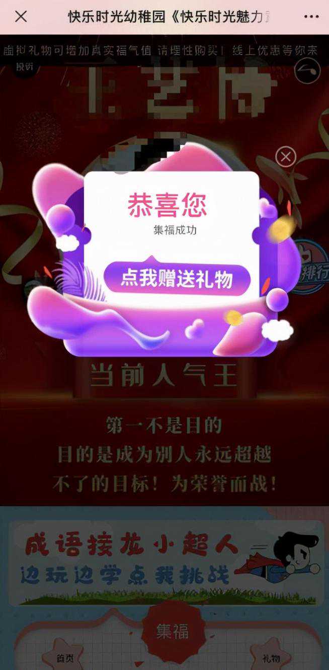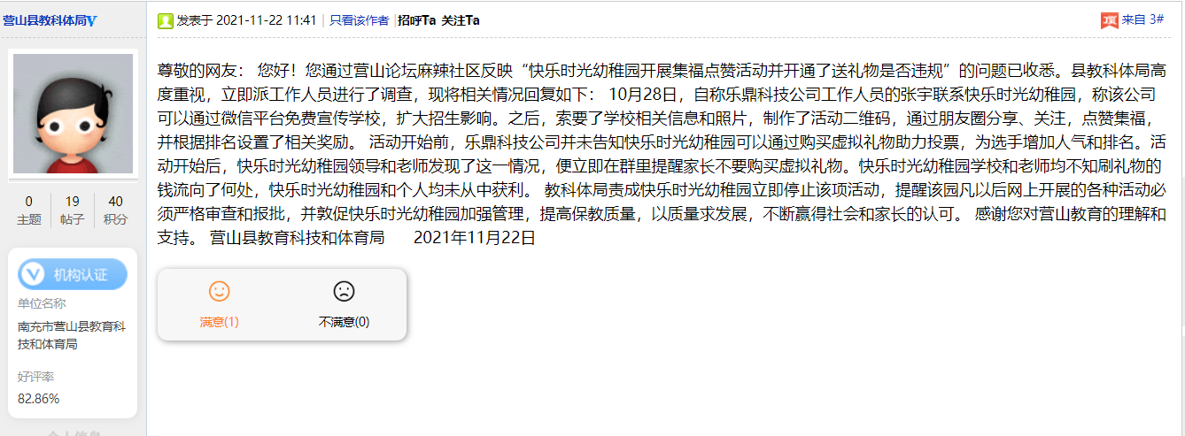 近日,一位南充网民在麻辣社区上发帖,反映营山快乐时光幼稚园开展“魅力童星竞选”活动,并开通了“购买虚拟礼物助力投票”的功能,该网民质疑这种操作“是否违规”?营山教科体局回应,该幼稚园并不知情,园领导和老师发现后立即提醒家长不要购买,教科体局也已责成该幼稚园停止该项活动。 “近日,朋友圈全是此幼儿园的点赞集福活动宣传,有免学费等奖品。”据该网民描述,营山快乐时光幼稚园在近日举办的“魅力童星”竞选活动中,其活动的微信链接开通了“购买虚拟礼物”功能,支持者可为竞选者“付费助力”。 “搞竞选活动其实没什么问题,但问题是搞活动开通了送礼物这个选项。”该网民吐糟,一开始还有很多礼物选项,但到后面就需要花钱,30个福要付费10元。 从帖文随文发布的图片来看,该活动奖项十分诱人,一等奖赠送“一学期学费(无门槛免学费免费学)+金诗雨扫地机器人+一等奖证书以及奖杯+学员形象代言人海报机构展示三个月”。而在人气排行榜中,位列第一的幼儿已经“集福”13311个。 发帖网民由此质疑这是否违规?是否属于变相让家长刷礼物引诱消费?并表示,很多家长和其亲人朋友都刷了大量礼物,“礼物所得金钱是否作为教育专用,还是纳入私人钱包”? 南充营山县教科体局收到网民反映的问题后,高度重视,立即派工作人员进行了调查,并于11月22日在麻辣社区上作出回应:幼儿园对于“付费助力”功能并不知情。 活动开始前,乐鼎科技公司并未告知快乐时光幼稚园可以通过购买虚拟礼物助力投票,为选手增加人气和排名。活动开始后,快乐时光幼稚园领导和老师发现了这一情况,便立即在群里提醒家长不要购买虚拟礼物。 对于刷礼物所得资金的流向,南充营山县教科体局在回应中表示,快乐时光幼稚园学校和老师均不知情,快乐时光幼稚园和个人均未从中获利。 针对该“魅力童星竞选”活动,教科体局已责成快乐时光幼稚园立即停止,并提醒该园凡以后网上开展的各种活动必须严格审查和报批,并敦促快乐时光幼稚园加强管理。