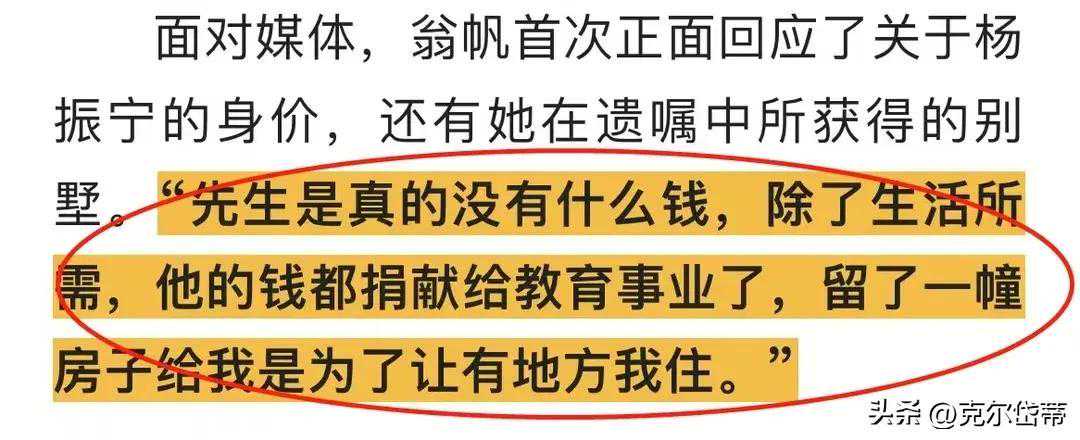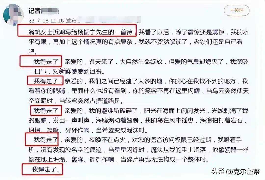 文/克尔岱蒂 以下网友们所有的感慨,都缘自翁帆女士写给丈夫杨振宁先生的一首小诗。但前提是,如果这首小诗是真的。 2004年,当28岁的翁帆与82岁的杨振宁先生,以整整相差54岁的年龄,决定结婚的时候,相信那时的翁帆,一定是做好了承受一切世俗非议的充分心理准备的。 只是,恐怕连翁帆自己都没有想到,她得花上20年的时间,来为当初的选择买单。 古诗里「君生我未生,我生君已老。君恨我生迟,我恨君生早。」对爱情的炽烈憧憬,终究还是没能抵过岁月风霜的磨砺残噬,在现实中被雾化了,化为翁帆笔下的一首的现代白话小诗「我要走了」。 翁帆把这首小诗写给杨振宁先生的时候,心里是何等的悲凉和无奈。在大多数人的眼里,这只不过是一段没有悬念的故事的结局罢了,大多数人并不意外,而且从一开始就猜到了所有的故事情节。 关于爱情,纵使像杨振宁先生这样高于常人的心智和身份,也终究逃不开跟普通人一样的剧情轮回。不同的是,杨振宁先生给予翁帆的,是数倍于普通人不会给也给不了的伤害和痛楚。 这一点,翁帆怕是只猜对了开头,却没猜对结尾,更没猜到结局会如此地惨烈。 其实,翁帆并不是一个普通人,普通女孩子不会选择爱一个比自己大54岁的男人,况且这个男人也同样不是一个普通人。普通的女孩子,是接触不到杨振宁先生这种泰斗级的科学家的。 所以,打从一开始就注定了,这是一段不可能普通的爱情。翁帆和杨振宁先生,都必须要去承受,几何倍数于不普通的压力和争议。但是很遗憾,翁帆率先失控了,最终没能绷住。 任何一段婚姻,幸福美满也好,反目成仇也罢,都不会只是一个人单方面的问题。那么问题来了,杨振宁先生到底做过了什么伤人的事情,才让翁帆写出这样凄楚、无奈和绝望的诗句来? 先来看看翁帆不久前写给杨振宁先生的那首诗: 我得走了,亲爱的,春天来了,大自然生命绽放,但爱的气息却熄灭了,我深吸一口气,对新鲜感感到沮丧。 我得走了,亲爱的,我们之间已经建了太多的墙,你的心在我找不到的地方,我看着你的眼睛,里面什么也没有看到,你的笑容不再在这里闪耀,当乌云突然使天空变暗时,当转弯突然占据道路时。 我得走了,亲爱的,我的避难所破碎了,阳光在海面上闪闪发光,光线刺痛了我的眼睛,发出一声叫声,海鸥扇动着翅膀,我的岛在风中摇曳,海浪拍打着岩石,坍塌、轰隆、呯呯作响,当希望变成泡沫时。 我得走了,亲爱的,夜晚不再点灯,对您的语音访问权限已经过期,我瞪着手机,没有发现您名字的痕迹,当星星闪烁时,魔法从我的手上滑落,他像瓷器一样倒在地上坍塌、轰隆、呯呯作响,当碎片再也无法构成一个整体时。 我得走了。 这首诗是一个记者7月18日在个人社交平台上发出来的。但是从翁帆的诗文里可以看出,这首诗是春天写的,也就是今年的年初,已经是翁帆半年前的心情写照了。 半年前,翁帆和杨振宁先生之间到底发生过什么事情,不得而知。但是从翁帆的诗句中间,我们多少还是可以看出来一些端倪的。 对于一首诗歌,读者一般是不能随便去贸然解读的,尤其是描写心情暗黑的诗,一向都不会有标准答案。所以,还是点到为止吧,说说表象。 整首诗,翁帆用了5句伤心欲绝的「我得走了」。仅从字面上理解,意思是「我必须走了」,而不是「我要走了」。不管是谁对谁错,谁伤了谁,结局都已经注定,她必须得走。这不是翁帆所能控制的。 第一次,爱没了,翁帆得走了。但是翁帆没走。 第二次,心没了,翁帆得走了。但是翁帆也没走。 第三次,情没了,翁帆得走了。但是翁帆依然没走。 第四次,人没了,翁帆得走了。但是翁帆还在幻想,决定不走。 第五次,什么都没了,翁帆得走了。而这一次,翁帆已经毫无眷念,便再也无话可说了。大悲无言,无须再言。在翁帆的心里,是何其地伤,何其地痛。 人生不过是一场旅行。在爱情的世界里,无非就是债与偿的对立轮回,因果转换。无论是哪一方,无论是因为什么原因,欠下的债,终究都是要还的。 对于杨振宁先生而言,久居美国,与翁帆之间难免会有中美文化差异方面的碰撞和磨合。杨振宁先生怎么看待翁帆,怎么看待这段婚姻,不重要。重要的是,网传的杨振宁先生的遗嘱如果是真的,那么杨振宁先生在遗嘱里对待翁帆的态度,已经说明了一切。 据网传,杨振宁先生在遗嘱里明确写明,他名下的18亿财产与翁帆无关。唯一留给翁帆的,是一所豪宅的使用权。请注意,只是使用权,不是所有权。 二人在婚前,是不是就财产分割方面有过什么约定,不得而知。但在事后,翁帆对这则网传的消息进行了辟谣。翁帆说,杨振宁先生真没什么钱,他把所有的钱都捐献给了教育事业,留了一幢房子是为了有地方让她住。 就算这一切都是真的,在大众的认知层面上,仍然会浮想联翩。 站在翁帆的角度来讲,她在一个女人最好的年华,用了20年的大好青春,以一纸婚书换来的,不过只是一个年轻保姆的身份而已。杨振宁先生名下的一切,从一开始就注定了跟翁帆无关。如果当时翁帆明明知道这一切,却还要选择去赌,这就是她赌输之后应该付出的代价。她所输给的对手,不是杨振宁先生,而是杨振宁先生骨子里流淌的美国文化和婚姻观。 站在杨振宁先生的立场,他也没有错,要怪只能怪杨振宁先生不懂中国的文化和人情世故。他是当今世界科学界唯一的泰山北斗和活化石,世界级和国家级的至尊王者,用自己的科学