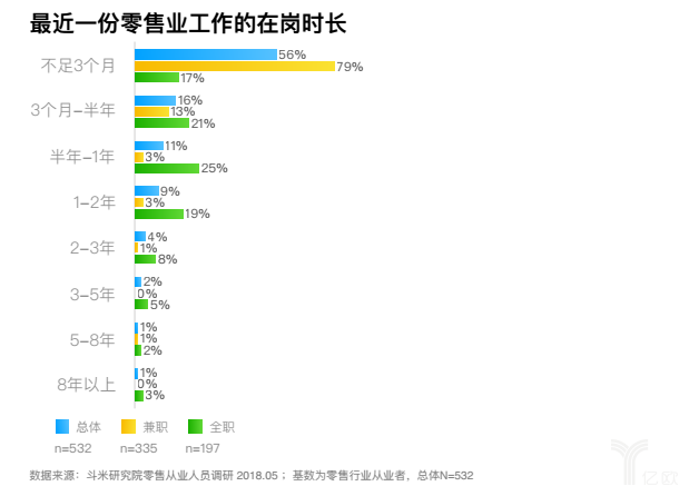 作为窗口行业,零售业的员工每天都会与消费者零距离接触,95%的顾客认为零售业营业员的服务质量是决定其是否购物的重要因素。尤其是一线员工对零售业企业的发展非常重要。然而零售业人才流失却非常严重,不仅招人难,留人更难。报告显示,大部分零售业灵活就业者的在岗时长都较短,超过五成不足3个月,兼职不足3个月的占比接近八成。