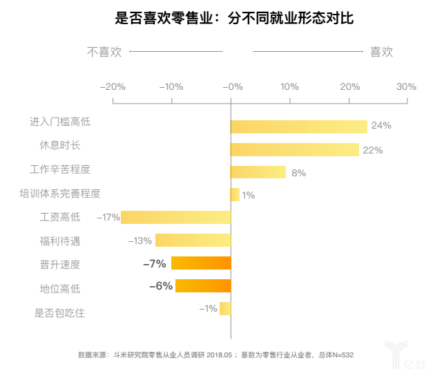 而造成流失率高的原因,并不是因为“不喜欢”,而是在于“不满意”。工资待遇低、工作强度大、各项福利享有率低是零售业员工面临的首要问题。斗米研究院通过调研发现,零售业中全职从业者薪资水平比较低,月平均工资为3566元,远低于国家城镇平均工资,而兼职人员的时薪和日薪也不高,辛苦程度与收入水平远不相称。
