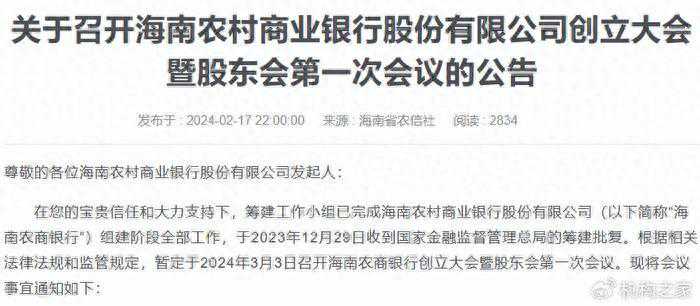 3月3日,海南农商银行创立大会暨股东会第一次会议在海口召开。据了解,海南农商银行是年内创立的第三家省级农商行。 另据海南省农村信用社在官网发布公告称,筹建小组工作已完成对海南农村商业银行(下称“海南农商行”)组建阶段全部工作(图1)。 图1海南省农信社官网公告 在2024年工作会议中,海南农信社表示,2024年是海南农商银行即将成功组建的开局之年,要全力推动海南农商银行顺利开业。在相关公告中,海南农信联社还表示,获准批筹的海南农商行将以“打造自贸港一流金融服务机构”为目标,为海南自由贸易港建设和乡村振兴战略实施贡献金融力量。 海南省联社于2007年挂牌成立,隶属海南省政府管理,受省政府委托,承担对全省农信社的管理、指导、协调和服务职能。目前,全辖8家农商银行,11家市县联社,合计资产超过3200亿元。 一、海南省联社改革有了明确动向 机构之家回顾整理了海南农信系统改革动向,最初是在新三板公司琼中农信2023年5月发布的一则公告。彼时公告称该公司接到上级主管单位海南省联社《通知书》,公司作为海南省联社成员之一,纳入海南农信系统进行深化改革。该公司公告中还指出,后续监事会审议通过了《关于同意组建海南农村商业银行股份有限公司的议案》等十五项议案。该议案披露,海南省农村信用联合社及19家农合机构采取新设合并方式组建海南农村商业银行,其成立后,注销20家机构的法人资格,20家机构的全部资产、业务、债权债务、人员等均由海南农村商业银行承接(详见图2)。 图2中财网公开公告 琼中农信表示,组建海南农村商业银行贯彻落实了国务院进一步深化农村信用社改革的总体部署,构建高质量发展的体制和机制,进一步提高海南农信社金融服务水平和市场竞争力,促进城乡统筹发展,更好服务海南自贸港建设和乡村振兴战略实施,加快向现代化金融企业迈进的步伐。 图3海南省财政局官网公开信息 到2023年12月,海南省财政厅发布2023年海南省支持中小银行发展专项债券(一期)—2023年海南省政府专项债券(二十三期)信息披露文件,见图3。文件显示发行的本期专项债券募集资金将全部用于为拟成立的海南农商行补充资本金,海南省财政厅通过海南财金集团采取间接入股方式,认购拟成立的海南农商行的股份补充其资本金。 从目前披露的信息来看,海南省选择了成立统一法人农商银行的改革方案。相关业内专家表示,“这种模式在部分经营区域较小、机构数量不多的省区具有借鉴意义。统一法人的省级农商行模式有助于集中配置资源,提升经营管理合力和执行力,打造品牌形象,形成规模优势。”这意味着海南地区或将开启农信改革的新方式。 三、中小银行改革化险稳步推进,农信系统迎来改革潮 在“一省一策”政策推动下,已有多个省份明确省联社改革方案。 经机构之家梳理,其中,浙江省联社改革方案率先获批,在2022年4月将省联社整体改制为浙江农商联合银行,打响此轮深化农信社改革“第一单”。 随后,广东省更新改革进展,东莞农商行和普宁农商行的管理权从省联社整体移交至东莞市政府。由此,该省农信系统将形成多银行集团并存局面,即:多家脱离省联社系统的农商行分别管理一部分农信机构、省联社管理一部分农信机构。 2022年4月,湖北省联社传来消息,将整体划入省属国企湖北宏泰集团实际管理,后者也担起湖北省联社改革重任。今年2月26日,湖北省国资委在武汉召开全省国资国企工作电话会议。会议提出,湖北省将深入实施新一轮国企改革深化提升行动和高质量发展五年行动,完成湖北农村商业联合银行组建。 2022年10月,河南、辽宁两地省联社更新改革进展:前者明确将组建河南农商联合银行,相关方案已获银保监批准;后者由沈阳农商行联合省内30家农信机构,组建辽宁省农商银行。 甘肃、四川、广西等地也陆续提出省联社改革目标。甘肃省2023年政府工作报告中提出,稳妥推进农信社改革,组建甘肃农商联合银行;四川省2023年政府工作报告强调,2023年将深化农信系统改革,完成省级农商银行组建。广西计划深入推进农信社改革化险,推动新机构顺利挂牌。目前四川农商联合银行和广西农商联合银行均已开业。 四、“一省一策”原则开展,通过分类深化改革 招联首席研究员董希淼曾表示,“改革模式和方案并无优劣之分,应从实际情况和地方财力出发,选择适合的模式。” 机构之家总结得出,农信社改革路径大致为四种,分别是联合银行模式、金融服务公司模式、金融控股公司模式和统一法人模式。从已获监管批复和各地农信系统的申报情况来看,金融机构集中选择了联合银行模式和统一法人模式。 其中,浙江农商行为“自下而上入股”模式、“小法人、大平台”;河南农商行采取“自上而下逐级参股控股”模式,由省联社向市县级机构逐级参股,形成“省控市、市控县”的三级管理架构。而辽宁农商行选择统一法人模式,由沈阳农商银行牵头合并30家农信联社组建辽宁省农村商业银行股份有限公司。本文报道的海南农信社也将启动统一法人改革,以海南省联社和19家市县行社为基础,采取新社合并方式组建海南农商银行。 五、农信改革没有标准答案:实现这些目标的模式,就是好模式 新一轮农信社改革的关键在于明确发展定位,理顺省联社和辖内联社之间的关系,目标是要完成农