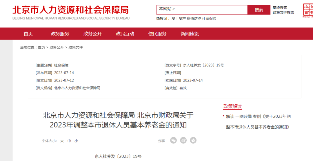 14日,北京市人力资源和社会保障局、北京市财政局发布《关于2023年调整本市退休人员基本养老金的通知》。