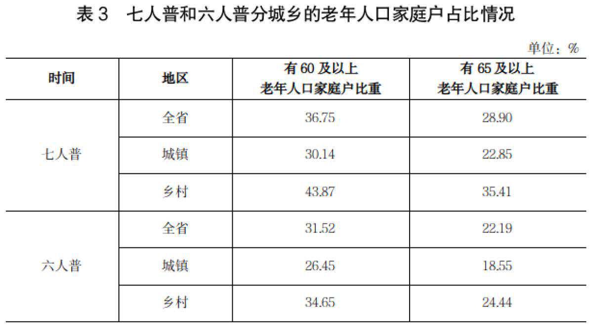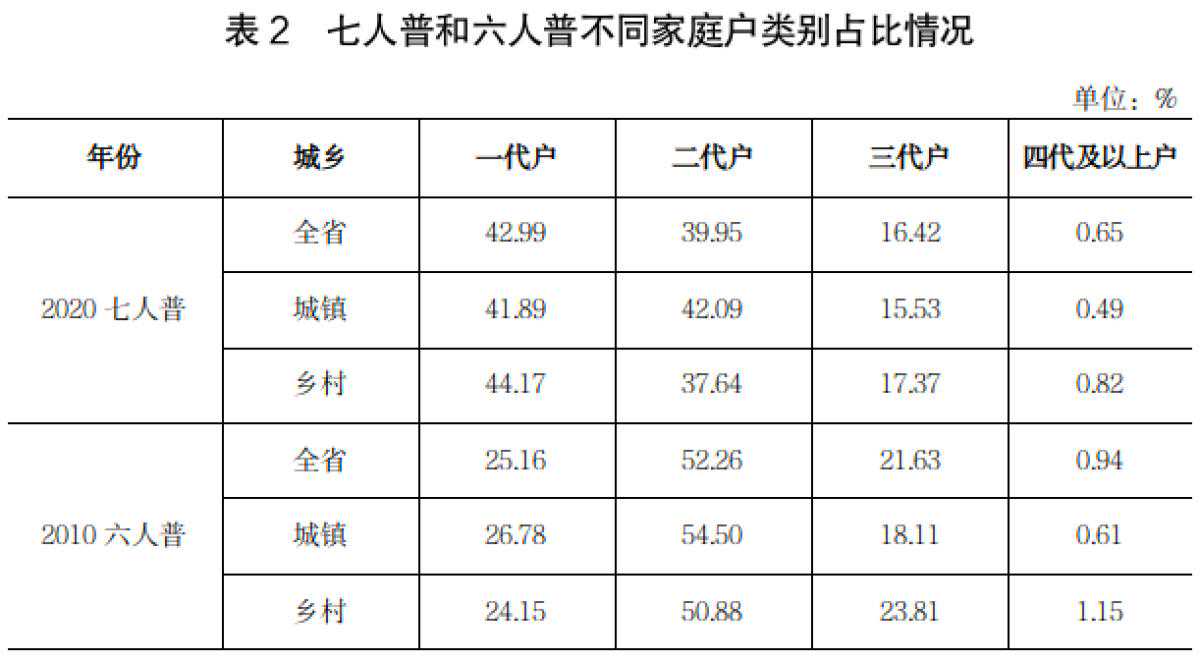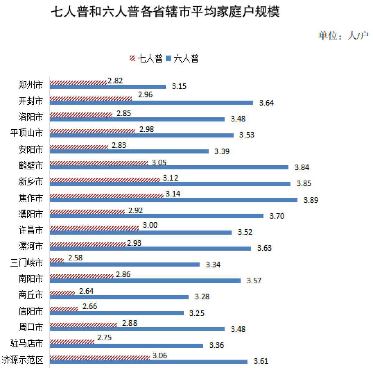 6月29日,河南省统计局发布数据显示,根据2020年第七次全国人口普查(以下简称七人普)结果,河南省家庭户(以家庭成员关系为主,居住一处共同生活的人口,作为一个家庭户。单身居住独自生活的,也作为一个家庭户。)3178.3万户,比2010年第六次全国人口普查(以下简称六人普)增加了585.4万户。其中河南省平均家庭户规模2.86人/户,而郑州市的家庭户最年轻。 一、家庭户规模情况 七人普数据显示,河南省平均家庭户规模2.86人/户,比六人普的3.47人/户减少了0.61人/户。 A:乡村平均家庭户规模小于城镇 七人普数据显示,我省乡村平均家庭户规模小于城镇。河南省城镇平均家庭户规模为2.87人/户,与六人普相比减少了0.43人/户;乡村平均家庭户规模2.84人/户,与六人普相比减少了0.74人/户。 在城镇家庭户中,二人户占全部家庭户户数的比重最高,为25.13%;其次是一人户,占全部家庭户户数的比重为22.04%。在乡村家庭户中,同样也是二人户占全部家庭户户数的比重最高,为28.46%,其次是一人户,占全部家庭户户数的比重为21.91%。 两次普查数据显示,2010~2020这十年间,四人户和五人及以上户占比大幅缩减,一人户和二人户占比大幅提升,三人户占比大致保持稳定。 B:不同地区的平均家庭户规模 七人普数据显示,平均家庭户人口最多的是焦作市,为3.14人/户,其次是新乡市的3.12人/户和济源示范区的3.06人/户;平均家庭户人口最少的是三门峡市,为2.58人/户,其次是商丘市的2.64人/户和信阳市的2.66人/户。 二、家庭户类别情况 七人普数据显示,全省家庭户类别以一代户和二代户为主,共占所有家庭户的82.94%。其中一代户占比42.99%,与六人普相比上升了17.83个百分点,二代户占比39.95%,下降了12.31个百分点,三代户占比16.42%,下降了5.21个百分点。 分城乡来看,与六人普相比,无论是城镇还是乡村,一代户所占比重都是上升的,城镇上升15.11个百分点,乡村上升20.02个百分点。二代户和三代户均有不同程度的下降,二代户城镇和乡村分别下降12.41和13.24个百分点,三代户城镇和乡村分别下降2.58和6.44个百分点。 据以上数据可以看出,我省家庭小型化趋势明显,过去年轻夫妻与父母同住的大家庭正日益减少,单纯的小家庭、核心家庭正日益增多,传统的四世同堂、五世同堂的大家庭户已经越来越少。 三、有老年人口家庭户情况 七人普数据显示,全省有60岁及以上老年人口的家庭户为1167.9万户,其中有65岁及以上老年人口的家庭户为918.5万户,相比六人普时的817.2万户和575.4万户分别增长了42.91%和59.63%,占总家庭户的比重分别达36.75%和28.90%。 A:郑州市的家庭户最年轻 分省辖市来看,2020年漯河市有60岁及以上老年人口的家庭户占其总家庭户的比重最大,为41.92%,其次是焦作的41.17%,最低的是郑州的28.22%。可以看出,各省辖市由于老龄化进程不同,有老年人口的家庭占全部家庭户的比重也呈现出较大差别,郑州市由于外来的年轻人较多,成为省内家庭户最年轻的城市。 B:乡村有老年人口的家庭户比重高于城镇 七人普数据显示,不论城镇还是乡村,有老年人口的家庭户比重均有所上升;乡村的比重高于城镇,而且和六人普相比,城乡占比差距进一步拉大。七人普时,有60岁及以上老年人口家庭户占总家庭户的比重城乡相差13.73个百分点,六人普时城乡相差8.20个百分点;七人普时,有65及以上老年人口家庭户的比重城乡相差12.56个百分点,六人普相差5.89个百分点。