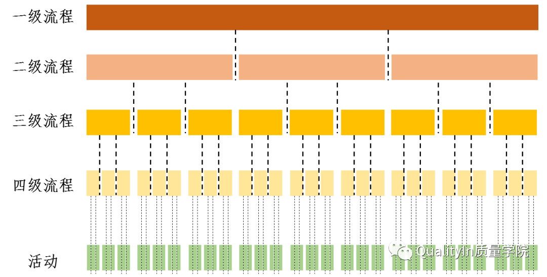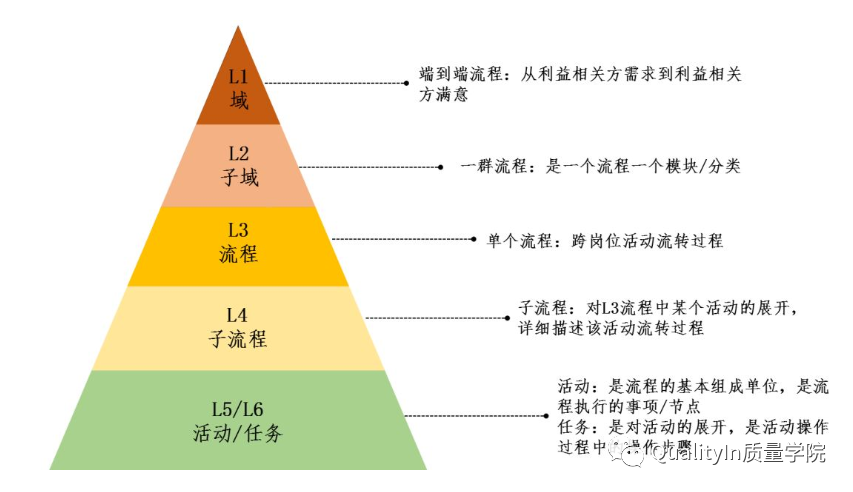 流程的分层和管理层次有一定的对应关系,不同层次的流程用来规范不同管理层次的工作。一级主流程用于中高层的业务决策和端到端跨职能部门的业务管理;二级子流程用于职能域的管理,确保职能