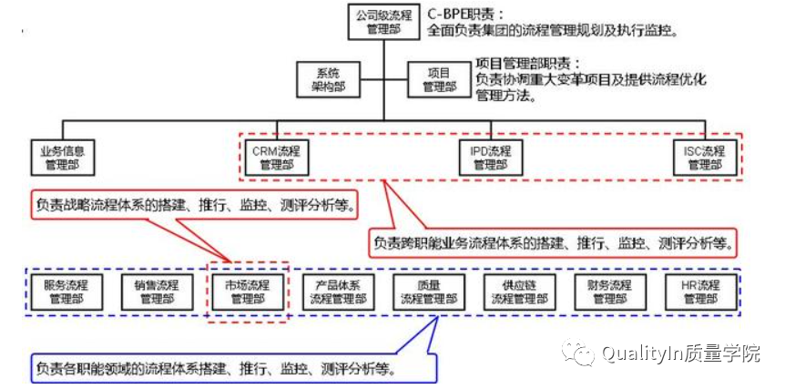 华为的流程由公司级流程管理部全面负责,公司级流程管理部下设项目管理部、系统架构部、业务信息管理部、CRM流程管理部、IPD流程管理部、ISC流程管理部六个二级部门。各二级部门下又设有自己的流程管理部,负责职能领域流程搭建以支持公司级流程管理部负责的跨业务流程运作。