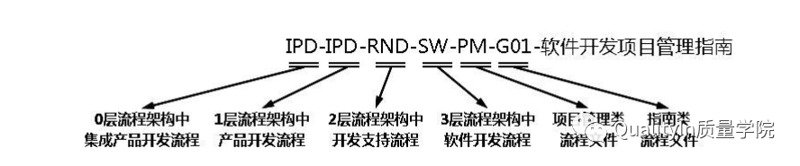 流程文件的标识采用编号加文件名称的方式,编号共由七部分构成,前4段为流程所属各层流程构架的编码,第五部分为流程自定义的类别,第六部分为通用文件分类加编号,第七部分为文件名称,示例如下:
