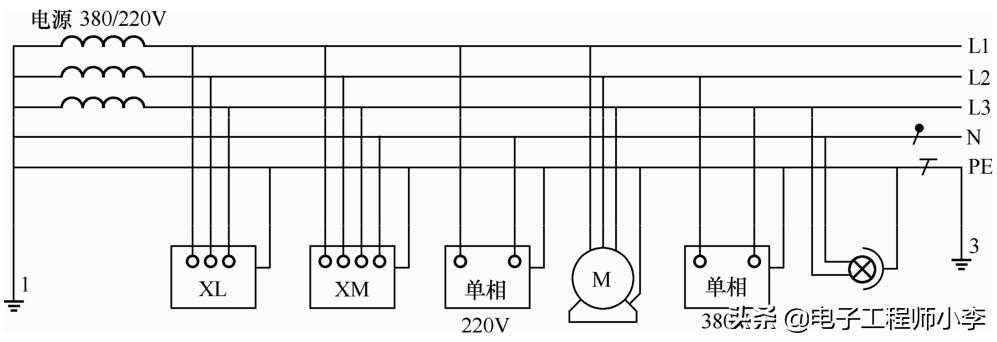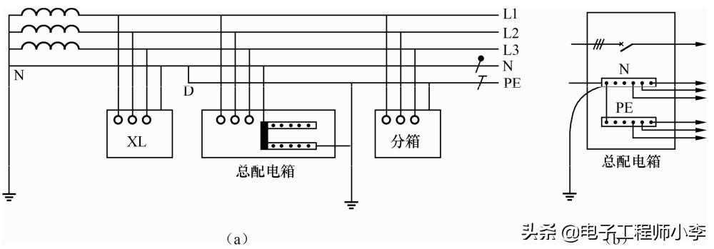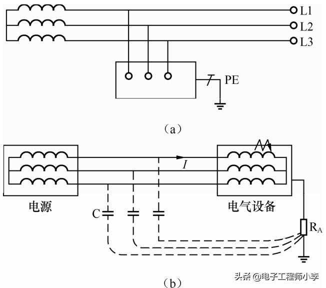 在我国,供电系统采用三相三线制、三相四线制和三相五线制等类型。国际电工委员会则统一规定为TT系统、TN系统和IT系统等。供电系统的具体分类表示如下: 系统类型中字母的含义分别为: 1——用字母表示,表示电力(电源)系统对地的关系:T表示一点直接接地,I表示所有带电部分绝缘; 2——用字母表示,表示用电装置外露的可导电部分对地的关系:T表示设备外壳接地,它与系统中的其他任何接地点无直接关系; 3——用字母表示,表示中性线与保护线的组合关系:C表示中性线与保护线是合一的,如TN-C;S表示中性线与保护线是严格分开的,PE线为专用保护线,如TN-S。 在选择系统接地形式时,应根据系统安全保护具备的条件,并结合工程的实际情况来确定选用,可参照以下几项原则: ①由同一台发电机、配电变压器或同一段母线供电的低压电力系统,不宜同时采用两种系统接地形式。比如,在同一接地低压配电系统中,不宜同时采用TN和TT系统。 ②当在同一低压配电系统中,无法全部采用TN系统时,也可部分采用TT系统接地形式。 ③当采用TT系统供电时,均应装设能自动切除接地故障的装置(包括漏电电流动作保护装置)或经过由隔离变压器供电。 TT系统是设备的金属外壳直接接地的保护系统,称为保护接地系统,如图5.1(a)所示。 图5.1TT方式供电系统 电气设备采用接地保护可以大大减少触电的危险性。但如果相线触及设备金属外壳时,自动断路器不一定跳闸,熔断器也不一定能熔断,故障设备的外壳对地电压就会高于安全电压,所以还需加装漏电断路器作保护。另外,TT系统的接地装置耗材较多,因此TT系统应用较少。 目前,有些地方在临时用电时采用TT系统,增加了一根公共保护地线,可节约接地装置,如图5.1(b)所示。图中把增加的专用保护线PE和中性线N分开了,保护线PE与中性线没有了电的直接联系;设备正常运行时,专用保护线中没有电流。TT系统适用于接地保护点很分散的地方。 TN供电系统是指电源中性点接地,将电气设备的金属外壳与中性线连接的保护系统,称为接零保护系统。TN-C方式供电系统的中性线兼作接零保护线,称作保护性中性线,用PEN表示。TN-C方式供电系统的示意图如图5.2所示。 图5.2TN-C方式供电系统 当设备外壳带电时,接零保护系统将漏电电流上升为较大的短路电流,即单相对地短路故障,熔丝会熔断,断路器自动跳闸,使故障设备断电。因中性线上有不平衡电流存在,则对地有电压,保护线所连接的电器设备金属外壳有一定的电位,所以若供电中性线断线,则保护接零的漏电设备外壳带电。 TN-C系统使用漏电断路器时,中性线不能作为设备的保护零线。保护线上不应设置保护电器和隔离电器。如果电源的相线碰地,则设备的外壳电位升高,会使中性线上的危险电位蔓延。 在TN-C系统中,应采用漏电电流保护或其他保护装置。 电源的中性点接地,中性线N和专用保护接零线PE严格分开的供电系统,称作TN-S供电系统,俗称三相五线制,如图5.3所示。当系统正常运行时,专用保护线上无电流,中性线上也没有不平衡电流。另外PE线有重复接地,不经过漏电断路器,所以供电可靠性高。 图5.3TN-S方式供电系统 中性线可用作单相照明负载的回路线。接零保护可以实现将故障电流转为短路电流,使断路器自动跳闸,安全性能可靠。 TN-S方式供电系统安全可靠,适用于工业与民用建筑等低压供电系统。建筑工程竣工前的“三通一平”(电通、水通、路通和地面平),必须采用TN-S方式供电系统。 在供电系统中,变压器的中性点接地,但中性点没有接出PE线,是三相四线制供电;而某些用电场所要求必须采用专用保护线PE时,可在场所总配电箱中分出PE线,该种系统称为TN-C-S供电系统,如图5.4所示。 图5.4(a)中,总配电箱中N端子与PE端子必须实现连接;图5.4(b)中是在总配电箱中分出PE线,中性线N进入总配电箱后应直接与接地装置焊接连接,中性线N与专用保护线PE连通在一起。 提示 TN-C-S方式供电系统是在TN-C系统上临时变通的做法。当三相电力变压器工作接地情况良好、三相负载比较平衡时,TN-C-S系统在施工用电实践中效果还是可行的。但是,在三相负载不平衡、建筑施工工地有专用的电力变压器时,则必须采用TN-S方式供电系统。 图5.4TN-C-S方式供电系统 IT方式供电系统一般用于一级负荷用户或不允许停电的场所,如图5.5(a)所示。如医院的手术室、地下矿井等处多采用此种方式。 图5.5IT方式供电系统 在供电距离不长时,IT系统供电的可靠性高,安全性好;而在供电距离很长时,该系统供电线路对大地的分布电容就应引起重视了。由图5.5(b)可见:当负载漏电使设备外壳带电时,漏电电流与大地形成回路,保护设备如不动作,会发生危险。 IT系统中的任何带电部分(包括中性线)严禁直接接地。IT系统中的电源系统对地应保持良好的绝缘状态。所有设备外露可导电部分均应通过保护线与接地极(或保护接地母线、总接线端子)连接。 IT系统必须装设绝缘监视及接地故障报警或显示装置。在无特殊要求的情况下,IT系统不宜引出中性线。