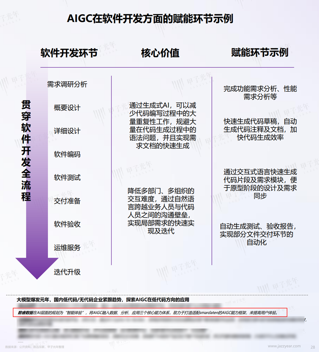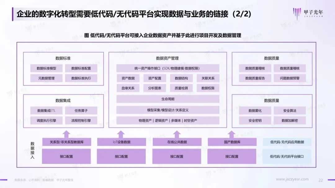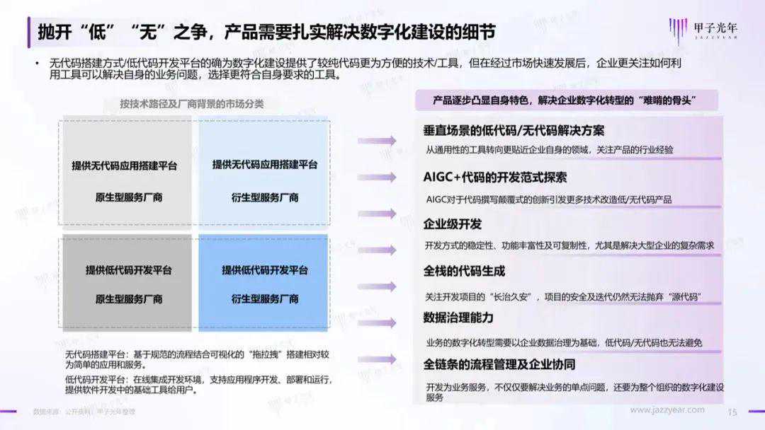 追本溯源,低无代码是来自于对开发效率的追求。Forrester对于低代码的定义:能够以“最少的手写代码”和设置快速开发应用、配置和部署业务应用程序。 这也是目前市场对于低代码开发平台产品及服务的核心需求,特别是在数字化转型浪潮下,需要解决企业数字化转型的业务需求和开发成本之间的矛盾,更高效地利用企业的数字化资产。 数睿数据smardaten企业级无代码平台面向企业数字化转型需求,可打造一体化技术底座,拥有数用一体化、开发场景覆盖更全、统一运维运营等绝佳优势。 从技术特征看:不单是代码工作量的极简,平台沉淀更多可复用的“数字化资产”,客户化定制能力更高,对开发者要求日益降低,具有更一致的用户操作体验。 从业务能力看:企业级无代码应用场景更具有普适性,适用于复杂的业务决策场景,在应用高效构建的同时,又能实现数据与业务的打通、充分发挥企业数据价值。 企业在构建数字化能力体系的过程中需要同时解决柔性作业、敏捷作业、快速研发、降本转型等基本问题。企业对于新技术的讨论逐渐转向实际应用和效果,数字化转型的探索由局部的单点应用转向了系统化的构建和升级。 无代码市场发展正是来自于企业对定制化开发的质量及效率的双重追求。 围绕企业数字化能力打造需求,数睿数据smardaten一体化解决方案,可实现数字化应用生产、统一运维、统一运营管理,成为企业构建数字化转型能力的有效路径。 企业级无代码平台smardaten在开发形式上可以说兼具低代码个性化编码开发和无代码组装搭建的优势,而在平台基础能力上又兼具数据底座、智能分析和可视化分析能力,因此不仅是一个独立的数据平台和无代码平台,更是中大型企业一体化的数字化能力底座。其主要优势还在于: ①解决碎片化建设、平台不完善、响应慢等问题,强化业务与数据融合 ②通过模块化业务能力的沉淀和复用,减少重复投资 ③去技术化的需求共创与迭代,提升数字化建设各方满意度 ④提高跨系统业务集成对接、部署运维和运营管理效率,提升数字化进程掌控力 报告指出,数字化转型的基础以及核心,还在于打破过去分散系统建设和数据孤岛模式,实现数据与业务的连接。数字化转型需要具备三个核心能力: ①业务能力:连接价值交付链路 ②数字能力:全链路数字化运行 ③数据能力:沉淀并释放数据资产价值 面向数字化转型的企业级无代码开发平台,也不止是解决开发效率、复杂度或运维管理的问题。 首先,smardaten平台自带数据底座,除了在工具层面具备企业数据连接、数据集成、数据治理、数据共享与服务等能力,还能天然连接业务构建与业务应用。 基于一体化平台不仅可以打造的丰富业务应用,也能汇集企业全量、全要素和实时的数据,保障和持续提升业务运营的效率。并以此为基础,沉淀和应用数据资产,激发业务创新,提升用户体验。 报告还探讨了AIGC、开发理念及垂直行业需求对厂商与开发者的影响,展现低代码/无代码开发平台在新时代下的趋势方向。AIGC的快速发展也为无代码的应用落地带来新的可能,例如,AIGC可从“拖拉拽”改为更简单的语言或语音交互模式,未来可作为辅助学习助手,进一步降低非开发人员的应用难度。 数睿数据也长期投入AI技术应用,在AI层面的规划为“智能体验”,将AIGC融入数据、分析、应用三个核心能力体系,致力于打造适配smardaten的AIGC能力框架,来提高用户体验。
