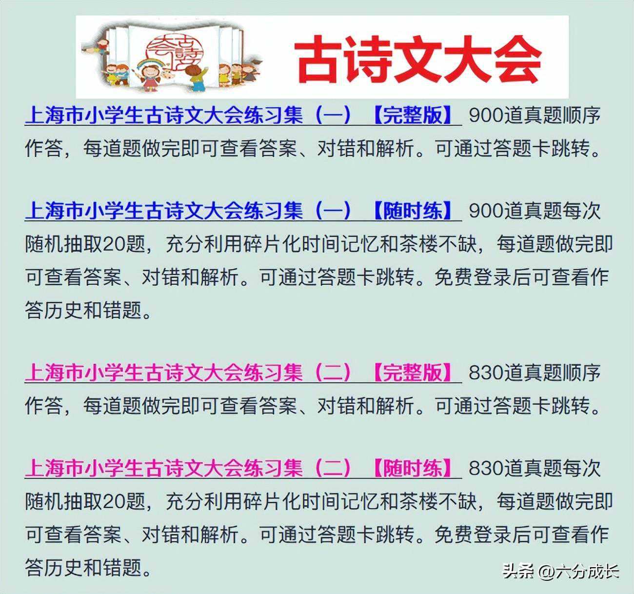一眨眼,上海的小学生同学们已经开学一周了,许多家长已经开始把课外班、各项赛事安排进了日程表。对于小学生古诗文大会,虽然还有8个月的时间才开始,但是如果要在取得好成绩的同时,还扎实掌握相关的知识,则最好现在就开始准备。 我们今天来看15道往年的小学生古诗文大会真题,来看看孩子现在的掌握程度如何吧!这些题目来自我去重、合并后的1700+题库,且每道题我都提供了参考答案和解析。 1、下列有关古代计时的说法,不正确的一项是() A.古代有多种方法表示一天的时间,其中以"十二地支"表示法最为常见。 B.每天从子时(23时至1时)开始,而后依次是丑寅卯辰巳午未申酉戌亥。 C.每个计时单位叫"时辰",相当于现在的两小时,循环一次二十四小时。 D.午时,即中午11时至下午1时;每天太阳升起是寅时,即8点钟左右。 答案:D 答案解析:午时即日中,又名日正、中午等,指上午11时正至下午1时正。寅时又称平旦、黎明、早晨等,是夜与日的交替之际,对应现在的凌晨三点钟到五点钟。十二时辰制是西周时就已使用。汉代命名为夜半、鸡鸣、平旦、日出、食时、隅中、日中、日跌、晡时、日入、黄昏、人定。又用十二地支来表示,以夜半二十三点至一点为子时,一至三点为丑时,三至五点为寅时,依次递推。子时(23时至01时)丑时(01时至03时)寅时(03时至05时)卯时(05时至07时)辰时(07时至09时))已时(09时至11时)午时(11时至13时)未时(13时至15时)申时(15时至17时)酉时(17时至19时)一F时(19时至21时)亥时(21时至23时)。 2、"天门中断楚江开,碧水东流至此回"中的天门山指的是() A.张家界天门山 B.安徽芜湖天门山 C.桂林天门山 D.河北秦皇岛天门山 答案:B 答案解析:这两句诗出自唐代•李白的《望天门山》:天门中断楚江开,碧水东流至此回。两岸青山相对出,孤帆一片日边来。这里的天门山指的是位于安徽省和县与芜湖市长江两岸的天门山,在江北的叫西梁山,在江南的叫东梁山。两山隔江对峙,形同门户,所以被称为“天门”。 3、《归园田居》中写诗人早出晚归,欣慰自足的隐居生活的句子是() A.种豆南山下,草盛豆苗稀。 B.晨兴理荒秽,带月荷锄归。 C.道狭草木长,夕露沾我衣。 D.衣沾不足惜,但使愿无违。 答案:B 答案解析:《归园田居》是晋宋之际文学家陶渊明的组诗作品,共五首,其中第三首表达了作者经过生活的磨励和对社会与人生深刻思索之后,对真善美理想的执着追求和与现实社会污浊官场的决裂。全文:种豆南山下,草盛豆苗稀。晨兴理荒秽,带月荷锄归。道狭草木长,夕露沾我衣。衣沾不足惜,但使愿无违。 4、"兼葭苍苍,白露为霜"中"蒹葭"指() A.芦苇 B.荷花 C.兰草 D.水稻 答案:A 答案解析:兼葭苍苍,白露为霜。所谓伊人,在水一方。出自作品《诗经》中的《国风•秦风•兼葭》。兼葭指初生的芦苇。白露指清晨的露水,比喻存在时间极短促的事物。 5、下列诗歌,除()项,都表达了诗人对春天的喜爱之情。 A.岑参的《山房春事》 B.杜甫的《江畔独步寻花》 C.杨万里的《晓出净慈寺送林子方》 D.白居易的《钱塘湖春行》 答案:C 答案解析:C这首诗描写的是夏天,六月西湖的景色。 6、关于苏轼,以下称呼有误的是() A.子瞻 B.铁冠道人 C.东坡居士 D.颍滨遗老 答案:D 答案解析:颍滨遗老,是苏辙晚年的别号,苏辙和苏轼是兄弟,苏轼是苏辙的哥哥。 7、下列对《子衿》理解错误的一项是() A.全诗采用倒叙手法,诗歌的前两章具有重章叠句的特点。 B.全诗三章,每章四句,为先秦时代郑地民歌。 C.女子的焦灼万分如在眼前,是因为诗人运用了大量动作描写。 D.第三章点明地点,女子觉得即使只有一天不见面,也好像分别了三个月。 答案:C 答案解析:本题考查的是对这首诗的内容的理解、手法运用的分析和思想感情的把握,我们解答时要结合整首诗,逐句进行分析。D项理解不正确,这种艺术效果的获得,在于诗人在创作中运用了大量的心理描写。附:子衿《诗经•郑风》全文:青青子衿,悠悠我心。纵我不往,子宁不嗣音?青青子佩,悠悠我思。纵我不往,子宁不来?挑兮达兮,在城阙兮。一日不见,如三月兮。 8、以下选项中,对诗句"忽如一夜春风来,千树万树梨花开。"描述正确的一项是() A.这句诗出自一首咏物诗 B.这句诗描写的是春天的景象 C.这句诗描写的是夏天的景象 D.这句诗描写的是冬天的景象 答案:D 答案解析:这句诗出自唐代著名诗人岑参的《白雪歌送武判官归京》。这是一首咏雪送人诗。“忽如一夜春风来,千树万树梨花开”这两句诗的意思是写挂在枝头的积雪,在诗人的眼中就像一夜盛开的梨花,似乎是美丽的春天突然到来了一样。 9、下列古诗中,不是李白写的是() A.《秋浦歌》 B.《古朗月行》 C.《秋夕》 D.《独坐敬亭山》 答案:C 答案解析:《秋夕》是唐代诗人杜牧(也有人说是王建)创作的一首七言绝句,是一首宫怨诗。【全诗】银烛秋光冷画屏,轻罗小扇扑流萤。天阶夜色凉如水,坐看牵牛织女星。 10、以下()是对自己父亲的敬称。 A.令尊 B.家慈 C.令堂 D.家严 答案:D 答案解析:令尊是对对方母亲,令堂是对对方父亲,家慈是对自己母亲。一般”令“是对对方家人的尊称,”家“是自己的谦称。 11、《橘颂》中"纷缊宜修,姱而不丑兮。","姱"的意思是() A.美好 B.夸奖 C.夸大 D.挎 答案:A 答案解析:纷缊宜脩:长得繁茂,修饰得体。脩,同“修”。姱(kuā):美好。《九章•橘颂》是战国时期楚国