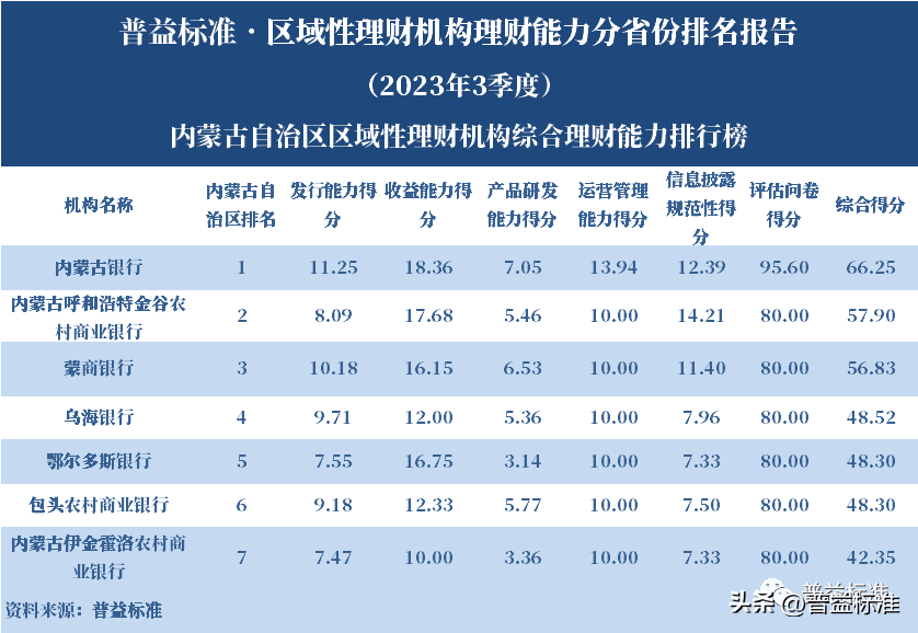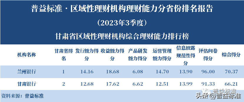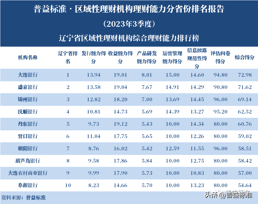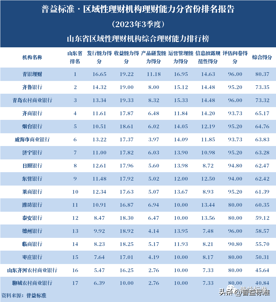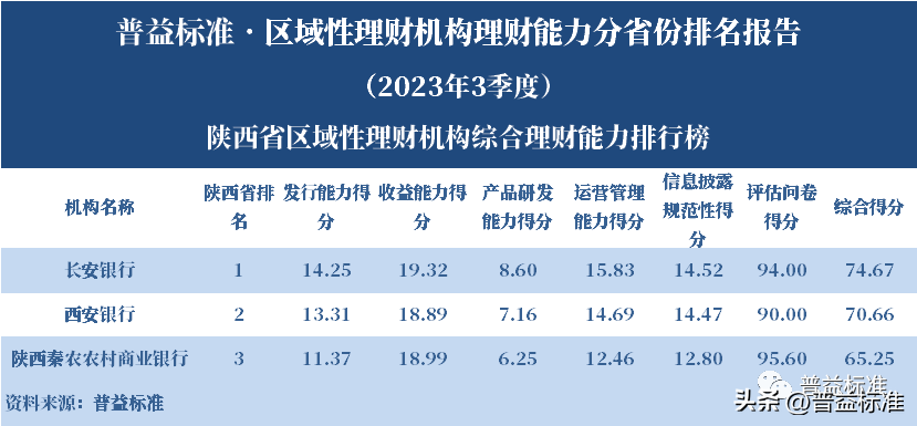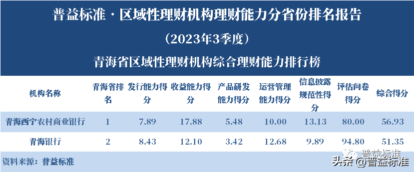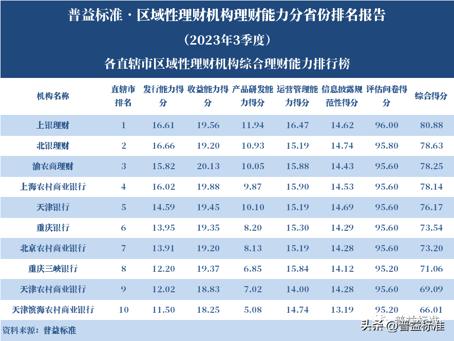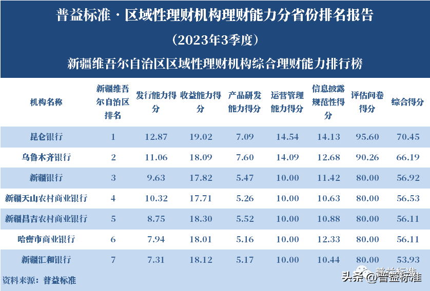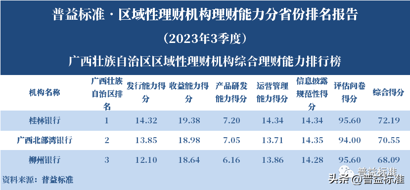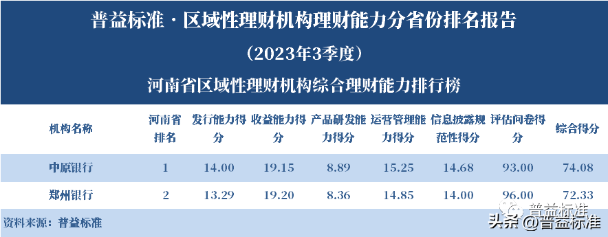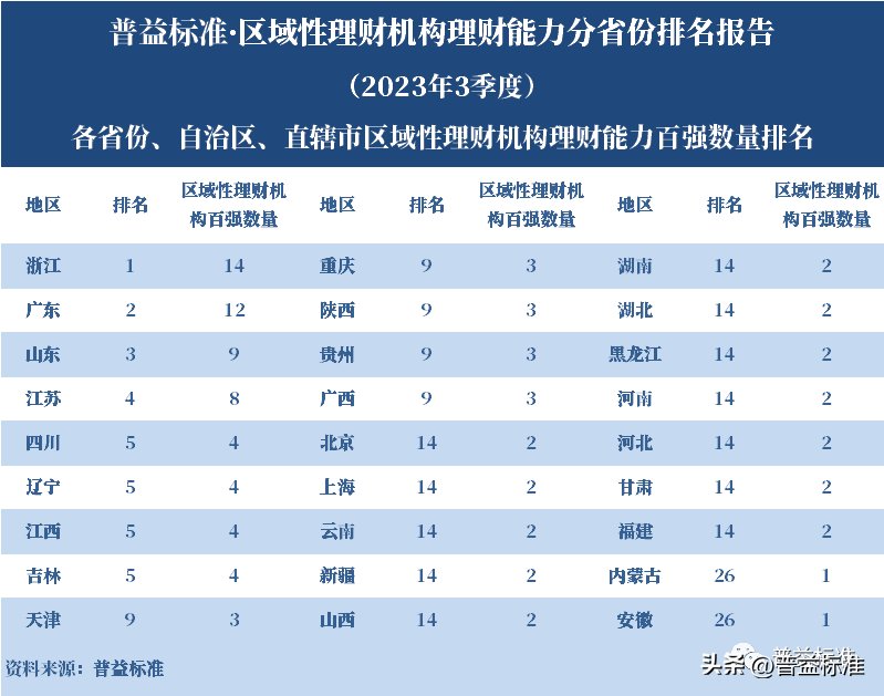 发布机构:普益标准·普益寰宇研究院 研究支持:西南财经大学信托与理财研究所 发布时间:2023年11月27日 摘要 2023年3季度,各省区域性理财机构理财业务转型稳步推进。区域性理财机构百强榜中,浙江省、广东省、山东省和江苏省地区区域性理财机构占据一定理财能力优势,四省区域性理财机构在理财能力百强名单中共占据了43席;其中浙江省仍排名第一,百强理财机构数量为14家;其次为广东省,百强理财机构数量均为12家;山东省排名第三,百强理财机构为9家;再者是江苏省排名第四,百强理财机构数量为8家。从规模分布来看,市场集中度较为明显,四个直辖市和浙江、广东、山东、江苏四省的个人理财规模占比区域性理财机构近七成。 从发行主体类型来看,2023年3季度城商系理财机构(包括城商行理财公司、城商行)净值型理财产品存续数量为19405款,较2023年2季度增加1288款,环比上升7.11%;净值型理财存续规模估计为4.80万亿元,环比上升2.16%。农村金融理财机构的净值型理财存续数量为11230款,较2023年2季度增加195款,环比上升1.77%;净值型理财存续规模估计为1.31万亿元,环比下降1.56%。 从认购对象来看,2023年3季度,城商系理财机构存续个人净值型理财产品18938款,存续规模估量为4.55万亿元,在城商系理财机构产品存续规模总量中占比约为94.75%;城商系理财机构存续机构和同业净值型理财产品467款,存续规模估量为0.25万亿元,在城商系理财机构存续规模总量中占比约为5.25%。农村金融理财机构存续个人净值型理财产品11110款,存续规模估量为1.22万亿元,在农村金融理财机构产品存续规模总量中占比约为93.24%;农村金融理财机构存续机构和同业净值型理财产品120款,存续规模估量为0.09万亿元,在农村金融理财机构产品存续规模总量中占比约为6.76%。 区域性银行中,2023年3季度,已有8家城商行(杭州银行、宁波银行、徽商银行、南京银行、江苏银行、青岛银行、上海银行和北京银行)和1家农商行(重庆农商银行)的理财公司开业。 ▼ 普益标准·区域性理财机构理财能力 分省份排名报告 (2023年3季度) 研究员:王丽婷于康 此次区域性理财机构理财能力排名以2023年3季度为观察期。我们对观察期内各家理财机构的理财产品进行统计与评价,同时辅以评估问卷调查的形式对各家理财机构理财业务的产品研发、投资管理、产品销售、信息披露等方面进行考察与分析。 本排名报告所界定的“区域性理财机构”是指除大型国有银行及其理财公司、股份制商业银行及其理财公司以外的其它具备理财业务开展资质的区域性银行及其理财公司。在对区域性理财机构进行分省份排名时,主要依据为各区域性理财机构的法人注册所在地。 编制区域性理财机构分省份排名报告的意义在于更直观地展现各省份内和省份之间的理财机构的理财能力差异,向各界社会公众展示理财机构理财能力更为出色的各省城商系理财机构和农村金融理财机构。区域性理财机构竞争力的提升对于我国金融体系的均衡发展意义重大,这需要第三方研究咨询机构不断深入研究。编制区域性理财机构分省份排名报告为各区域性理财机构了解区域经济、金融特征对理财业务发展的影响提供了方便,有助于各区域性理财机构因地制宜地制定理财业务发展策略,并从其他区域性理财机构获取发展经验。 本季度排名体系采用自2023年3季度启用的“普益标准•银行理财能力排名体系7.2版”。7.2版排名体系仍旧考察理财机构发行能力、收益能力、产品研发能力、运营管理能力以及信息披露规范性五大指标,并在7.1版排名体系的基础上对于运营管理能力板块根据理财机构管理规模量级增设了“管理难度系数”权重,以便更为客观地反映各理财机构的运营管理能力。 从发行主体类型来看,2023年3季度城商系理财机构(包括城商行理财公司、城商行)净值型理财产品存续数量为19405款,较2023年2季度增加1288款,环比上升7.11%;净值型理财存续规模估计为4.80万亿元,环比上升2.16%。农村金融理财机构的净值型理财存续数量为11230款,较2023年2季度增加195款,环比上升1.77%;净值型理财存续规模估计为1.31万亿元,环比下降1.56%。 从认购对象来看,2023年3季度,城商系理财机构存续个人净值型理财产品18938款,存续规模估量为4.55万亿元,在城商系理财机构产品存续规模总量中占比约为94.75%;城商系理财机构存续机构和同业净值型理财产品467款,存续规模估量为0.25万亿元,在城商系理财机构存续规模总量中占比约为5.25%。农村金融理财机构存续个人净值型理财产品11110款,存续规模估量为1.22万亿元,在农村金融理财机构产品存续规模总量中占比约为93.24%;农村金融理财机构存续机构和同业净值型理财产品120款,存续规模估量为0.09万亿元,在农村金融理财机构产品存续规模总量中占比约为6.76%。 从区域性理财公司建设来看,截至2023年3季度,已有8家城商行(杭州银行、宁波银行、徽商银行、南京银行、江苏银行、青岛银行、上海银行和北京银行)和1家农商行(重庆农商银行)的理财公司开业。 表1列示了各省份、自治区和直辖市区域性理财机构百强数量排名。总体来看,本季度各区域性百强理财机构排名稳中有变,浙江省仍排名第一,百强理财机构数量为14家;其次是广东省,百强理财机构数量均为12家;山东省排名第三,百强理财机构数量为9家;再者是江苏省排名第