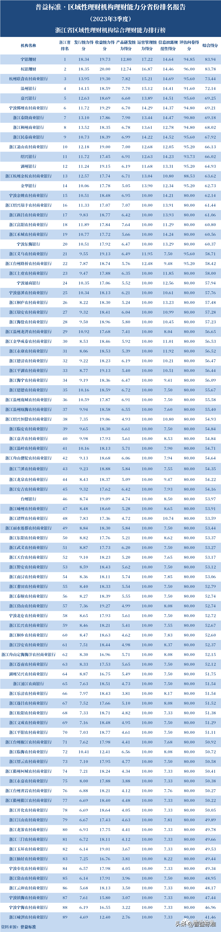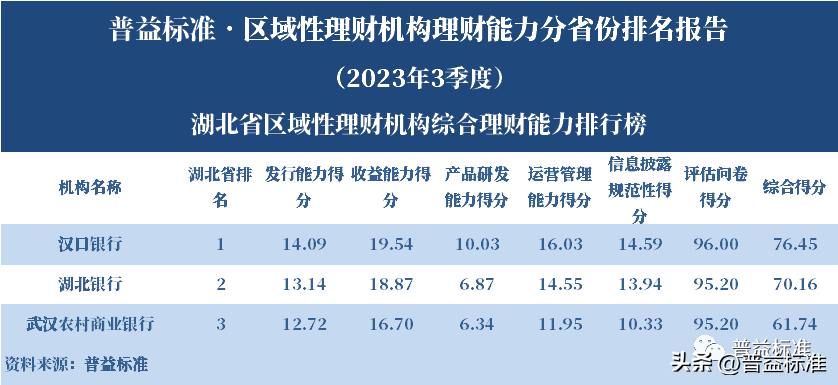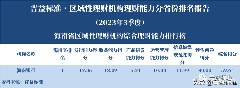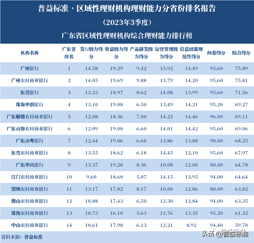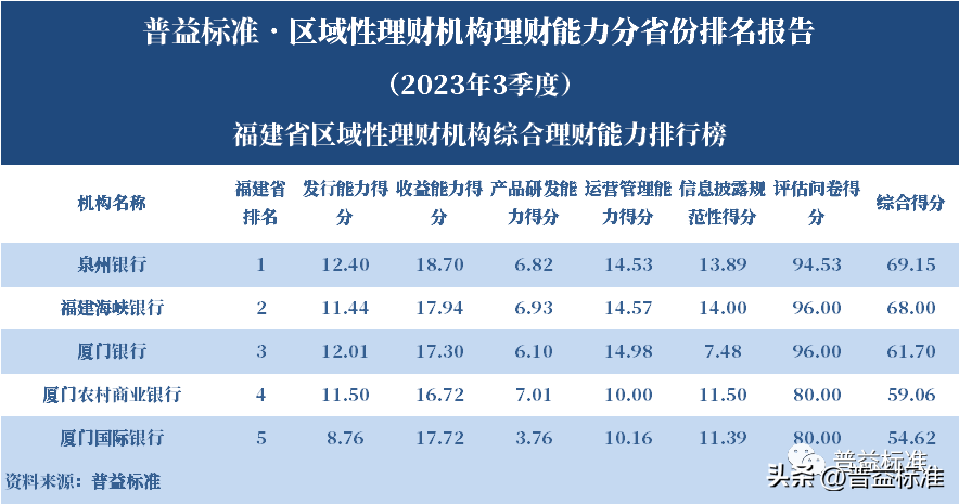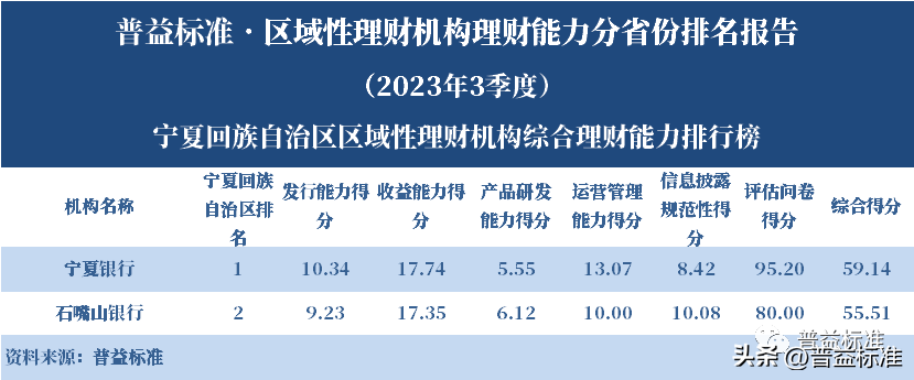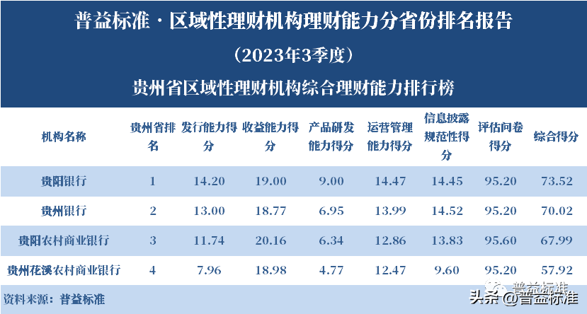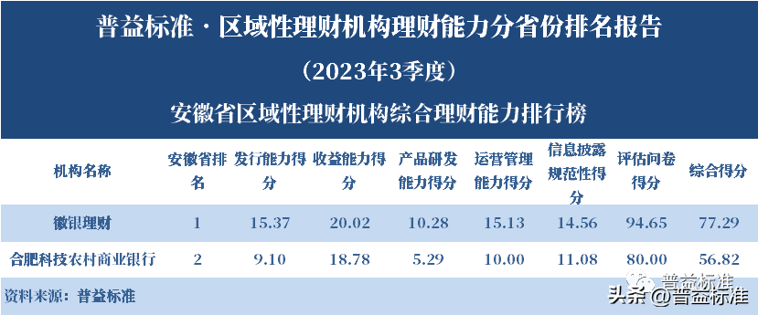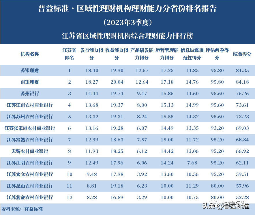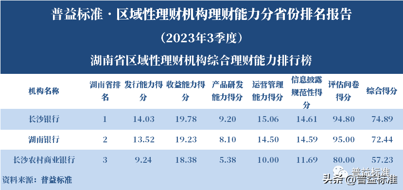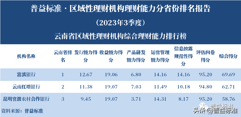 发布机构:普益标准·普益寰宇研究院 研究支持:西南财经大学信托与理财研究所 发布时间:2023年11月27日 摘要 2023年3季度,各省区域性理财机构理财业务转型稳步推进。区域性理财机构百强榜中,浙江省、广东省、山东省和江苏省地区区域性理财机构占据一定理财能力优势,四省区域性理财机构在理财能力百强名单中共占据了43席;其中浙江省仍排名第一,百强理财机构数量为14家;其次为广东省,百强理财机构数量均为12家;山东省排名第三,百强理财机构为9家;再者是江苏省排名第四,百强理财机构数量为8家。从规模分布来看,市场集中度较为明显,四个直辖市和浙江、广东、山东、江苏四省的个人理财规模占比区域性理财机构近七成。 从发行主体类型来看,2023年3季度城商系理财机构(包括城商行理财公司、城商行)净值型理财产品存续数量为19405款,较2023年2季度增加1288款,环比上升7.11%;净值型理财存续规模估计为4.80万亿元,环比上升2.16%。农村金融理财机构的净值型理财存续数量为11230款,较2023年2季度增加195款,环比上升1.77%;净值型理财存续规模估计为1.31万亿元,环比下降1.56%。 从认购对象来看,2023年3季度,城商系理财机构存续个人净值型理财产品18938款,存续规模估量为4.55万亿元,在城商系理财机构产品存续规模总量中占比约为94.75%;城商系理财机构存续机构和同业净值型理财产品467款,存续规模估量为0.25万亿元,在城商系理财机构存续规模总量中占比约为5.25%。农村金融理财机构存续个人净值型理财产品11110款,存续规模估量为1.22万亿元,在农村金融理财机构产品存续规模总量中占比约为93.24%;农村金融理财机构存续机构和同业净值型理财产品120款,存续规模估量为0.09万亿元,在农村金融理财机构产品存续规模总量中占比约为6.76%。 区域性银行中,2023年3季度,已有8家城商行(杭州银行、宁波银行、徽商银行、南京银行、江苏银行、青岛银行、上海银行和北京银行)和1家农商行(重庆农商银行)的理财公司开业。 ▼ 普益标准·区域性理财机构理财能力 分省份排名报告 (2023年3季度) 研究员:王丽婷于康 此次区域性理财机构理财能力排名以2023年3季度为观察期。我们对观察期内各家理财机构的理财产品进行统计与评价,同时辅以评估问卷调查的形式对各家理财机构理财业务的产品研发、投资管理、产品销售、信息披露等方面进行考察与分析。 本排名报告所界定的“区域性理财机构”是指除大型国有银行及其理财公司、股份制商业银行及其理财公司以外的其它具备理财业务开展资质的区域性银行及其理财公司。在对区域性理财机构进行分省份排名时,主要依据为各区域性理财机构的法人注册所在地。 编制区域性理财机构分省份排名报告的意义在于更直观地展现各省份内和省份之间的理财机构的理财能力差异,向各界社会公众展示理财机构理财能力更为出色的各省城商系理财机构和农村金融理财机构。区域性理财机构竞争力的提升对于我国金融体系的均衡发展意义重大,这需要第三方研究咨询机构不断深入研究。编制区域性理财机构分省份排名报告为各区域性理财机构了解区域经济、金融特征对理财业务发展的影响提供了方便,有助于各区域性理财机构因地制宜地制定理财业务发展策略,并从其他区域性理财机构获取发展经验。 本季度排名体系采用自2023年3季度启用的“普益标准•银行理财能力排名体系7.2版”。7.2版排名体系仍旧考察理财机构发行能力、收益能力、产品研发能力、运营管理能力以及信息披露规范性五大指标,并在7.1版排名体系的基础上对于运营管理能力板块根据理财机构管理规模量级增设了“管理难度系数”权重,以便更为客观地反映各理财机构的运营管理能力。 从发行主体类型来看,2023年3季度城商系理财机构(包括城商行理财公司、城商行)净值型理财产品存续数量为19405款,较2023年2季度增加1288款,环比上升7.11%;净值型理财存续规模估计为4.80万亿元,环比上升2.16%。农村金融理财机构的净值型理财存续数量为11230款,较2023年2季度增加195款,环比上升1.77%;净值型理财存续规模估计为1.31万亿元,环比下降1.56%。 从认购对象来看,2023年3季度,城商系理财机构存续个人净值型理财产品18938款,存续规模估量为4.55万亿元,在城商系理财机构产品存续规模总量中占比约为94.75%;城商系理财机构存续机构和同业净值型理财产品467款,存续规模估量为0.25万亿元,在城商系理财机构存续规模总量中占比约为5.25%。农村金融理财机构存续个人净值型理财产品11110款,存续规模估量为1.22万亿元,在农村金融理财机构产品存续规模总量中占比约为93.24%;农村金融理财机构存续机构和同业净值型理财产品120款,存续规模估量为0.09万亿元,在农村金融理财机构产品存续规模总量中占比约为6.76%。 从区域性理财公司建设来看,截至2023年3季度,已有8家城商行(杭州银行、宁波银行、徽商银行、南京银行、江苏银行、青岛银行、上海银行和北京银行)和1家农商行(重庆农商银行)的理财公司开业。 表1列示了各省份、自治区和直辖市区域性理财机构百强数量排名。总体来看,本季度各区域性百强理财机构排名稳中有变,浙江省仍排名第一,百强理财机构数量为14家;其次是广东省,百强理财机构数量均为12家;山东省排名第三,百强理财机构数量为9家;再者是江苏省排名第
