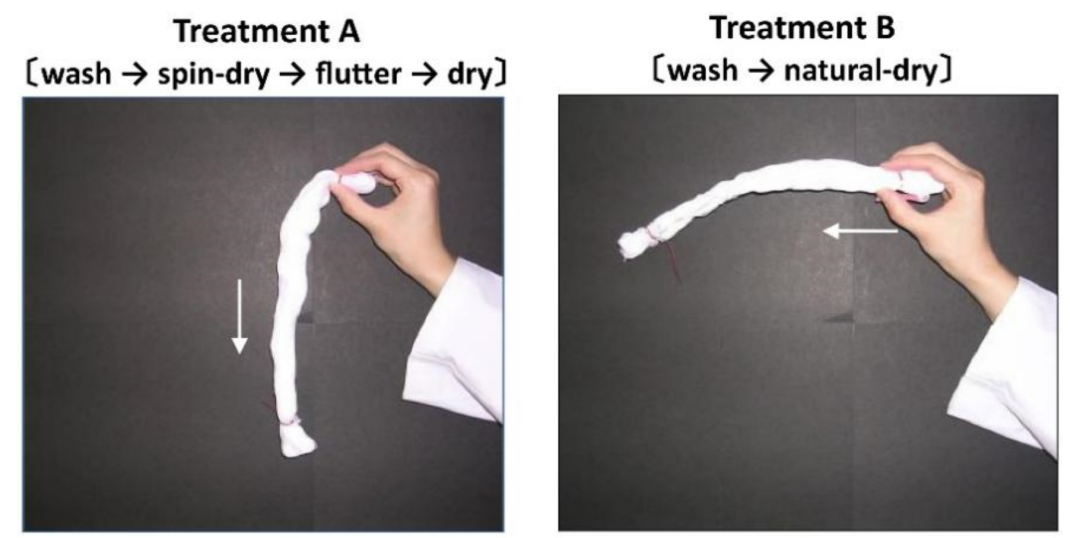 图源博主@橄榄油,已获得授权 一个安静的午后,你正打算收拾晾干的衣物,突然发现,一只掉落的袜子,居然是站在地上的。 它不仅能站起来,而且有时候还会硬得像一根树枝,感觉都可以拿来捅人了。 你捡起这只“坚强”的袜子,百思不得其解:“为什么有时候洗过的袜子会变硬?” 图源博主@香菜灭绝工程形象大使、@胖七,已获得授权 袜子走上变硬的不归路,要从你接的一盆水开始说起。 我国南方各省级行政区以地表水源供水为主,地下水占比不到10%。而北方地区的供水量中地下水占比接近30%[1],华北、西北城市利用地下水的比例更是分别高达72%和66%[2][3]。 地表水主要是特软水和软水,而地下水主要是中硬水[4]。软水中可溶性钙镁化合物较少,而硬水中则较多[5]。洗涤时,这些化合物易和洗涤剂合成不溶于水的沉淀物[6],它们粘附在纤维上,洗完后也会留在袜子上[6]。这让袜子不仅变得僵硬、粗糙[6][7][8],还会褪色,显得脏兮兮的。 如果你从南方到北方上学或工作,很可能发现自己的袜子硬得格外快。 用硬水洗衣服,不仅会浪费洗涤剂,还会缩短洗衣机和衣物的使用寿命[7]/Pexels 但用硬水洗涤,只是袜子变硬的第一步。如果你懒得把袜子完全拧干,只是把湿答答的袜子随意一晾,任其”自由发挥“,那么它又向”站起来“这个目标狠狠迈进了一步。 在日常生活中,我们穿的袜子主要都是棉袜[9]。像棉袜这种含有棉纤维成分的织物,在自然干燥后本身就容易变硬。 自然晾晒的棉袜中其实是残存着结合水的。这种水不像自由水那样能自由流动[10],它能与棉袜中的纤维分子通过氢键结合,并将不同纤维联结成网络[11]。简单来说,结合水就像纤维间搭建的一个个“桥梁”,会让袜子变得更加结实,甚至硬邦邦的。 作为人类生活服装方面的核心材料,棉纤维大约占据了全球纤维生产的40%[11]/图虫创意 根据这个原理,有两种方法可以改善袜子变硬的问题。 第一种方法是添加柔顺剂,主要成分是阳离子表面活性剂,可以有效抑制纤维因结合水而形成网络[11]。 第二种是“暴力去除结合水”的方法,比如清洗后先甩干再自然晾晒。 研究人员设计了一组实验,发现充分洗涤后的纯棉毛巾,如果弄湿后自然晾干,得到的毛巾就会很硬,就像是上过浆的一样。 但当他们重复常规的洗涤操作时,将毛巾甩干后再自然晾干,在不使用柔顺剂的情况下,这一举动显著改善了毛巾的硬度,毛巾变得更柔软[11]。 实验后的毛巾外观(不含柔顺剂):左边是提前甩干后晾晒的效果,右边是直接自然晾晒的效果/[11] 或者你也可以直接用烘干机烘干,袜子也会相对柔软一些[12]。结合水不像自由水那样容易移动或蒸发,所以机器的“暴力烘干”会比自然晾晒更多地减少结合水的含量。 不过,如果你恰好是一位爱干净的人士,每天都勤奋地清洗袜子,那么恭喜你,你的袜子在硬度方面将会变得遥遥领先。 没办法,你不得不面对这样一个残酷的事实:洗涤本身就是一个对袜子有伤害的过程。衣物纤维经过反复的常规洗涤和自然干燥后就会变硬[11]。 晾晒时,应在阴凉通风处晾晒,不要在强烈日光下暴晒,以防止袜子失去弹性/Pexels 洗涤过程对织物的损坏比穿着时造成的损坏更大,这就是为什么衣物的耐用性一般是根据其能承受的洗涤次数来衡量的[13]。 洗涤会使织物拉紧,单位面积的纤维数量增加,并且导致织物变厚、变重[14]。而织物变厚或密度增加都会使柔软度降低[15]。 另外,在洗涤过程中,织物会受到不同程度的机械作用,包括织物与织物之间、织物与机器之间的摩擦。这些摩擦会让更多的纤维突出,造成衣物表面的粗糙[16]。 如果你也想拥有一只能站起来的袜子,记得用硬水多洗几次,千万不要提前拧干,让它在阳光下暴晒就行了哦。