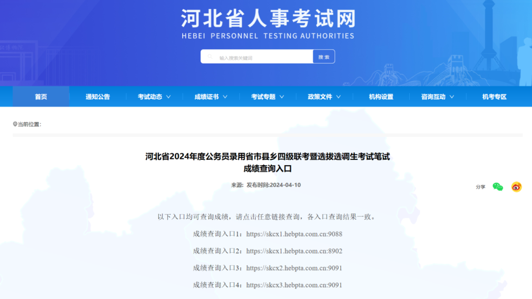 再过50天 很多小伙伴将迎来重要的人生节点 踏入高考考场 走了这么远的路 这场青春与梦想的征途 即将盼来曙光 关关难过关关过 还有50天一切都还来得及 看似不起波澜的日复一日 一定会在未来的某天 让你看到坚持的意义 加油,未来的大学生们! 也为24省考面试的小伙伴们加油 你的前方是熠熠生辉的未来 2024上岸! 威宝儿 2024省考笔试成绩发布中! 目前已出:黑龙江、吉林、天津、 广西、甘肃、福建、云南、 青海、海南、湖南、广东 新增:陕西、山西、 贵州、湖北、江西、 宁夏、河北、河南、 新疆兵团、辽宁、安徽、(重庆市) 激动人心有没有 2024辽宁省考体测公告已发布 辽宁省公安系统体测时间: 4月22日-24日 辽宁省检察院/法院系统体测时间: 4月18日、19日 上下滑动查看更多 公安系统体测公告节选 根据2024年度辽宁省考试录用公务员工作的统一部署和要求,现将公安系统考试录用公务员(人民警察)体能测评有关事项公告如下: 一、人员范围 2024年度辽宁省公安系统考试录用公务员(人民警察),通过资格审查(复审)的人员可以进入体能测评(人员名单详见附件)。 二、体能测评项目标准和实施规则 体能测评项目包括10米×4往返跑、1000米(男)/800米(女)跑和纵跳摸高,其中,警务技术职位测查10米×4往返跑和纵跳摸高项目,其它职位测查全部3个项目。凡应测项目中任意一项不达标的,即为体能测评不合格。 (一)项目标准 1.男子组 项目 标准 30岁(含)以下 31岁(含)以上 10米×4往返跑 ≤13″1 ≤13″4 1000米跑 ≤4′25″ ≤4′35″ 纵跳摸高 ≥265厘米 2.女子组 项目 标准 30岁(含)以下 31岁(含)以上 10米×4往返跑 ≤14″1 ≤14″4 800米跑 ≤4′20″ ≤4′30″ 纵跳摸高 ≥230厘米 备注:年龄计算时间截止到参加体能测评当月。 (二)实施规则 1.10米×4往返跑 受测试者采用站立式起跑,听到发令后从S1线外跑到S2线前(脚不得踩线)用手将竖立的木块推倒后折返,往返跑2次,每次推倒1个木块,第2次返回时冲出S1线。按组别进行测试,每人最多可测2次,1次测评达标,即视为该项目测评合格。 测试时有以下任一情况,不计取成绩: (1)出发时抢跑; (2)折返时脚踩S1或S2线; (3)折返时未推倒木块。 2.男子1000米跑、女子800米跑 受测试者统一采用站立式起跑姿势,在起跑线外听到或看到发令信号时开始起跑,跑完相应距离越过终点线后视为完成测试。按组别进行测试,每人最多可测1次。 测试时有以下任一情况,不计取成绩: (1)出发时抢跑; (2)出发时脚踩线; (3)途中跑时超越或踩踏最内侧跑道线。 3.纵跳摸高 受测试者赤脚或穿袜,双脚自然分开,呈站立姿势。接到开始测试指令后,受测者屈膝半蹲,双臂后摆,随后双腿蹬地垂直向上起跳,同时双臂向前上方快速摆动,举起一侧优势手触摸合格高度的目标物,触摸到相应高度者视为合格。按组别进行测试,每人最多可测3次,1次测试达标,即视为该项目测试合格,3次均未达标者视为不合格。 测试时有以下任一情况,不计取成绩: (1)起跳时双腿有移动或有垫步动作; (2)手指甲超过指尖0.3厘米; (3)戴手套等其他物品; (4)穿鞋进行测试。 体能测评各项目运动强度较大,有可能在运动过程中发生意外,考生本人务必对自身身体状况是否适合剧烈运动进行评估。如考生因受伤、心脑血管疾病、呼吸道疾病、怀孕及其他身体不良状况,对测评强度、天气等不适应或测评前热身不充分等原因,导致体能测评中出现意外的,后果由考生本人承担。如需参保人身意外险,请考生自行安排。体能测评结果以现场测评为准,不进行复测。考生对本人或他人体能测评结果有异议的,应现场提出复议申请,离场后不再受理。体能测评各项结果均合格的考生参加面试,有一项不合格的,取消面试资格。 考生在体能测评环节有弄虚作假、隐瞒事实真相以及其他妨害相关工作正常进行的行为,按照《公务员录用违规违纪行为处理办法》有关规定处理。 三、时间地点 (一)时间安排 2024年4月22日至4月24日. 省考查询入口 及部分资格复审公告汇总如下 01 陕西省 全省2024年统一考试录用公务员笔试成绩已经发布。考生可通过陕西省人民政府门户网、陕西党建网、陕西先锋网和陕西人事考试网的专门链接登录查询。 02 山西省 山西省2024年度考试录用公务员笔试阅卷工作已结束,考生可于4月13日0:00后登录山西省人力资源和社会保障厅网站山西人事考试专栏()查询考试成绩。 03 贵州省 登陆“贵州人事考试信息网” () 选择正确的考试类别后 输入本人姓名和身份证号 即可查询笔试成绩 04 湖北省 2024年湖北省考笔试成绩已出 考生可登录 湖北省人事考试网小程序进行查询 05江西省 查询入口如下: 1、登录“江西省人事考试综合服务平台” () 2、输入用户名和密码 4、查询成绩 06 黑龙江 成绩查询截止至2024年4月9日17:00 查询入口如下: ;kkny=1c0d21b56764640c 资格复审公告持续发布中。 07吉林省 2024年度吉林省各级机关考试录用公务员笔试成绩定于2024年4月2日19时发布。考生可凭本人身份证号、密码登录吉林公务员考试网查询本人笔试成绩。 查询入口如下: 08 天津市 查询入口如下: 资格复审公告持续发布中。 09 广西壮族自治区 查询入口如下: 资格复审公告持续发布中。 10 甘肃省 查询入口如下: ;ksid=62924040610000000146 资格复审公告持续发布中。 11 福建省 查询入口如下: ;z=p= 资格复审公告持续发布中。 12 