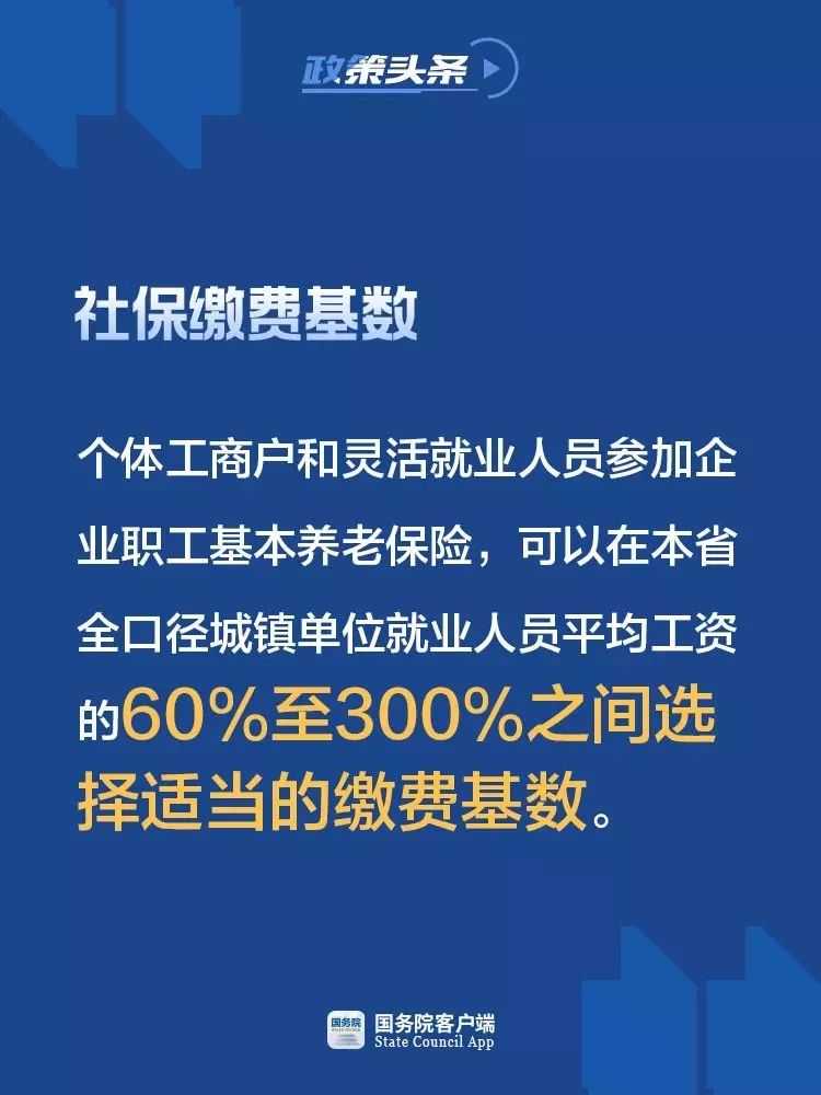 (二)完善个体工商户和灵活就业人员缴费基数政策。个体工商户和灵活就业人员参加企业职工基本养老保险,可以在全省上年度全口径城镇单位就业人员平均工资的60%至300%之间选择适当的缴费基数。具体缴费基数可设置若干档次,由省人力资源社会保障厅明确规定。