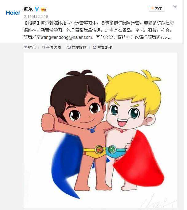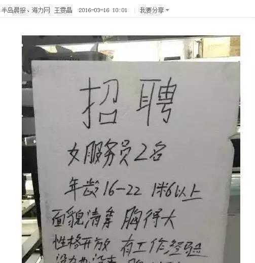 鲁网2月16情人节刚过,号称八十万官博总教头,蓝v扛把子的海尔官博,又成功的挑逗了网友。2月15日晚十点多,海尔官方微博发布了一条招聘信息。 网友不淡定了↓↓↓ 海尔官博的招聘信息里固然有故意搞笑的一面,但是也反映了如今实习生进入社会的第一步,已经从过去的打开水、拿报纸、扫地、擦桌子,变成了拿快递、订外卖! 对于这种变化,有些实习生不屑一顾,也由此引发一些用人单位的吐槽,甚至还一度成了网上热点。那些奇葩招聘条件的事件经常发生!难道老板是为了刷存在感吗? 3月14日8时许,微博网友@幸福女神丶Y发布了微博,并配发了一张图片。“招聘:女服务员2名,年龄16-22,1米6以上,面貌清秀,胸得大,性格开朗,有工作经验,没有也没事,胸大漂亮就行,工资面议,丑女勿扰。” 虽不能确认招聘启事上的条件到底是恶搞还是真实的,但该内容一上网着实引发了网友热议。 @大连突发:锅碗瓢盆都这么高端大气上档次了。 @北纬三十九度-:缺老板娘而已。 @大连54青年:胸大漂亮就行!大菜市卖文胸的吧!? @不爱我x_x就滚:胸小的还找不到工作了? 招老板娘 近日,浙江台州市人才市场的招聘布告栏里出现了一张招聘需求表,上面写着:台州市某橡胶厂招聘老板娘一位,要求38岁以内,离异带一小孩也可。报道称,这家厂子的厂长要给38岁的儿子找老婆。其儿子多年前离婚了,有个11岁的女儿。 打过群架 2015年,南京某劳务市场的现场招聘会上,一家搬家公司共招聘5个职位,但是醒目的招聘要求却看呆了众人:1、业务人员:谈过恋爱、追过女孩;2、工务主管:打过群架、背过黑锅;3、车辆驾驶:闯过红灯、逃过违章;4、搬运技工:能吃能睡,不喝就醉;5、储备干部:调皮捣蛋,蚂蚁锻炼。 擅打游戏 厦门市2015年高校毕业生人才交流大会上,一家企业招聘A股证券投资交易员时提出“擅长DOTA、CS等游戏者优先。”原因是看中他们的键盘操控能力和反应速度。