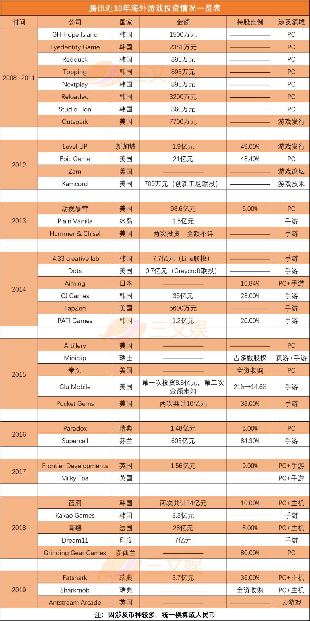 过去10年,腾讯在海外有114次投资并购,其中游戏领域有37起。 文/Dkphhh 腾讯在2019年上半年营收1742.86亿元,游戏收入558亿元,占比32%。手游收入434亿元,在游戏收入中占比77.8%。 虽然游戏收入的占比在持续降低,但依然很重要。 据报道,腾讯自2015年至2018年在文娱领域投资152次,占比最高的三大行业是游戏、影视和动漫,分别占27.63%、17.76%、15.13%。 伴随着这两年出海的热潮,我们向海外输出不仅有产品,还有资本。 腾讯过去10年在海外有114次投资并购,据我们的不完全统计,游戏领域就有37次,占比达到了32.4%。 详见下表: 腾讯投资的这37家公司里拥有游戏研发能力的公司占了绝大多数,而且足迹遍布全球几个游戏大国。最开始是游戏产业最成熟,也是中国玩家最熟悉的韩国,然后转道美国和欧洲,向传统游戏大厂抛出橄榄枝。 随着时间推移,移动浪潮的来临,腾讯从2013年开始将投资重心转移到了手游。 最近几年游戏越来越追求玩法和创新,腾讯的投资视野也转移到了单机和主机领域,投资标的也从具备一定规模的公司变成了初创团队和小公司。 Sharkmob 例如,腾讯今年刚刚收购的Sharkmob成立不到两年,还没有游戏问世,成员全部来自原来的大型3A游戏工作室。 今年腾讯投资的另一家公司AntstreamArcade则是做云游戏的,也是一家初创公司。 腾讯海外投游戏公司, 是为了玩法、IP和技术? 过去我们看腾讯投资了哪家海外公司,第一反应总是腾讯会拿下这家公司游戏的国内发行权。这种猜测有道理,但不总是事实。 其实,过去这10年,除了《英雄联盟》(拳头)、《绝地求生》(蓝洞)、彩虹六号》(育碧)、《流亡之路》(GrindingGearGames)等少数游戏,腾讯很少把被投资/收购公司的游戏引入国内市场。 而且上述游戏都集中在端游领域,腾讯引进国内的手游就更少了。2016年腾讯斥资605亿元从软银手中买下芬兰手游大厂%的股权,但Supercell旗下几款知名游戏,如《部落冲突》、《皇室战争》和《海岛骑兵》,在国内的发行公司都是昆仑万维。 这种“佛系”的投资风格也不是最近才养成的,早在网游时代,腾讯就投过《龙之谷》的制作公司EyedentityGame,但最后《龙之谷》在国内的代理却是当时腾讯最大的竞争对手之一——盛大。 那么腾讯投资这些海外的游戏公司到底图什么呢?我们总结了两点:一个是引进IP、玩法、技术这些和游戏相关的东西,第二个是拓展海外市场 腾讯确实很少引进游戏,但是过去几年腾讯推出的很多游戏IP和玩法其实都来自他们投资的海外公司。 从我们的统计情况来看,腾讯最早尝试引进玩法的一款游戏是他们在2015年推出的《头脑达人》。这款游戏的玩法其实借鉴了PlainVanilla开发的《QuizUp》。腾讯在2013年给这家冰岛公司投了2400万美元,约合人民币1.5亿元。 《QuizUp》 《QuizUp》这款游戏主打好友问答,由机器出题,然后两人竞猜,得分多者获胜。这种派对游戏的模式和腾讯的社交基因有着天然的匹配度。 所以腾讯在2015年将这个玩法引入国内,上线了《脑力达人》。现在腾讯进一步让这款游戏社交化,上线了微信小游戏版。 《脑力达人》 腾讯引进的游戏IP不多,但游戏界仅次于反恐精英的FPS游戏IP使命召唤正是通过投资正式被引入中国市场。 2013年,动视暴雪从维旺迪手上购回总价近82亿美元股份,由此动视暴雪正式成了一家独立的游戏公司,而帮助动视暴雪“赎身”的投资机构中就有腾讯的身影。 交易完成后后腾讯间接持有暴雪6%的股份,腾讯代理的《使命召唤Online》也正是在这时开启内测。今年,《使命召唤》手游也将在国内上线。 因为网易和暴雪在国内的亲密关系,很多人不懂腾讯为什么会参与这次投资。 其实,动视暴雪由动视和暴雪是两家公司组成,暴雪娱乐手上拥有魔兽、星际和暗黑这些经典的游戏IP,而动视则是以使命召唤闻名。 严格意义上讲,目前和腾讯展开长期合作的是动视,暂时还没有暴雪什么事情。 技术方面就不得不提2012年腾讯投资的EpicGame了。当时的EpicGame还没有推出《堡垒之夜》,只是一个以虚幻系列游戏引擎闻名的技术公司。因为业务基本是ToB的,所以当时估值并不高,被腾讯以21亿拿下来近半数股权。 这估计是腾讯在游戏领域投资回报率最高的一次投资。7年过去,epic的估值已经到了150亿美元,折合人民币1056亿元,拥有近半数股权的腾讯相当于拥有500亿元,是投资金额的25倍。 回报也不仅仅只有资产增值,还有实打实的技术支持。腾讯这几年推出的《和平精英》、《龙族幻想》、《王牌战士》等热门游戏使用的几乎都是EpicGame提供的虚幻4引擎。 《龙族幻想》 当然,其他公司也有用虚幻引擎打造的游戏产品,但别人用是要交版权费的,版权费按商业产品总收入的5%收取。 游戏打不开的海外市场,用投资撬开 拓展海外市场是腾讯投资海外游戏公司的另一个重要原因。 如果我们仔细观察一下,在世界范围内比较知名的几款游戏,我们就会发现几乎没有腾讯的自家产品。 端游方面,《英雄联盟》、《绝地求生》和《堡垒之夜》都是腾讯通过投资收购得来的,腾讯自家的游戏很难走出国门。 手游方面,虽然腾讯依靠庞大的中国市场,让旗下的《王者荣耀》和《和平精英》(海外叫《PUBGMOBILE》)成为世界上最赚钱的游戏之一,但这两款游戏在海外市场表现远不及国内。 尤其是《王者荣耀》,收入基本全部来自国内。《王者荣耀》的海外版叫《ArenaofValor》,