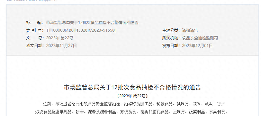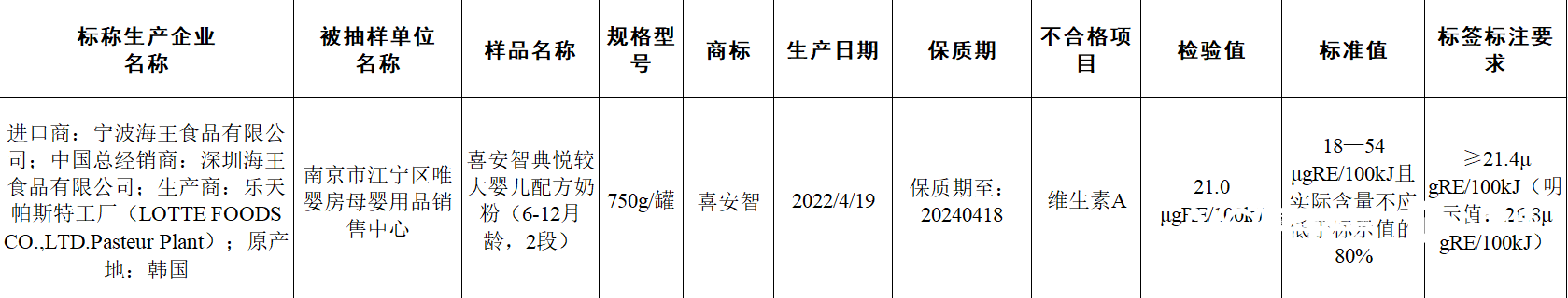 近日,国家市场监管总局公布最新一期食品抽检不合格情况通告,共有12批次产品不合格。其中,1批次广东省深圳海王食品有限公司中国总经销的、韩国乐天帕斯特工厂生产的喜安智典悦较大婴儿配方奶粉(6—12月龄,2段),被抽检出维生素A含量符合食品安全国家标准规定,但不符合产品标签标示要求。 12月5日,喜安智电商平台客服回应南都·湾财社记者称,针对该批次产品,企业已经对全国有销售的渠道进行了召回。 国家市场监管总局官网截图。 进口韩国乐天的喜安智2段奶粉抽检不合格 海王集团为其中国经销商 不合格产品信息显示,1批次喜安智典悦较大婴儿配方奶粉(6-12月龄,2段)被检出维生素A含量为21.0μgRE/100kJ,该批次产品标签明示值为26.8μgRE/100kJ,按照要求,实际含量不应低于标示值的80%(即21.4μgRE/100kJ),因此,该批次样品维生素A含量虽然符合食品安全国家标准规定,但不符合产品标签标示要求。 信息显示,该批次产品为750g/罐,生产日期为2022年4月19日,原产地在韩国,在南京市江宁区唯婴房母婴用品销售中心销售,进口商为宁波海王食品有限公司,中国总经销商为深圳海王食品有限公司,生产商为乐天帕斯特工厂(LOTTEFOODSCO.,)。 据悉,维生素A又名视黄醇,是指一类具有视黄醇生物活性的化合物及维生素A原,是人类必需的脂溶性维生素,也是婴幼儿生长发育不可缺少的微量营养素。维生素A缺乏可能引起夜盲症、干眼症等眼部症状,还可能会导致食欲减退、免疫功能低下,可能造成婴幼儿生长发育迟缓。孕妇及乳母营养补充食品、较大婴儿配方食品中维生素A含量不达标的原因,可能是原辅料用食品营养强化剂不符合质量要求;也可能是在加工或储存过程中损失;还可能是产品标签标注不规范。 喜安智客服: 已进行了召回 官方旗舰店没有销售该批次产品 12月5日,喜安智电商平台客服回应南都·湾财社记者称,经过与公司法务和销售渠道管理的同事确认,这个抽检的是2022年的商品,针对该批次产品,企业已经对全国有销售的渠道进行了召回,目前官方旗舰店没有销售这个批次的商品。 相关: 中国经销商深圳海王食品有限公司 今年曾因违法广告被罚 公开资料显示,此次涉事产品生产商乐天(LOTTE)是韩国五大集团之一,1994年进入中国市场以来,涉及食品、零售、旅游等众多领域,而喜安智是海王集团旗下唯一婴幼儿配方奶粉品牌,海王集团从2007年初起以喜安智品牌在中国大陆市场开展销售。海王集团官网显示,海王集团1989年创办于深圳,专注医药健康产业创新发展,旗下拥有两家上市公司,其中,海王生物1998年在深交所上市,海王英特龙2005年在香港创业板上市。 天眼查显示,宁波喜安智营养品有限公司(曾用名宁波海王食品有限公司)成立于2017年,为深圳海王食品有限公司全资控股子公司,后者为宁波海赢通科技有限公司全资控股子公司。信用中国官网显示,今年8月18日,深圳海王食品有限公司因发布违法广告,被深圳市市场监管局南山监管局罚款830.6元。 信用中国官网截图。 据媒体报道,在今年8月的2023奶粉大会上,深圳海王食品有限公司总经理龚华铭曾表示,海王喜安智始终坚持深耕消化吸收赛道,打造小分子奶粉,为渠道和消费者精心“定制”产品,面向C端,会为特定目标人群做定制,满足消费者的需求;对于B端,喜安智更多是和核心客户建立紧密的合作,保护渠道的合理利益。 采写:南都·湾财社记者冯家钜