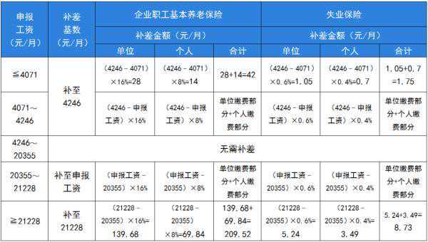 今天(8月18日)17点 成都社保开始进行批量补差 补差人群有哪些? 具体怎么补? 一起来看 ↓↓↓ 补差险种 企业职工基本养老保险、失业保险。 补差时间 2023年8月18日(星期五)17点,社保经办机构开始进行批量补差,参保单位已自行申报补差的职工不再参与批量补差。 补差人群 由社保经办机构对企业职工基本养老保险和失业保险进行批量补差,无需单位另行申报。 企业职工基本养老保险: 1.批量补差时,职工在单位处于参保缴费状态且在同一单位有1-7月期间的缴费记录(缴费基数低于4246元或申报工资高于20355元),参与批量补差。 2.2023年1月1日后以单位名义办理退休的职工,在同一单位有1-7月期间的缴费记录(缴费基数低于4246元或申报工资高于20355元),参与批量补差。 3.批量补差前已办理停保的职工不参与批量补差,如需补差由参保单位通过网上经办大厅“保底补差”或“封顶补差”模块申报补缴,参保单位也可填报《四川省社会保险费补缴申报表》到参保所在社保经办机构的柜台申报补缴。 4.批量补差前已变更参保单位的职工不参与原参保单位的批量补差,如需补差由原参保单位通过网上经办大厅“保底补差”或“封顶补差”模块申报补缴,原参保单位也可填报《四川省社会保险费补缴申报表》到参保所在社保经办机构的柜台申报补缴。 失业保险: 批量补差时,职工在单位处于参保缴费状态且在同一单位有4-7月期间的缴费记录(缴费基数低于4246元或申报工资高于20355元),参与批量补差。 补差费用缴纳 批量补差完成后,将在8月20日批量生成补差缴费单据并推送税务部门。各参保单位可在税务部门自主申报缴费或在缴纳9月社保费时一并补缴。涉及到补差的职工,如需办理停保、退休等后续业务,需先完成补差费用的缴纳。 补差标准 备注: 1.2023年1-7月已按2022年社保缴费基数下限4071元/月缴费的,2023年1-7月养老保险缴费基数、4-7月失业保险缴费基数补至4246元/月; 2.2023年1-7月已按2022年社保缴费基数上限20355元/月缴费的,2023年1-7月养老保险缴费基数、4-7月失业保险缴费基数补至申报工资(最高补至21228元/月)。 相关问题举例 某公司员工小周,1-7月申报工资5000元/月,需补差多少? 按申报工资核定缴费基数,该员工无需补差。 某公司员工小李,1-7月申报工资4000元/月,需补差多少? 小李申报工资低于2022年社保缴费基数下限4071元/月,1-7月已按4071元/月缴费,缴费基数需补至4246元/月 养老保险:〔(4246﹣4071)×16%+(4246﹣4071)×8%〕×7个月=294元 失业保险:〔(4246﹣4071)×0.6%+(4246﹣4071)×0.4%〕×4个月=7元 合计:301元 某公司员工小胡,1-7月申报工资4200元/月,需补差多少? 养老保险:〔(4246﹣4200)×16%+(4246﹣4200)×8%〕×7个月=77.28元 失业保险:〔(4246﹣4200)×0.6%+(4246﹣4200)×0.4%〕×4个月=1.84元 合计:79.12元 某公司员工小王,1-7月申报工资21000元/月,需补差多少? 小王申报工资高于2022年社保缴费基数上限20355元/月,1-7月已按20355元/月缴费,缴费基数需补至申报工资21000元/月 养老保险:〔(21000﹣20355)×16%+(21000﹣20355)×8%〕×7个月=1083.6元 失业保险:〔(21000﹣20355)×0.6%+(21000﹣20355)×0.4%〕×4个月=25.8元 合计:1109.4元 某公司员工小张,1-7月申报工资25000元/月,需补差多少? 小张申报工资高于2022年社保缴费基数上限20355元/月,1-7月已按20355元/月缴费,现申报工资仍高于2023年社保缴费基数上限21228元/月,缴费基数补至21228元/月 养老保险:〔(21228﹣20355)×16%+(21228﹣20355)×8%〕×7个月=1466.64元 失业保险:〔(21228﹣20355)×0.6%+(21228﹣20355)×0.4%〕×4个月=34.92元 合计:1501.56元