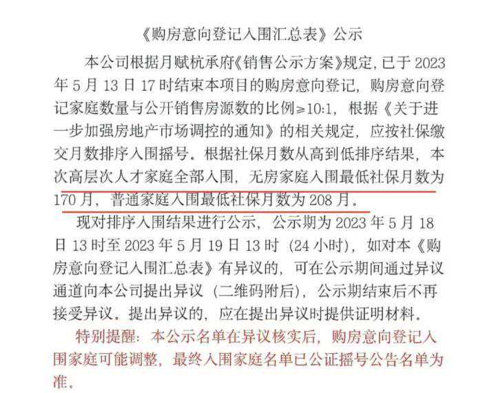 奥体板块(摄影:武恒光) 刚刚,奥体红盘月赋杭承府报名登记结果正式公布。限价4.6万/㎡,一把梭哈220套房源,入围公证摇号家庭2677户,综合中签率8.2%,需5年限售。 月赋杭承府报名登记中,高层次人才家庭全部入围,无房家庭入围最低社保170个月,普通有房家庭入围最低社保208个月,是从2006年1月份起以来的顶格社保。 这是继5月杭曜置地中心清盘后,杭州2023年诞生的第五个新房摇号“拼顶格社保”的楼盘。 同时,也是今年第五次出现“5年限售”。前四次分别是:杭州IFC(5)、杭曜置地中心(一区1、8、9-10开盘。 5月份以来,先后有澄虹府、杭曜置地中心、月赋杭承府3个红盘入市,登记结果都已公布,热度较高。 据了解,月赋杭承府一把梭哈220套房源,有4000余组家庭报名登记;同期开盘的澄虹府212套房源,2000余组报名;杭曜置地中心211套房源,4000余组报名。3个楼盘吸引上万组家庭登记报名。 随着月赋杭承府一把清盘,奥体在售项目澄虹府还有237套房源待推;待售项目中海·潮展云起,200余套可售房源,精装限价4.6万/㎡。 “转载请注明出处”