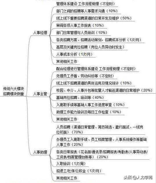 不同企业有不同的人力资源组织架构、不同的人力资源工作划分。 全文共1500字|预计阅读10分钟 很多HR新手,或者想从事HR行业的人会对HR的工作充满好奇,HR的工作对门外汉来说充满了神秘色彩。 有的人认为HR的工作就是打电话的,邀请人面试的;有的人认为HR就像警察,负责管理和调查员工;有的人认为HR就是开除员工和计算工资的,反正这俩都不是什么好人! 其实这些说法都不确切,而且还充满了很多对HR的误解。HR的工作到底是什么呢? 01 HR管理六大模块 HR——HR-HumanResource,解释为人力资源,和传统人事是有本质区别的。传统人事一般是和行政部做相类似的工作,比如招聘,培训,职员的考核,职员的薪酬,职员调动等。现代人力资源,主要通过六大模块实现企业管理。 六大模块具体是指:人力资源规划、招聘与配置、培训与开发、绩效管理、薪酬福利管理、劳动关系管理。 那么我就根据这六大模块,先大概说一下,hr每天都在干嘛。 1.招聘 招聘的日常是筛简历,打电话邀约,面试,薪酬谈判和发offer。 主要兵器就是网络,网络断了,工作就停滞了。 2.培训 培训主要就是做PPT、讲PPT,最需要的就是做好PPT。 一般来说,培训PPT的水准就是这个公司的最高水准。 3.薪酬 江湖人称大表姐,Excel高手,各种公式运用娴熟,工资表、税务表、考勤表,各种表手到擒来。 4.绩效 江湖人称B哥,Excel、Word双修高手,Excel比不上薪酬,Word胜出一筹。 为何称B哥?最有B格,公司HR管理工作的核心内容。为何是核心? 源于B哥的核心业务,便是评估员工。绩效决定了员工的工资,影响员工的职业发展。 B哥主要做的:一是员工业绩与素质的考核;二是公司的绩效制度与政策的制定;三是员工未来发展和潜力评估。 5.员工关系 员工关系的工作内容便是搞关系。 为了员工和外部搞好关系,为了公司让员工和员工搞好关系。 逢年过节发发奖品了,组织员工活动了等等都是这的活。 02 HR具体工作一览 上面只是大概让你对HR管理工作有个大概的了解,其实HR工作远远超过上述这些。 不同行业的HR工作也是不同的,按照不同行业,划分如下: i.新型互联网/通信行业 现在最流行的概念和说法便是HR三大支柱模型,分别是HRBP,SSC和HR-COE。 HRBP:人力资源服务经理(HumanResourceBusinessPartner,缩写为HRBP),负责公司的人力资源管理政策体系、制度规范在各业务单元的推行落实,切实可行的符合公司的发展目标,并协助业务部门完善人力资源管理工作,并帮助培养和发展业务单元各级干部的人力资源管理能力,对公司发展具有战略指导意义的目标。努力建立公司公众形象,完善治理结构,建立有效激励机制,为公司发展提供战略保障。 简单来说,HRBP就是HRD(HRhead)的排头兵,代言人。全权负责了各事业群的各项HR业务,属于小HRD,在HR领域里面属于高大上的职位。市场上丰富的HRBP选手,年薪达到100万的还是很多的。 HR-SSC:共享服务中心(SharedServiceCenter共享服务中心) HR标准服务提供者,确保服务交付的一致性,提供标准化、流程化的服务,使主管和HR从操作性事务中释放出来,提升HR整体服务效率。 基本就是HR管理工作中的各项实务操作,如果你起步就进入了SSC,那么很遗憾,基本你就到天花板了。因为SSC都是重复性工作,如工资计算答疑、年假查询答疑等,含金量不是很高。但是如果你是希望稳定,那么这是个不错的选择。 升职加薪相对落后,但是作为起步职位门槛低。 HR-COE:COE是CenterofExpertiseorCenterofExcellence的缩写,意思是说HR领域的专家。主要是制定,设计制度,流程和方案,提供全球方案标准,并进行管理。与HRBP合作推广新方案并实施。在专业领域对HRBP提供技术支持。 COE属于战略层面角色,负责统筹总公司和各子公司政策、流程、方案一致性,并运行风险管控,属于专家级别。学习法律,数学,统计等人才可以尝试往这方向发展。 ii.传统行业工作如下 传统行业的架构还是比较侧重于招聘及人事这一块的。当然不同企业有不同的人力资源组织架构、不同的人力资源工作划分,这些只是给想进入HR行业的朋友们做些参考。 想进入HR行业的朋友们,收藏学起来吧,HR行业比较热门,工资还是很高的哦! -END- 作者|人力学苑编辑部