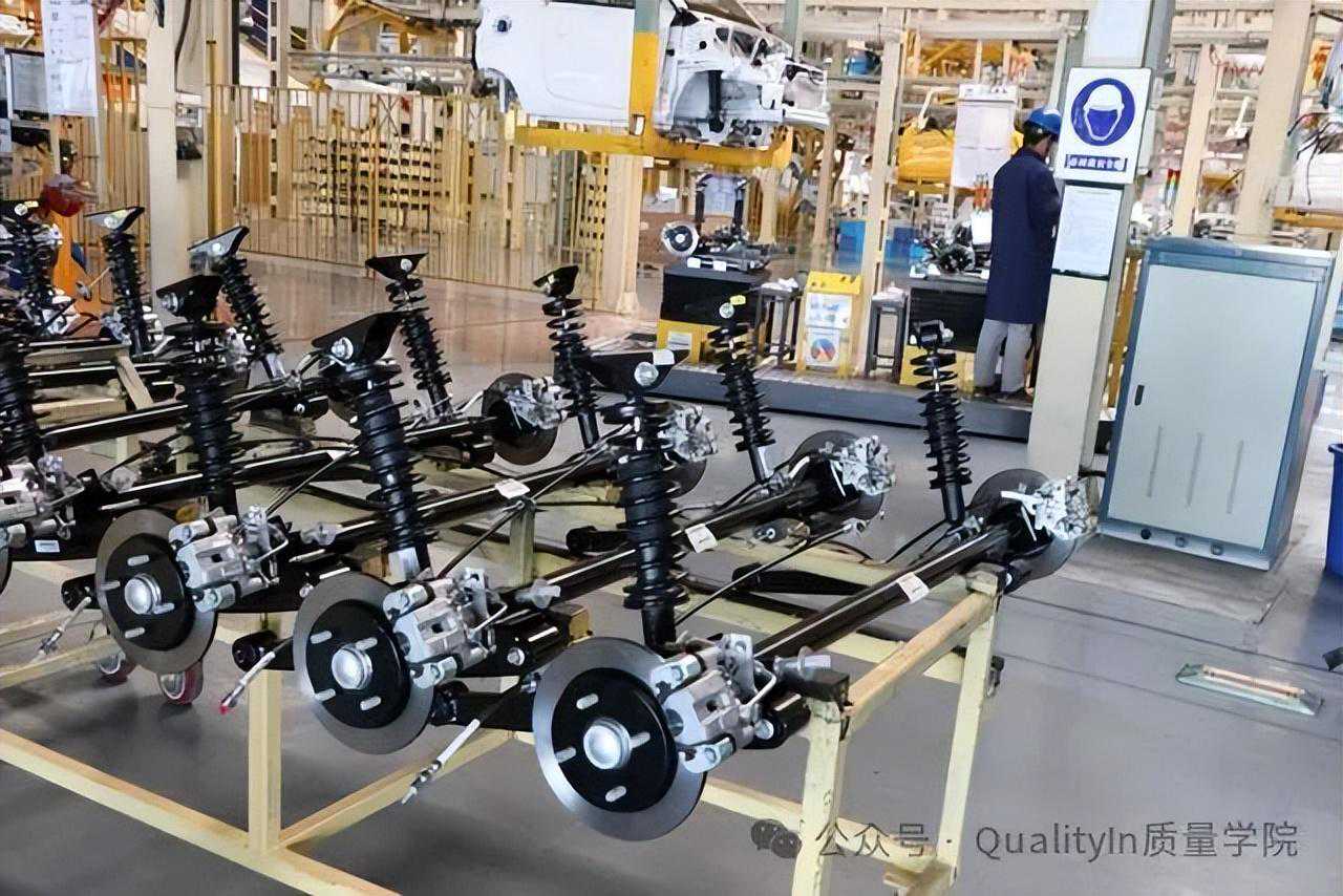 底盘装配是将发动机、变速箱、悬架、刹车等部件组装成底盘总成,然后与车身进行组合。