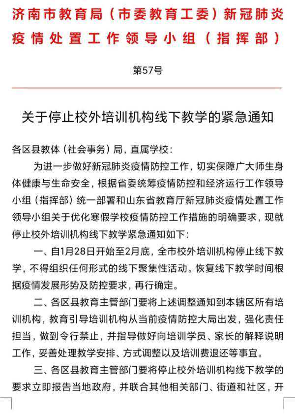 济南市教育局下发最新通知,按照全省统一要求,自1月28日至2月底,济南全市校外培训机构暂停线下教学,何时恢复等候通知。 通知要求,各县区教育部门要通知到辖区内所有培训机构。引导培训机构从当前疫情防控大局出发,做到令行禁止。并指导做好培训学员、家长的解释说明工作,妥善做好教学安排、方式调整以及培训费退还等事宜。同时,公布监督联系人和举报电话。对违规线下培训的机构,证件齐全的可给予停止招生、办学等处罚,证件不全的,将会同有关部门联合执法,予以坚决取缔。 关于停止校外培训机构线下教学的紧急通知 各区县教体(社会事务)局,直属学校: 为进一步做好新冠肺炎疫情防控工作,切实保障广大师生身体健康与生命安全,根据省委统筹疫情防控和经济运行工作领导小组(指挥部)统一部署和山东省教育厅新冠肺炎疫情处置工作领导小组关于优化寒假学校疫情防控工作措施的明确要求,现就停止校外培训机构线下教学紧急通知如下: 一、自1月28日开始至2月底,全市校外培训机构停止线下教学,不得组织任何形式的线下聚集性活动。恢复线下教学时间根据疫情发展形势及防控要求,再行确定。 二、各区县教育主管部门要将上述调整通知到本辖区所有培训机构,教育引导培训机构从当前疫情防控大局出发,强化责任担当,做到令行禁止,并指导做好向培训学员、家长的解释说明工作,妥善处理教学安排、方式调整以及培训费退还等事宜。 三、各区县教育主管部门要将停止校外培训机构线下教学的要求立即报告当地政府,并联合其他相关部门、街道和社区,开展日常督查。要通过多种渠道公布督查联系人和举报电话,对举报线索第一时间响应,第一时间查处,第一时间通报。对不听劝阻违规线下开课的机构,证照齐全的可给与停止招生、停止办学、年检等次不合格、吊销办学许可证等处罚,证照不全或无证办学的要会同市场监管部门采取联合执法等手段和措施,予以坚决取缔。 四、全市各中小学校要通过班级群等方式告知学生和家长不再参加校外培训机构的线下培训,根据学校的寒假工作要求合理安排好学习。 寒假期间,市教育局将把培训机构是否停止线下教学列入学校安全和疫情防控大排查大整改的检查内容,一并对区县各项工作落实情况进行督查。 济南市教育局新冠肺炎疫情 处置工作领导小组 2021年1月27日