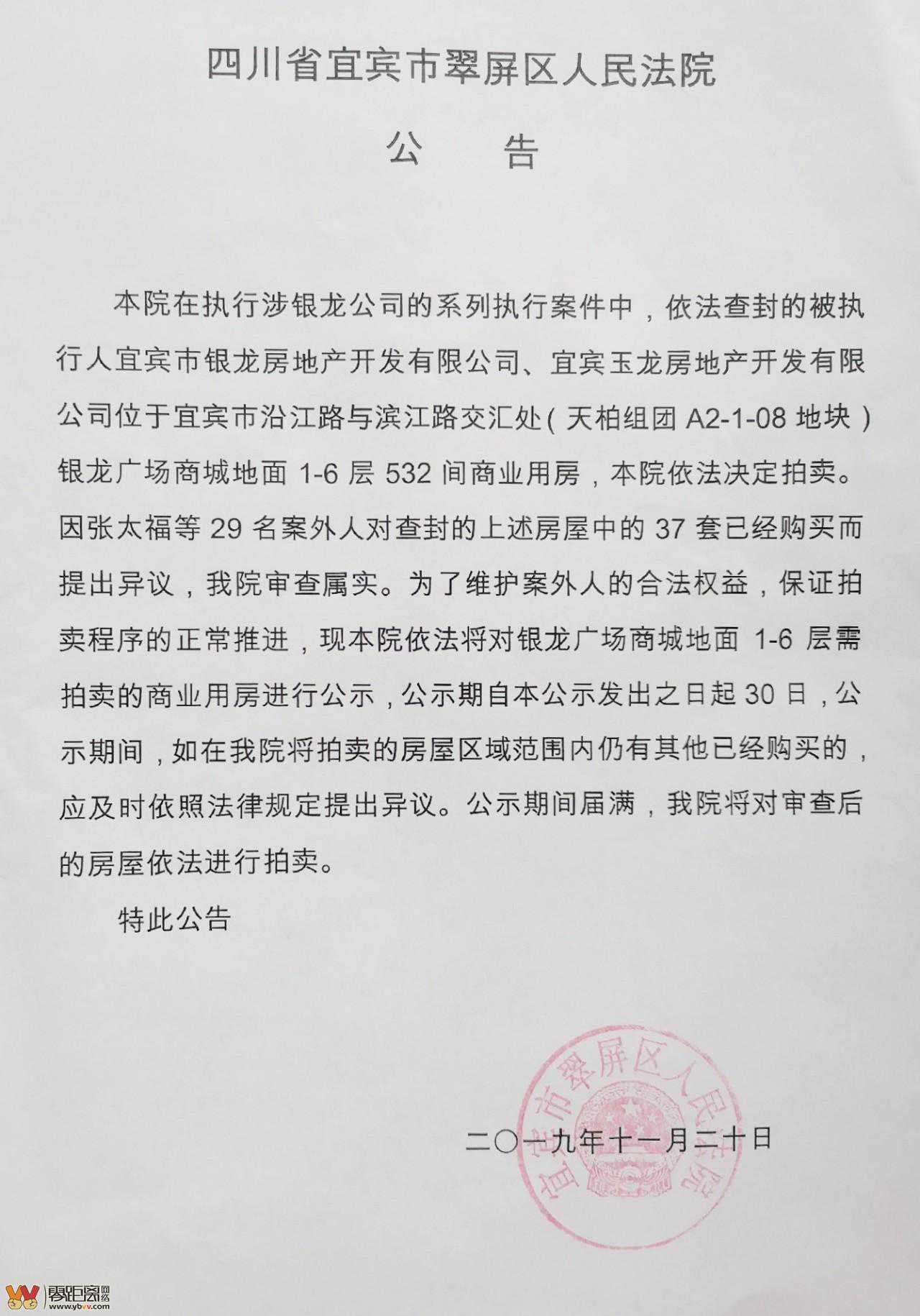 本院在执行涉银龙公司的系列执行案件中,依法查封的被执行人宜宾市银龙房地产开发有限公司、宜宾玉龙房地产开发有限公司位于宜宾市沿江路与滨江路交汇处(天柏组团A2-1-08地块)银龙广场商城地面1-6层532间商业用房,本院依法决定拍卖。因张太福等29名案外人对查封的上述房屋中的37套已经购买而提出异议,我院审查属实。为了维护案外人的合法权益,保证拍卖程序的正常推进,现本院依法将对银龙广场商城地面1-6层需拍卖的商业用房进行公示,公示期自本公示发出之日起30日,公示期间,如在我院将拍卖的房屋区域范围内仍有其他已经购买的,应及时依照法律规定提出异议。公示期间届满,我院将对审查后的房屋依法进行拍卖。