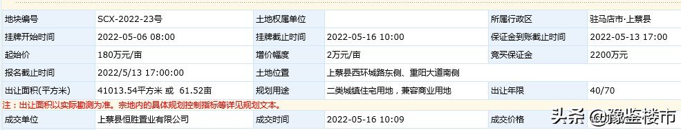 5月16日,驻马店市上蔡县城区西南位置两块商业、两块住宅用地,东南位置1块住宅用地进行网上拍卖,溢价成交,全部被国企上蔡县城市建设投资开发有限公司的两个子公司竞得,每亩地价均为182万元,楼面地价分别是两个地块为910元/㎡、两个地块为1365元/㎡、1个地块为1240元/㎡。 21号地块成交信息 21号地块宗地图 SCX-2022-21号地块:位于上蔡县西环城路东侧、重阳大道南侧,出让面积为4578.77平方米(折合6.87亩),土地用途为商业用地,土地使用权出让年限为40年,规划容积率为1.6-3.0,规划建筑密度不大于50%,建筑限高不高于40米,绿化率不低于25%。挂牌起始价为180万元/亩。 21号地块以182万元/亩成交,成交金额为1250.34万元,楼面地价为910元/㎡,被上蔡县恒胜置业有限公司竞得。该公司为国企上蔡县城市建设投资开发有限公司的子公司。 22号地块成交信息 22号地块宗地图 SCX-2022-22号地块:位于上蔡县西环城路东侧、重阳大道南侧,出让面积为3006.6平方米(折合4.51亩),土地用途为商业用地,土地使用权出让年限为40年,规划容积率为1.6-3.0,规划建筑密度不大于50%,建筑限高不高于40米,绿化率不低于25%。挂牌起始价为180万元/亩。 22号地块以182万元/亩成交,成交金额为820.82万元,楼面地价为910元/㎡,被上蔡县恒胜置业有限公司竞得。 23号地块成交信息 23号地块宗地图 SCX-2022-23号地块:位于上蔡县西环城路东侧、重阳大道南侧,出让面积为41013.54平方米(折合61.52亩),土地用途为二类城镇住宅用地兼容商业用地,商业建筑面积不得超过总建筑面积的10%,土地使用权出让年限为商业40年、住宅70年,规划容积率为1.6-2.0,规划建筑密度不大于35%,建筑限高不高于40米,绿化率不低于35%。挂牌起始价为180万元/亩。 23号地块以182万元/亩成交,成交金额为11196.64万元,楼面地价为1365元/㎡,被上蔡县恒胜置业有限公司竞得。 24号地块成交信息 24号地块宗地图 21号至24号地块在地图上的大致位置 SCX-2022-24号地块:位于西环城路东侧、龙岗六路北侧,出让面积为39467.84平方米(折合59.2亩),土地用途为二类城镇住宅用地兼容商业用地,商业建筑面积不得超过总建筑面积的10%,土地使用权出让年限为商业40年、住宅70年,规划容积率为1.6-2.0,规划建筑密度不大于35%,建筑限高不高于40米,绿化率不低于35%。挂牌起始价为180万元/亩。 24号地块以182万元/亩成交,成交金额为10774.4万元,楼面地价为1365元/㎡,被上蔡县恒胜置业有限公司竞得。 从地图上看,21号、22号、23号、24号4个地块均位于西环城路以东、重阳大道以南、龙胜大道以西区域,周边有上蔡县森林公园、蔡明园、上蔡县第十小学等。 25号地块成交信息 25号地块宗地图 25号地块在地图上的大致位置 SCX-2022-25号地块:位于上蔡县宋相路东侧、蔡都大道南侧,出让面积为5723.04平方米(折合8.58亩),土地用途为二类城镇住宅用地兼容商业用地,商业建筑面积不得超过总建筑面积的10%,土地使用权出让年限为商业40年、住宅70年,规划容积率为1.6-2.2,规划建筑密度不大于28%,建筑限高不高于60米,绿化率不低于30%。挂牌起始价为180万元/亩。 25号地块以182万元/亩成交,成交金额为1561.56万元,楼面地价为1240元/㎡,被上蔡县善基置业有限公司竞得。该公司为国企上蔡县城市建设投资开发有限公司的子公司。 从地图上看,25号地块周边有上蔡县思源实验学校、恒春医院、上蔡第二高级中学新校区、金居府等。