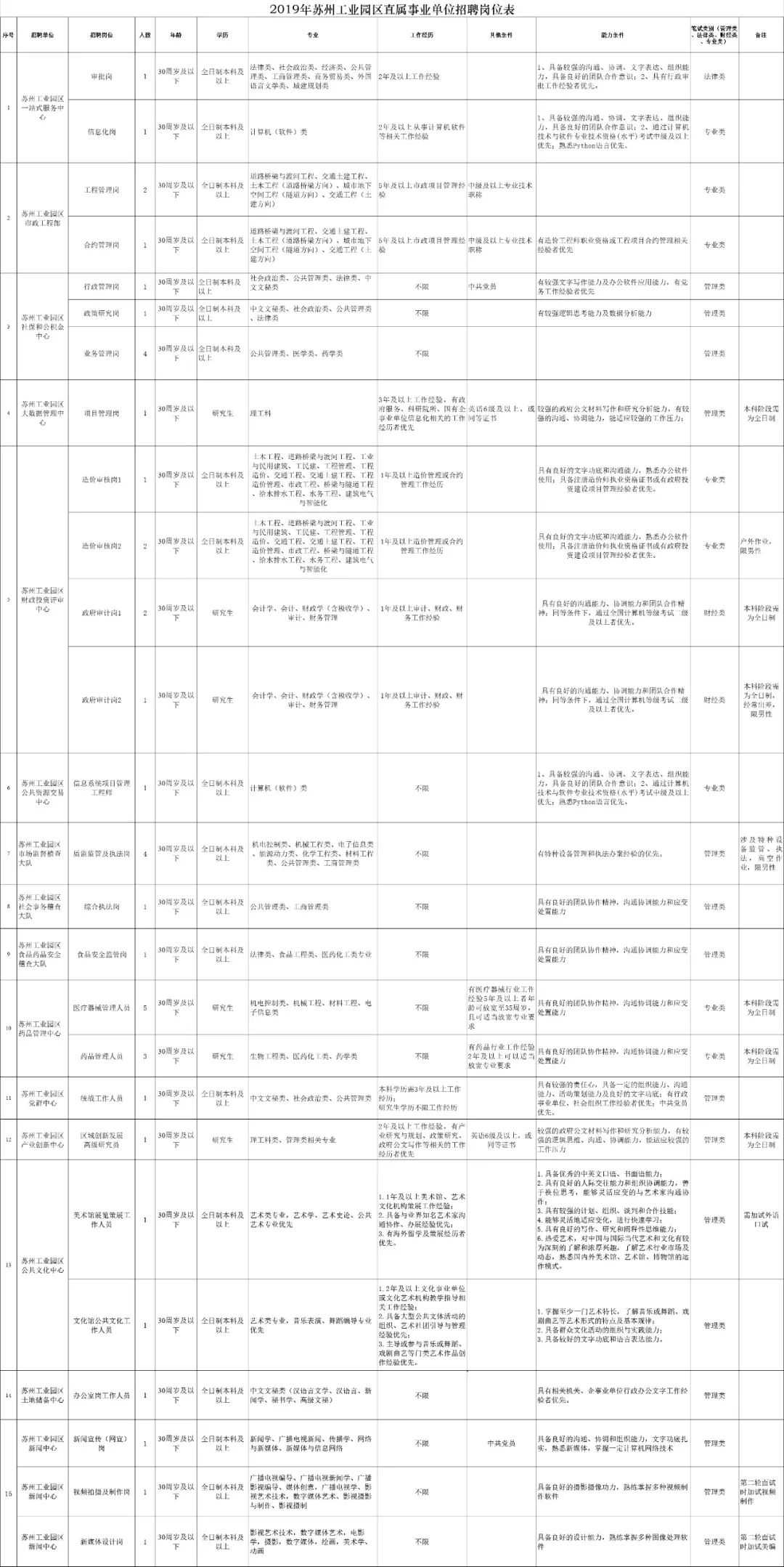 前几天,小鱼给大家分享了 市属卫生事业单位 市教育直属学校等 单位的招聘的讯息 现在 园区管委会 及部分直属事业单位 公开招聘啦! 苏州工业园区党工委、管委会为苏州市委、市政府派出机构,因工作需要,园区管委会机关现面向社会公开招聘业务骨干,欢迎勤勉、敬业的有识之士加盟。具体如下: 01招考对象及相关要求 1.具有中华人民共和国国籍,遵纪守法,品行端正,无犯罪记录,具有正常履行岗位职责必备的身体条件和招聘岗位所规定的具体资格条件。 2.学历是指具有国家承认的学历,归国留学人员需有教育部留学服务中心出具的相应学历学位证明。 3.年龄说明:30周岁及以下(1989年12月5日及以后出生),35周岁及以下(1984年12月5日及以后出生)。 4.工作经历的要求,是指截止2019年12月5日前,在各类机关和企事业单位的累计工作经历。灵活就业、个体经营人员视为具有工作经历,其工作经历时间自登记灵活就业并审批确认或营业执照颁发之日起算。具体工作经历以人力资源和社会保障部门出具的社保缴费清单为依据。 5.应届毕业生是指2020年8月毕业的学生。 02招聘程序 1.报名 有意应聘者请登陆以下网址进行网上报名: 进行网上报名,并在线提交个人身份证明、学历学位证明(归国留学人员需在正式录用报到前提供国家教育部留学服务中心出具的《国外学历学位认证书》)、应届生就业推荐表、外语等级证书、相关资格证书等所需材料。报名截止时间为2019年12月16日17:00前。恕不接待来人。此招聘信息同时发布在圆才网站()--“热门职位”中。 本次考录笔试的开考比例为1:6。报名结束后,达不到开考比例的职位,由园区组织部按规定的程序办法核减考录计划,直至取消该职位。报考被取消职位的人员,可重新改报其他符合条件的职位。改报时间可顺延至:2019年12月18日17:00。 2.笔试 (1)笔试形式:笔试采用闭卷形式。 (2)笔试内容:主要测试英语、公文写作以及专业相关知识,笔试不设范围。 3.面试、心理测试、外语口试 面试共有两轮,其中第一轮参照结构化形式,第二轮为访谈形式。根据笔试成绩按得分高低排序,按计划选聘人数1:6的比例确定参加第一轮面试、心理测试和外语口试的人选;第一轮面试后,笔试成绩占50%、面试成绩占40%、口试成绩占10%,按总分高低排序,按计划选聘人数1:3的比例确定参加第二轮面试的人选。 二轮面试结束后,按笔试、一面、口试成绩占60%,二面成绩占40%折算分数,成绩以百分制计算,设合格分数线为60分。分数保留2位小数,第3位小数按“四舍五入”处理。在合格线以上按分数高低排序确定进入体检人员名单,如有同分,按照笔试、一面、口试成绩总分,取高分者。 外语口试与第一轮面试同一天进行;心理测试在第一轮面试后一天举行,心理测试成绩仅作为参考不计入面试总分。 4.体检政审 对最终面试合格人员,按照拟选聘人数1:1的比例从高分到低分确定参加体检人员。体检标准按《公务员录用体检通用标准(试行)》执行,体检费用自理,对体检合格者,园区组织部按规定对其进行政审。因体检、政审不合格出现缺额时,在报考同一岗位的人员中,按成绩排名从高分到低分一次性递补。经考试、体检合格拟录用人员信息面向社会公示7个工作日。公示结果不影响聘用的,由园区组织部(人事局)审批后,委托园区人力资源公司办理具体录用手续。 03其他 报考者须对照本简章规定的选聘条件如实申报,在整个选聘过程中,一经发现不符合规定的,则取消选聘资格,责任自负。报考者一旦被聘用,须按《录用通知》到,如与原单位发生人事(劳动)争议等事项,均由本人负责协商解决。 04招聘岗位、人数及条件 详见下表 查看表格 另外,苏州工业园区一站式服务中心等15家直属事业单位现面向社会公开招聘工作人员,所聘人员实行企业合同管理,参加企业职工社保,退休后实行企业职工养老待遇。具体如下: 01招考对象及相关要求 1.具有中华人民共和国国籍,遵纪守法,品行端正,无犯罪记录,具有正常履行岗位职责必备的身体条件和招聘岗位所规定的具体资格条件。 2.学历是指具有国家承认的学历,归国留学人员需有教育部留学服务中心出具的相应学历学位证明。 3.年龄说明:30周岁及以下(1989年12月5日及以后出生),35周岁及以下(1984年12月5日及以后出生)。 4.工作经历的要求,是指截止2019年12月5日前,在各类机关和企事业单位的累计工作经历。灵活就业、个体经营人员视为具有工作经历,其工作经历时间自登记灵活就业并审批确认或营业执照颁发之日起算。具体工作经历以人力资源和社会保障部门出具的社保缴费清单为依据。 5.应届毕业生是指2020年8月毕业的学生。 02招聘程序 1.报名 有意应聘者请登陆以下网址进行网上报名: 并在线提交个人身份证明、学历学位证明(归国留学人员需在正式录用报到前提供国家教育部留学服务中心出具的《国外学历学位认证书》)、应届生就业推荐表、外语等级证书、相关资格证书等所需材料。报名截止时间为2019年12月16日17:00前。恕不接待来人。此招聘信息同时发布在圆才网站()--“热门职位”中。 本次考录笔试的开考比例为1:4。报名结束后,达不到开考比例的职位,由园区组织部按规定的程序办法核减考录计划,直至取消该职位。报考被取消职位的人员,可重新改报其他符合条件的职位。改报时间可顺延至:2019