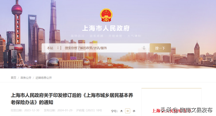 上海市对《上海市城乡居民基本养老保险办法》进行修订完善,新修订的《办法》自2024年5月1日起实施。