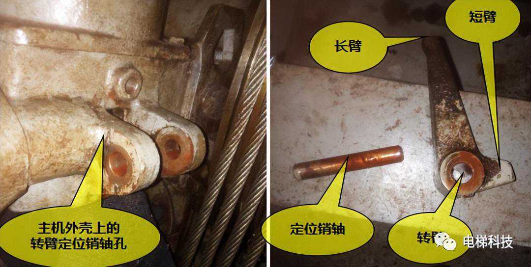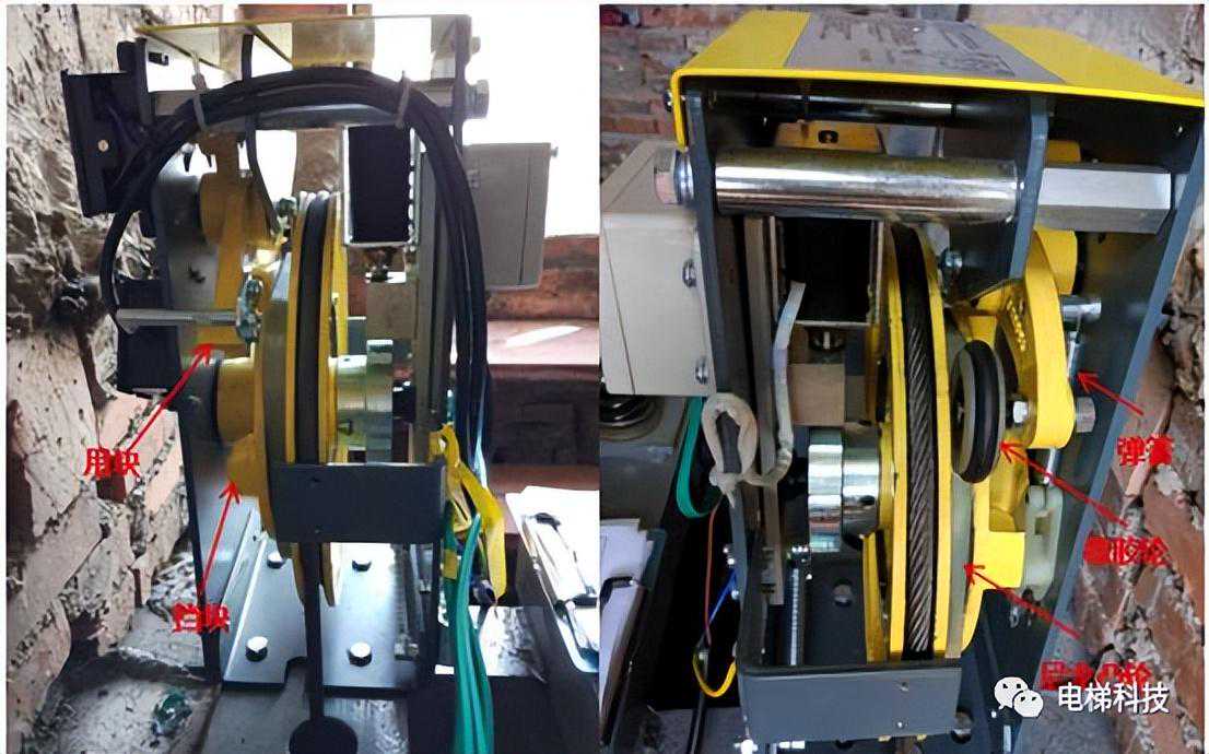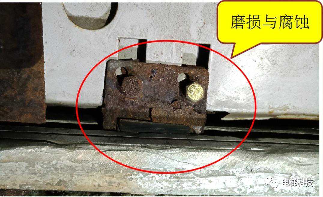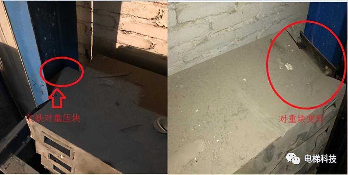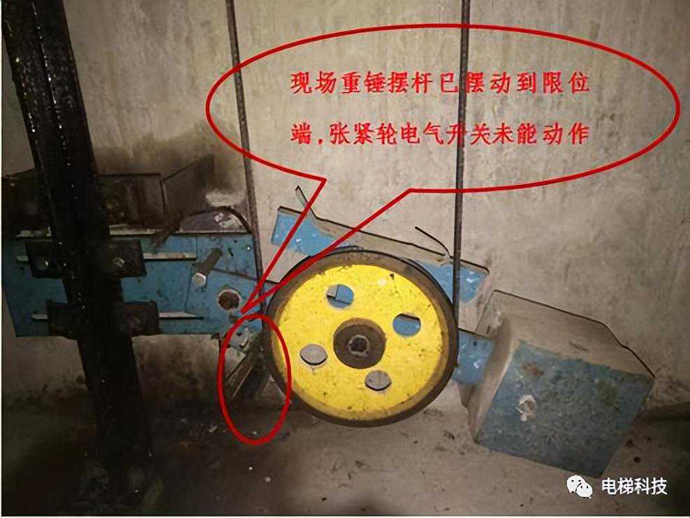 目录 一、曳引主机及制动器风险案例 案例一:电梯曳引主机制动器销轴卡阻案例 案例二:电梯曳引轮严重磨损案例 案例三:电梯曳引轮蜗轮磨损断齿案例 二、紧急救援装置风险案例 案例四:电梯手动紧急操作装置失效的案例 案例五:私自加装电梯应急平层装置致变频器损坏案例 案例六:电梯自动救援装置故障风险案例 案例七:电梯紧急电动运行失效案例 案例八:电梯轿厢意外移动保护装置失效案例 案例九:无机房电梯电动松闸装置缺陷案例 三、井道及相关装置风险案例 案例十:一起限速器-安全钳试验失效案例 案例十一:铁钉穿透线路PV管短接电梯对重缓冲器案例 案例十二:电梯液压缓冲器失效案例 案例十三:电梯限速器的张紧轮电气开关安装错误案例 案例十四:无机房电梯机械锁定装置安装位置不正确的案例 案例十五:多台电梯用井道的隔障防护不符合要求案例 案例十六:电梯对重块严重损坏案例 四、轿门与层门风险案例 案例十七:电梯层门锁未安装接地保护线的案例 案例十八:轿门门锁失效案例 案例二十:电梯层门导向滑块缺失案例 案例二十一:电梯层门欠缺防脱槽板案例 案例二十二:电梯层门锁限位螺杆缺失案例 案例二十三:电梯层门及其导向装置严重腐蚀与磨损案例 01 案例一:电梯曳引主机制动器销轴卡阻系统风险报告 2019年3月1日,珠海某物业管理服务有限公司一台电梯向下运行至5楼时突然失控下滑至底坑,造成电梯内8名乘客被困,1人受轻伤的事故。经现场技术勘查和重复试验,并对制动器进行拆解,确认制动器转臂定位销轴卡阻,是导致本次事故的主要原因。 事故发生后,珠海检测院在珠海市全市范围内开展紧急普查,并最终确认某电梯公司生产的两个系列曳引主机,制动器关键部件普遍存在“易受到锈蚀和油渍影响、故障状态不明显、维护工作要求高”等三方面的系统性风险。两个系列主机涵盖了该电梯公司生产的9个系列型号电梯。 经查,电梯维保单位未掌握该款主机的维护工作要求,且主机出现故障时状态并不明显,未经过专门培训的维保人员和检验人员,非常容易忽视,需引起监管部门以及行业的高度重视。 一、安全隐患情况 (一)现场设备情况 涉事电梯为曳引式乘客电梯,额定载重量:1000kg,额定速度:1.6m/s,曳引轮直径:620mm,配套6条复合型绳槽,配套使用直径12mm的曳引钢丝绳,电梯主机型号为2471(见图1),制造厂家为上海某电梯有限公司,制造日期:2002年10月。 图1曳引主机铭牌 该主机属于下置式蜗轮蜗杆曳引主机,配备立式电磁制动器(见图2)。 图2曳引主机 二、问题原因及风险分析 (一)事故原因 造成事故的主要原因是:该电梯曳引机立式制动器(见图3)转臂定位销轴锈蚀卡阻,造成制动器无法实施有效的制动动作。另外,制动器制动轮、制动衬垫均存在油渍污染(见图4),进一步使制动器制动性能恶化,最终造成电梯轿厢失速下滑事故。 (二)风险分析 据该立式制动器的工作原理,电磁线圈通电时,动铁芯在电磁场作用下向下移动,通过顶杆推动转臂的长臂,使转臂以支点为中心向外转动,实现短臂推动顶杆螺栓,克服制动弹簧的预紧力,使得左右两组制动臂张开,带动制动闸瓦张开,达到“松闸”的效果。 图3立式制动器示意图 图4制动轮工作面与制动闸瓦、衬垫 电磁线圈断电时,制动弹簧预紧力通过制动臂,一方面带动顶杆螺栓推动转臂的短臂,进而推动动铁芯恢复原位;另一方面通过连接螺栓,压迫制动闸瓦和制动衬垫紧密、均匀地贴合在制动轮工作面,通过摩擦力的作用使得制动轮维持停止状态,达到“上闸”的效果。 一旦转臂定位销轴出现锈蚀卡阻时,电磁力作用于转臂的长臂,能够实现推动转臂转动,从而打开制动器。但上闸时制动弹簧的预紧力是作用于转臂的短臂,无法克服销轴内部的卡阻力,转臂无法转动(注:力矩杠杆不一样,见图5),使得制动器制动闸瓦和制动衬垫未能紧密、均匀地贴合在制动轮工作面,导致电梯出现“松闸飞车”的溜梯现象。 图5事故电梯转臂定位销轴及转臂 由于转臂转动动作非常轻微,故障状态非常不明显,难以察觉,未经过专门培训的维保人员甚至检验人员,非常容易忽视该风险。 根据事故电梯使用单位提供的厂家《电梯使用维修保养说明书》、《电梯安装使用维护说明书》,其“维修保养要领”中关于制动器部件的润滑要求为轴销处应灵活,可用机油润滑(详见附件2、3)。而根据事故后该电梯公司提供的《曳引机制动器维护作业要领》(内部受控文件,详见附件4),对于制动器部件的润滑,需要使用3种规格不同的润滑油。制造厂家未向使用单位移交该款主机的正确的维护保养技术资料,导致维保人员不能掌握正确的维护保养方法。另外,维保人员在发现制动力不足后,仅是简单通过预紧制动弹簧来缓解故障情况,未真正解决该隐患。 三、防范措施 (一)制造厂家向社会公开发布该款主机制动器《曳引机制动器维护作业要领》的维护、调试指导文件,加强对相关维保单位的宣讲、培训。 (三)相关维保单位要严格按照《电梯维护保养规则》(TSGT5002-2017)第六条要求和该电梯公司型号主机制动器的《曳引机制动器维护作业要领》要求,在半月、季度、半年等维保过程中,对电梯进行清洁、润滑、检查、调整,更换不符合要求的易损件,保证制动器的性能。电梯维保单位应按照《电梯维护保养规则》“年度维护保养项目(