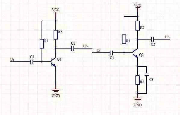 我们在学习和生活中,通常会用到许多三极管放大电路,但也有好多人傻傻分不清放大器的类型,比如笔者就是这样的人,今天就对放大器类型做一个简单总结。 应用情况: 3种放大器中,共发射极放大器应用最为广泛,在各种频率的放大系统中都有应用,是信号放大的首选电路。 共集电极放大器由于它的输入阻抗大,输出阻抗小这一特点,主要用在放大系统中起隔离作用,比如说做多级放大系统中的输入级,输出级和缓冲级,使得放大器的前级电路和后级电路之间的互相影响减到最小。 共基极放大器具有高频特性优良,所以主要用在工作频率比较高的电路。 放大器类型判断方法: 通过三极管接法进行判断,可以知道它的放大类型及特性。 原理:放大器有一个输入回路,一个输出回路,每个回路需要有两个引脚,而三极管只有三个引脚必然有一个引脚被输入输出公用,比如共用发射极就是共发射极放大器。 方法:放大器的地线是电路中的共用参考点。所以三极管的这根引脚应该交流接地,只要看出三极管的哪个引脚交流接地就可以知道是什么类型的放大器。 1 共发射级放大器 (共发射级放大器) 如上图所示,电路中Q1发射极直接接地,Q2中发射极通过电容C3接地,因为C3的容量较大,对交流信号的容抗很小而呈通路,这样对交流信号而言就是发射极相当于接地,所以这个是共发射极放大器。 从电路可以看出,三级管的基极和集电极不接地,输入信号从基极与地之间输入到三极管中,将输入信号从三极管的集电极与地之间输出简单说成从集电极输出。 2 共集电极放大器 (共集电极放大器) 集电极接直流电源+V,对交流而言+V端等效接地(C1将+V端交流接地),所以三极管集电极接地,是共集电极放大器。交流信号是从基极输入(基极与地之间输入),信号从发射极输出(发射极与地之间输出)。发射极与地之间不能接入旁路电容,否则放大器交流短路,无信号输出。 3 共基极放大器 基极通过旁路电容C2交流接地,这样基极被共用,所以这是共基极放大器。交流信号从发射极输入(发射极与地之间输入),集电极输出(集电极与地之间输出)。 (基极放大器)
