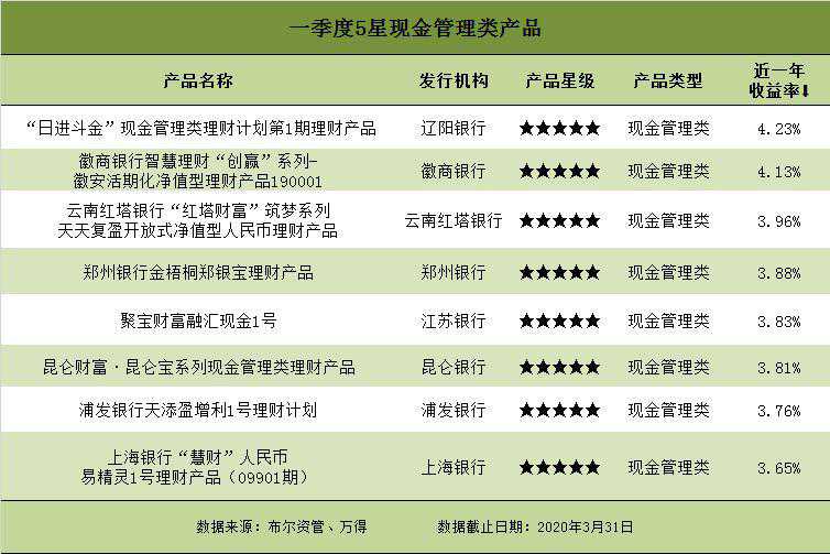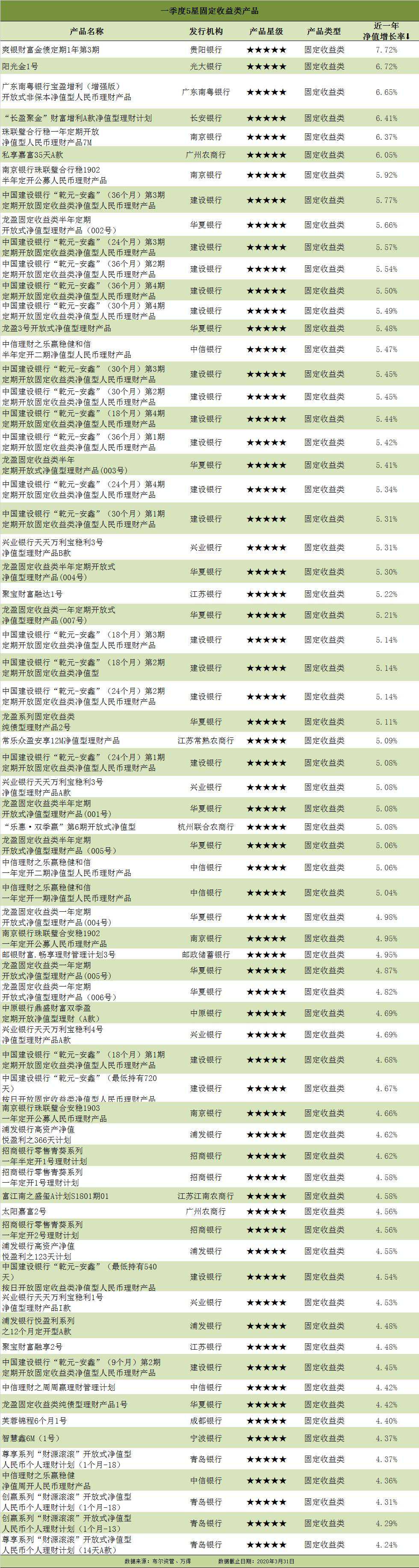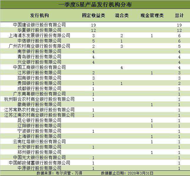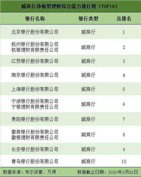 新华网北京(陈剑)中证金牛金融研究中心21日发布2020年第一季度净值型银行理财综合能力评价排名和开放式净值型银行理财产品评价结果。 从评价结果看,招商银行(招银理财)、工商银行(工银理财)、兴业银行(兴银理财)分列全国性银行前三名,共有28家银行的88只净值型产品获金牛理财5星评价。 该评价体系由中国社科院金融法律与金融监管研究基地提供学术支持,新华网财经频道和中证金牛金融研究中心每季度联合发布结果。 招商银行、北京银行、重庆农商行分列三类银行第一名 一季度净值型银行理财综合能力排名是以截至2020年3月31日数据为基础,对199家净值型银行理财产品发行机构进行的综合评价。评价采用定量和定性相结合的方法,从产品规模、产品业绩、信息披露、产品丰富度等角度进行。 从排名结果看,招商银行(招银理财)、工商银行(工银理财)、兴业银行(兴银理财)分列全国性银行前三位,北京银行、杭州银行(杭银理财)、江苏银行分列城商行类前三位,重庆农商行、江苏江南农商行、广州农商行分列农商行类前三位。 全国性银行中,排名前十的银行还有中信银行、上海浦东发展银行、中国银行(中银理财)、华夏银行、建设银行(建信理财)、农业银行(农银理财)和光大银行(光大理财)。 城商行中,排名前十的还有南京银行、上海银行、宁波银行(宁银理财)、贵阳银行、徽商银行(徽银理财)、长安银行和青岛银行。 农商行中,排名前十的还有杭州联合农村商业银行、广东顺德农村商业银行、贵阳农村商业银行、江苏苏州农村商业银行、江苏张家港农村商业银行、青岛农村商业银行、无锡农村商业银行。 88只净值型理财产品获5星评价 净值型银行理财产品评价是以截至2020年3月31日的近一年数据为基础,从风险调整后收益、业绩稳定性两个角度,对存续期内的开放式固定收益类理财产品、混合类理财产品进行评价,从收益能力和收益稳定性两个角度对现金管理类理财产品进行评价。 本期符合参评条件的开放式净值型银行理财产品共有440只,其中,固定收益类产品345只,混合类产品52只,现金管理类产品43只。由于本期持续运行超过1年期的权益类产品总数不到10只,因此未进行权益类产品评价。 评价结果显示,共有28家银行的88只产品获金牛理财5星评价。其中固定收益类产品69只,混合类11只,现金管理类8只。 一季度获评5星产品的28家发行机构为:建设银行、华夏银行、浦发银行、中信银行、广州农村商业银行、南京银行、青岛银行、兴业银行、工商银行、江苏银行、招商银行、贵阳银行、成都银行、广东南粤银行、杭州联合农村商业银行、徽商银行、江苏常熟农村商业银行、江苏江南农村商业银行、昆仑银行、辽阳银行、宁波银行、上海银行、云南红塔银行、长安银行、郑州银行、光大银行、邮政储蓄银行、中原银行等。 获评5星的69只固定收益类产品包括:建设银行的乾元-安鑫系列19只产品,华夏银行的龙盈系列12只产品,中信银行周周盈、乐赢稳健系列的5只产品,南京银行珠联璧合系列的4只产品,青岛银行的尊享/创赢系列“财源滚滚”4只产品,兴业银行天天万利宝稳利系列4只产品,浦发银行悦盈利系列3只产品,招商银行零售青葵系列3只产品,广州农商行嘉富系列2只产品,江苏银行的聚宝财富融达1号和融享2号2只产品,成都银行的芙蓉锦程6个月1号,广东南粤银行的宝盈增利(增强版),贵阳银行的爽银财富金债定期1年第3期,杭州联合农商行的乐惠·双季赢第6期,江苏常熟农商行的常乐众盈安享12M,江南农村商业银行的富江南之盛玺A计划S1801期01,宁波银行的智慧鑫6M(1号),长安银行的“长盈聚金”财富增利A款,光大银行的阳光金1号,邮储银行的畅享理财管理计划3号,中原银行的鼎盛财富双季盈定期开放净值型理财(A款)。 获评5星的11只混合类产品包括:工商银行的尊享系列开放式净值型(股票精选主题)、成长精选系列、中证中票100指数型、平衡精选系列的4只产品,广州农商行的私享嘉富/稳富系列的3只产品,浦发银行的星辰系列之多策略3号和股权直投创富一号,贵阳银行的爽银财富-混合型养老理财第1期,中信银行的尊享系列环保精选净值型人民币专户理财等。 获评5星的现金管理类产品包括:江苏银行的聚宝财富融汇现金1号、上海银行“慧财”人民币易精灵1号理财产品(09901期)、浦发银行的天添盈增利1号、辽阳银行的“日进斗金”现金管理类第1期、云南红塔银行的“红塔财富”筑梦系列天天复盈开放式净值型人民币理财产品、郑州银行的金梧桐郑银宝理财产品、徽商银行的智慧理财“创赢”系列-徽安活期化净值型理财产品190001和昆仑银行的昆仑财富·昆仑宝系列现金管理类理财产品。 银行理财子公司逆势新发产品数量环比增加44% 受春节假期和疫情影响,2020年第一季度理财产品发行数量环比减少,有200家商业银行及理财子公司共发行公募净值型理财产品3812只,环比下降4.39%。 据布尔资管调研统计,截至2020年3月31日,存续公募净值型理财产品10955只,净值型银行理财产品余额超过11万亿元。 一季度新发产品中,开放式产品占比12.59%,封闭式产品占比87.41%。从产品的投资类型来看,新发产品以固定收益类为主,占比92.21%,混合类产品占比6.79%,权益类产品占比1.00%,无商品及金融衍生品类产品。 但值得一提的是,单从理财子公司看,新发产品
