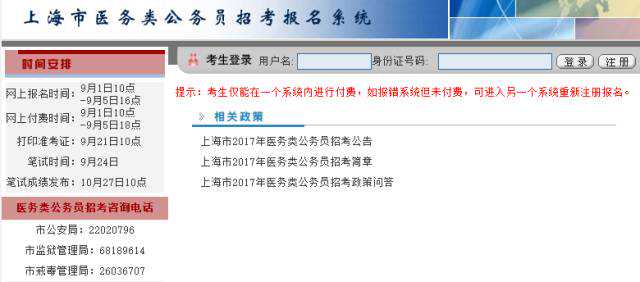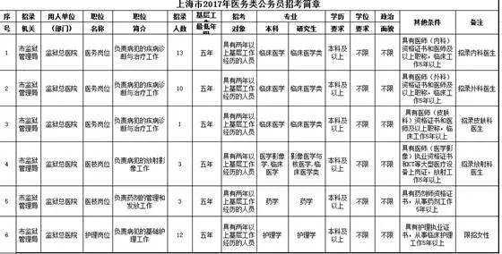 有兴趣报考公务员的朋友注意啦! 上海市委组织部、市人社局、市公务员局决定面向社会公开招录92名医务类公务员,其中上海市监狱总医院招录42名,涉及内科、外科、皮肤科、放射科和护理岗位等,顺利入职后,可获得监狱人民警察和医生双重身份呢…… 今天开始报名,赶紧加入我们!! 接下来是详细介绍 2017年|秋 有兴趣报考监狱总医院的朋友们注意啦:医务类民警招录工作正式开始啦!9月1日10:00至9月5日16:00可登录报名。9月24日笔试,科目为申论、行政职业能力测试。 如何报名? “上海市2017年医务类公务员招考网上报名” 相关招考简章和政策详情请见网页附件 此次上海市监狱总医院招录医务类民警42人,包括医务、医技和护理人员。 我们欢迎您的加入 关于我们 上海市监狱总医院坐落于 浦东新区周浦镇繁荣路478号, 是一家司法行政机关性质的特殊医疗机构, 也是全市政法系统最大的综合性医院, 主要承担全市政法系统在押人员的 监管医疗保障任务。 医院占地170余亩, 建筑面积3万余平方米, 现有病床450张,民警体检床位100张, 医院设施设备先进,工作条件良好, 是上海市市级机关文明单位, 先后获得上海市人民满意的公务员集体、 市五一劳动奖状等多项荣誉称号。 医院工作人员既是拯救灵魂的工程师, 又是救死扶伤的白衣天使, 享受监狱人民警察、国家公务员待遇。 竭诚欢迎 有志于监狱医疗卫生事业的卫生专业人才 加入上海市监狱管理局监狱总医院! (局人事处、监狱总医院供稿) 朱喆唐小卓林中楠出品