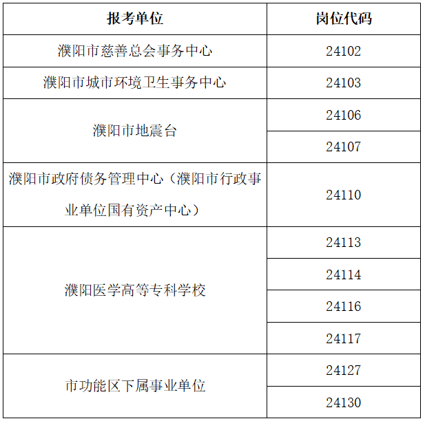 2024年濮阳市市直事业单位 公开引进高层次和急需紧缺人才笔试 和直接进入面试岗位的公告 根据《2024年濮阳市市直事业单位公开引进高层次和急需紧缺人才公告》,结合岗位、报名、资格初审情况,在按照有关规定核减、核消部分岗位的基础上,现将笔试和直接进入面试的岗位公告如下: 一、笔试岗位 二、直接进入面试岗位 咨询电话: 市委组织部: 市人力资源和社会保障局: 报名技术支持电话: 监督电话: 驻市委组织部纪检监察组: 驻市人力资源和社会保障局纪检监察组: 中共濮阳市委组织部 濮阳市人力资源和社会保障局 2024年2月26日 初审:王晖 终审:史瑞红