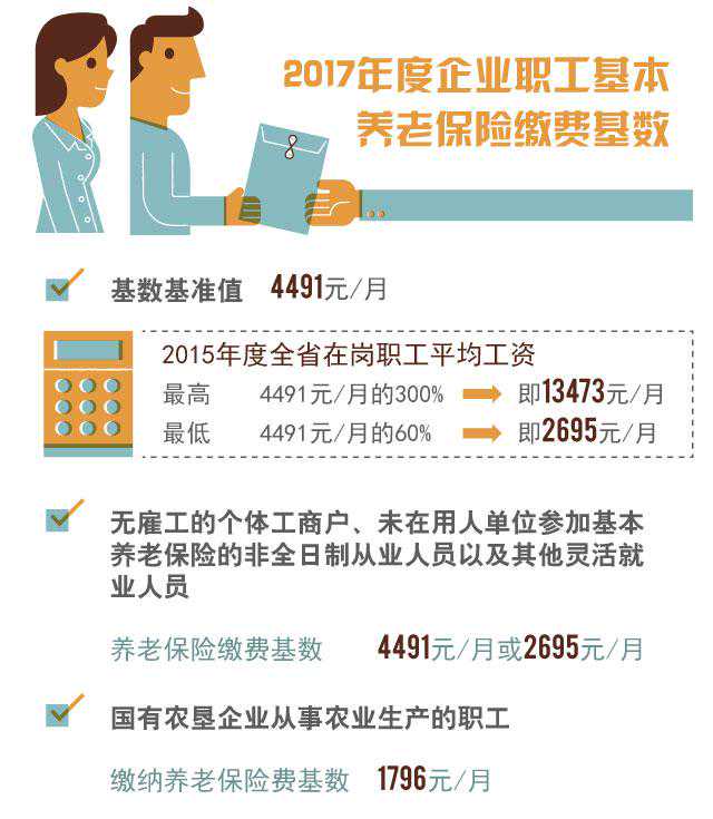 2017年湖南省的职工社保如何缴费?退休待遇又依据哪个标准计算?时刻新闻记者获悉,湖南省社会保险管理服务局日前下发通告,就2017年度企业职工基本养老保险缴费和待遇计发等有关问题进行了说明。 企业职工养老保险缴费基数最高13473元,最低2695元 今年,省政府确定2017年度企业职工基本养老保险缴费基数基准值为2015年度全省在岗职工平均工资,也就是4491元/月。据此,2017年度企业职工个人缴纳养老保险费的基数不得高于4491元/月的300%,即13473元/月;也不得低于4491元/月的60%,即2695元/月。参保单位即日起即可申报职工个人2017年度缴费工资和单位缴费工资总额。 对于无雇工的个体工商户、未在用人单位参加基本养老保险的非全日制从业人员以及其他灵活就业人员,2017年缴纳养老保险费的基数为4491元/月或2695元/月,由个缴人员自愿选择。 省社保局明确,按政策规定已纳入基本养老保险的国有农垦企业(包括撤场建区、管理区、乡镇的原国有农垦企业)从事农业生产的职工缴纳养老保险费的基数为1796元/月。 退休待遇暂按2015年度月平均工资标准计算 对于新增退休人员待遇的计发,省社保局文件明确,2017年度缴费指数计算使用的上年度全省在岗职工月平均工资为4491元/月。 在2016年度全省在岗职工月平均工资公布前,2017年新增退休人员计发待遇时所用全省在岗职工月平均工资暂以4491元/月为准,待2016年度全省在岗职工月平均工资公布后,再重新计算并多退少补。