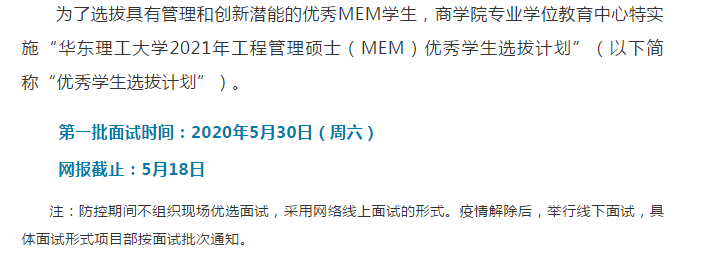 2020研究生调剂系统正式开通,这意味着2020考研即将落幕,2021考研人要开始备考了,在此之前,小编想和大家聊一聊MEM的哪些事儿 01、MEM百科知识 什么是MEM MEM是工程管理硕士(MasterofEngineeringManagement)的缩写,MEM是一个新兴的学科,它将工程技术、经济学和管理科学融为一体,有着学科交叉性和实际应用性的特征,旨在为现代重大工程事业打造复合型高端管理人才。 2019年MEM发展改革变化 MEM的报考条件(2019年前) 1、拥护中国共产党的领导、愿意为社会主义现代化建设服务,品德良好,遵纪守法。 2、具有国家承认学历的大学本科毕业学历的人员。 3、大学本科毕业后有3年或3年以上工作经验的人员;大专毕业后有5年或5年以上工作经验的人员;已获硕士学位或博士学位并有2年或2年以上工作经验的人员。 4、身体健康状况符合规定的体检标准。 但是在2019年的时候,MEM有了重大改革: 变化一: 拆分原工程管理硕士(125600)。设立工程管理(125601)、项目管理(125602)、工业工程与管理(125603)、物流工程与管理(125604)四个招生领域。 注:其中125601对应于原来MEM;125602对应于原项目管理;125603对应于原工业工程领域;125604对应于原物流工程领域。 变化二: 工业工程与管理(125603)、物流工程与管理(125604),自2020级起在5年试点期间可以招收应届生(包括推免和全国联考)。 注:报考125601和125602依然需要满足本科毕业3年,专科毕业5年,硕士毕业2年的硬性要求;重点是125603,125604,自2020级开始,5年内允许应届(本科)毕业生报考。 MEM与MBA有什么不同 报考人群 MBA(工商管理硕士)主要是面向企业的综合管理岗位设置的研究生专业,旨在培养商业领袖,解决的是企业中的经营管理问题。 MEM(工程管理硕士)主要培养技术+管理复合型人才,培养的是产业化的领袖,解决的是工程中的管理问题。 课程设置不同 MBA目标是培养高质量的职业经理人,课程设置涉及到企业管理的方方面面。 如市场营销、公司运营、财务管理、人力资源管理、战略管理等等,还有创业、金融等等很多热门的特色方向课程设置。 MEM目标是培养的兼具管理和技术的复合型人才,注重向学生提供对核心管理领域知识的理解。 如市场、会计、组织行为、商业道德、法律及金融等;以及专业类如系统工程、全面质量管理、生产管理、产品设计和过程设计管理等;更多的以实际工程项目问题、技术管理进行集成的方向。 例如清华工程管理硕士学科的课程设置,紧密结合行业实际,以模块的方式进行设置,力求工程与管理的最佳结合,既有管理类的核心课程,也有工程技术方面的专业领域课程,还有行业特色模块,培养跨领域复合的π型管理人才。 π型课程设置模型 MEM考试内容是什么 试卷总共300分,分两门 (1)管理综合试卷满分为200分,考试时间为180分钟。 (2)英语试卷满分为100分,考试时间为180分钟。 02、MEM为什么值得报考? 1、学历提升 就读MEM可以颁发教育部认可的研究生学历证书和研究生学位证书,解决了很多项目管理人员被学历因素制约的瓶颈。并且,MEM支持全日制与非全日制两种培养方式,更好的满足不同学生的学习需要。 2.涉及范围广 MEM项目本身涉及方向极广,例如,清华大学MEM教育中心就包含能源与环境管理、设计与制造管理、信息管理(云计算、互联网)、标准化管理(iso,iec标准)、建设管理方向、研发与创新管理6个方向。 北京大学软件与微电子学院有创新工程管理、互联网金融、金融科技、人工智能4大方向。 近年来,报考MEM的同学除了来自传统的工程单位外,越来越多的来自华为、小米、格力、海尔等现代化企业,甚至有很多大型的互联网公司也越来越欢迎工程管理领域人才。 3.学费相对较低 2020年清华MEM项目学费16.8万(非全日制),北京大学MEM项目2019年的学费13.8万(非全日制)、9.8万(全日制),以不到20万的学费就可以获得这些名校的研究生学历,绝对是值得的。此时清北的MEM学费,相当于2011年左右清北的MBA的学费。 MEM以其独特的优势,快速得到市场认可,吸引了越来越多的考生报考,学费也会随之涨高。所以趁MEM的热度还未达到目前MBA的空前高度,要好好把握机会! 4.提前面试机会 2013年,北大工学院MEM开始实施提前面试;2015年,北大软微学院MEM也开始实施提前面试;2016年,清华MEM中心5月份成立,接着就实施了提前面试。 相对而言,MEM提前面试难度可能并没有MBA那么大,以后伴随着报考人数增多,难度也会逐年递增,这也是我们经常督促大家早点准备的原因。 5.专业性强 MEM的定位是“技术+管理”,部分院校的招生简章会明确表示“最好具有工科背景”,但MBA基于纯企业管理,较适合追求企业综合管理但无技术背景的考生。如果你原本具有技术背景、项目管理等基础,对于从事互联网、房地产、基建以及交通运输等行业的职场人而言,MEM的学习性价比更高。 南水北调、高铁网络、港珠澳大桥……支撑起这些瞩目成就的不仅是高端的技术和强大的制造力,工程管理的人才在实施过程中更是发挥着至关重要的作用,所以说,MEM有着广阔的未来。 03、2021MEM前面试汇总 上海交大材料科学与工程学院 面试时间 详情请看: 上海交大材料科学与工程学院20201MEM提面申请通知 同济大学 面试时间 申请方法 同济大学2021年工程管理硕士(MEM)优秀学员选拔计划即日起接受申请。所有申请人都必须通过网站,按要求提交申请资料。 详情请看: 同济大学MEM提面发