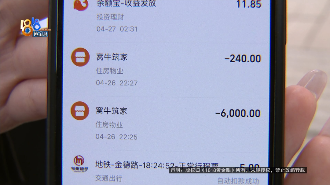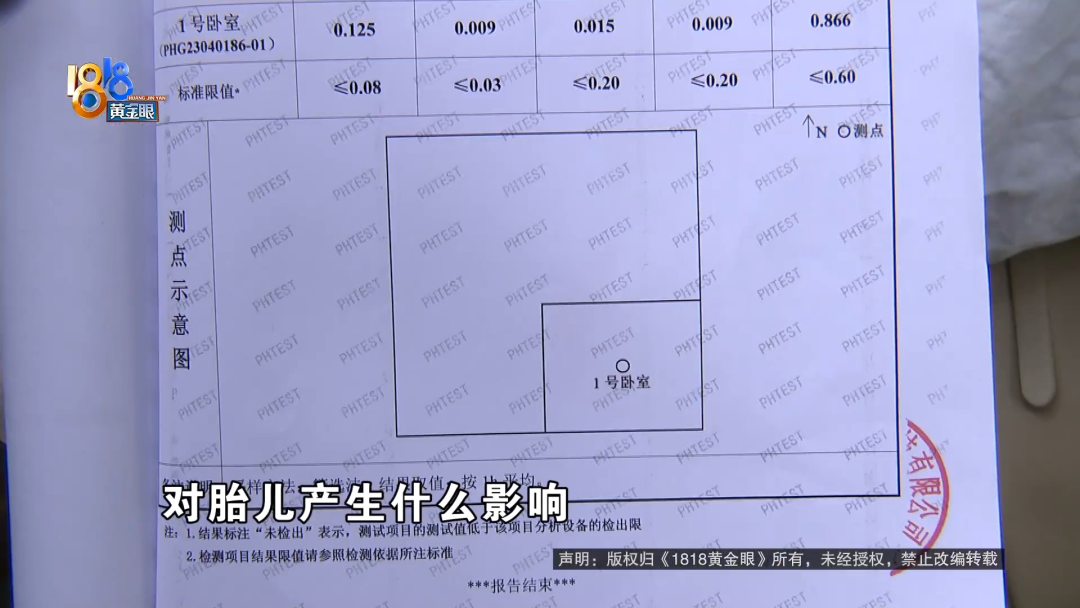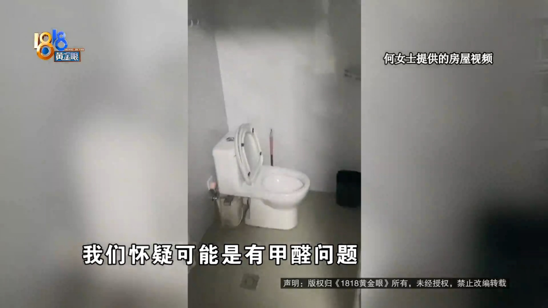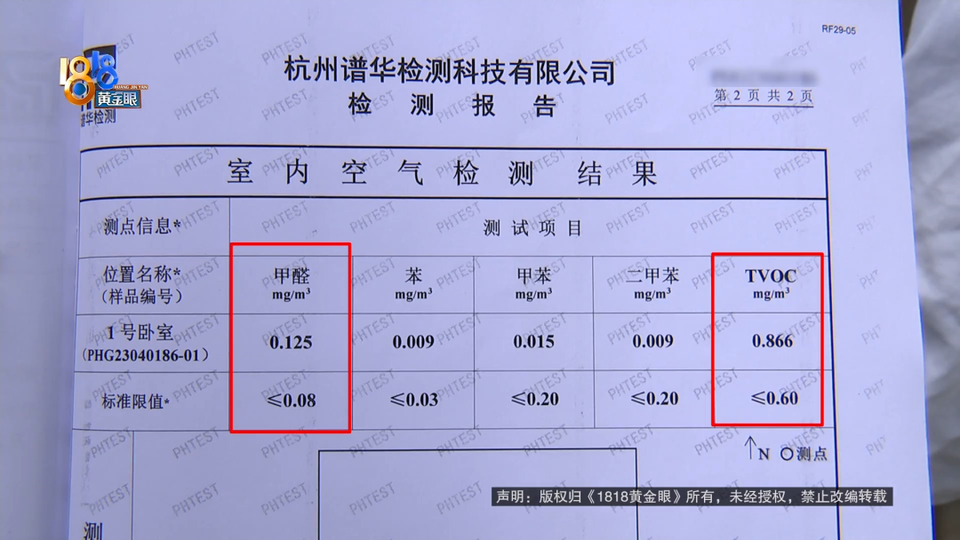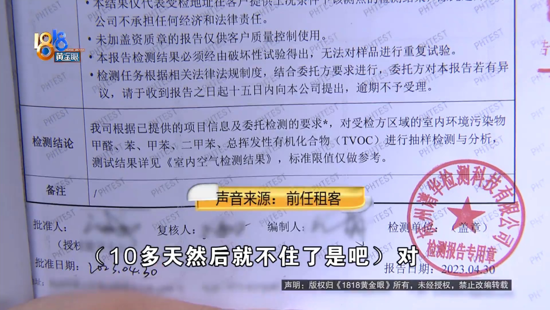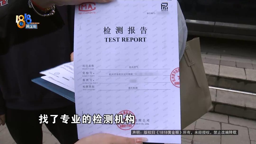 4月份,何女士在网上看到有人转租房子,接手了过来。说是一进屋,她丈夫就觉得身体不舒服,这段时间,他们还正好在备孕。 【1818黄金眼】怀疑出租屋甲醛超标中介:个人体质问题 何女士:我们是4月25日,在闲鱼上找到前一个租客,我们觉得房子还可以,26日来中介这边签合同。我们签合同的过程中,有问他这个房子,是否存在甲醛问题,他说没有。因为是我老公感觉不舒服,我们签完合同以后,去房间拿钥匙,在那里再待了一会儿,还是觉得有点不太舒服,我们怀疑可能是有甲醛问题。 与何女士签约的,是杭州窝牛筑家房产信息咨询有限公司。她租的房子位于余杭区运河锦庭二区,租赁期从2023年5月1日到2023年10月24日,押金4000元,月租金2000元,按月支付。何女士说,她还支付了240元服务费,可钱交完以后,才发现房子有点不对劲。 何女士:刚开始怀疑是,也可能不是甲醛,是房子周围灰尘什么的。 何女士的丈夫:人感觉喉咙不舒服,我们出于对身体的考虑,我们还是决定去做一个甲醛测试。 何女士:找了专业的检测机构,4月28日去检测这个房子,上门检测的,出具的这个检测报告上面显示,它的甲醛还有TVOC是超标的。 前任租客:住的时候感觉到头晕,住了10多天。 记者:10多天然后就不住了是吧? 前任租客:对。 记者:什么原因呢? 前任租客:在里面住着就感觉到,有点头晕。 记者:你有没有往甲醛超标这个方向去想呢? 前任租客:没有,我没考虑到这点。 何女士委托了杭州谱华检测科技有限公司来上门检测,检测样本取自卧室。何女士说,检测前将房间封闭了14小时,取样时间为45分钟。检测报告封面有CMA中国计量认证标志,里面写着,甲醛的检测数值是0.125,参考指标限值为0.08,TVOC即总挥发性有机化合物的检测数值0.866,参考标准限值为0.6。拿到报告后,何女士向“窝牛筑家”提出解约,并出具了一份租赁合同解除通知书,上面写着,房屋内甲醛严重超标,影响了承租人的健康和安全,现解除合约,并要求退还已支付的款项,予以赔偿。 何女士:我拿着报告去找到他们这家店,让他给我退租金和押金,还有那个服务费,总共6240元,他说不退,他的房子没有甲醛问题,但是我的报告显示,他的房子就是有问题的,并且我的人是感觉,身体不舒服的,我们是刚结婚,是新婚,现在是备孕阶段,如果住甲醛超标的房子,万一之后怀孕,对胎儿产生什么影响,那这怎么办? 何女士的合同是在“窝牛筑家”万科拱宸店签订的,后勤管理归万家名城店负责。找到万家名城店,负责人吴店长不在,记者拨通了电话,在得知来意后,对方直接挂断了。再找到万科拱宸店,负责签约的赵店长出面进行了沟通。 杭州窝牛筑家万科拱宸店赵店长:不算是从我们手里租的,我们前租客通过自己转租、带看、一系列的交割都是他们自行完成的,双方同意的,我们就签署这个合同,因为这个房子,首先今年第三年了。 记者:三年为什么还会? 杭州窝牛筑家万科拱宸店赵店长:就很正常,要是你们自己装修,别说三年,到五年,它都会有一点。你只要去测,肯定都会有一点超标,这属于正常,可能每个人体质不一样。